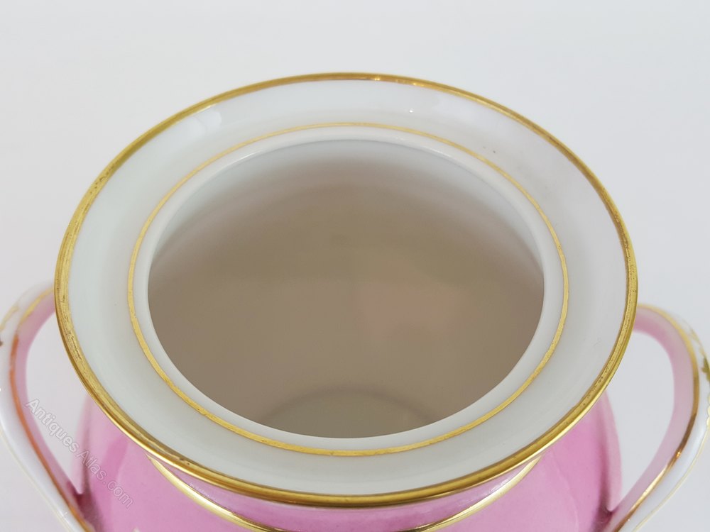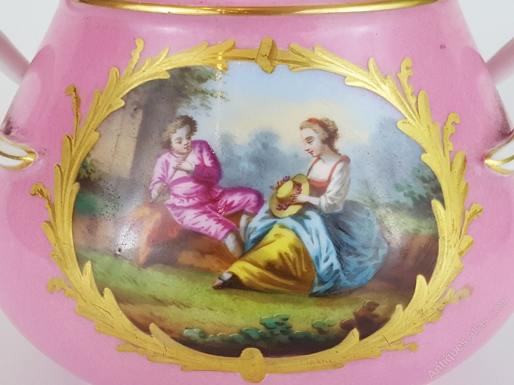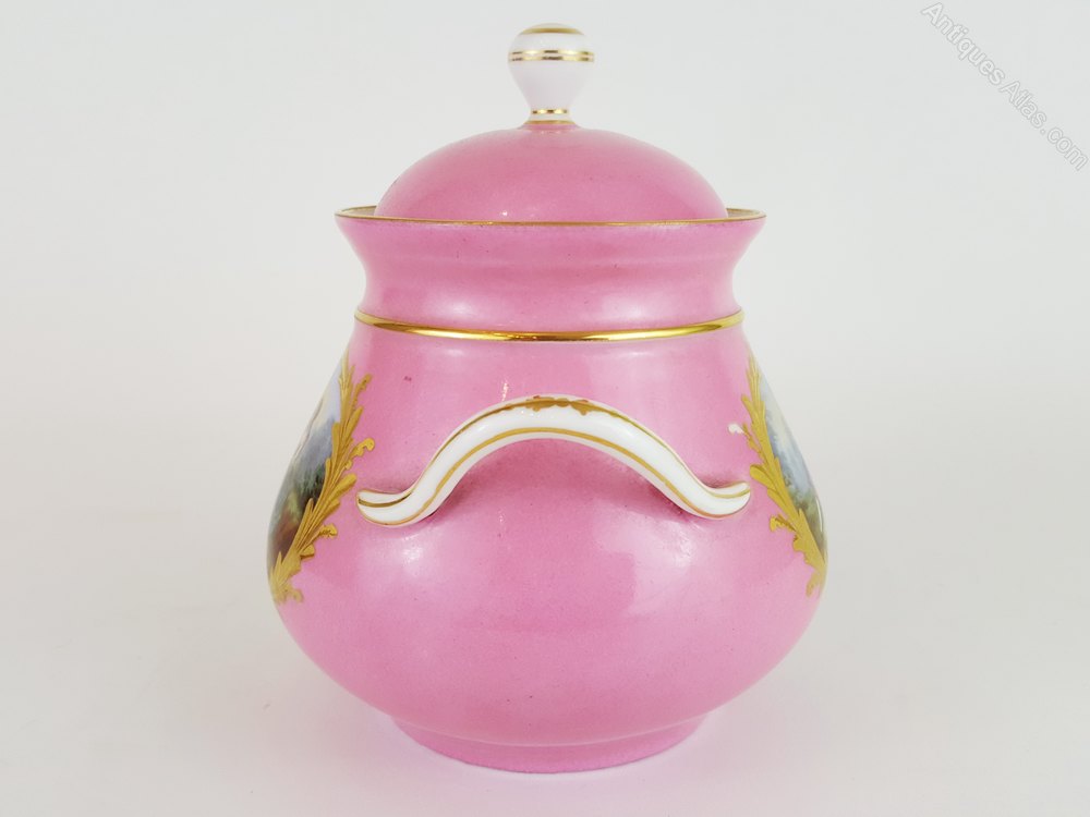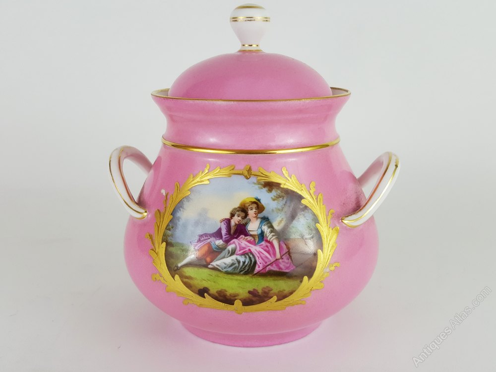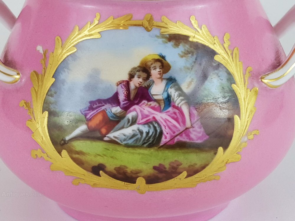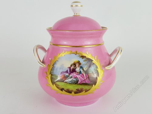 19th century French serve type two handle bowl, the main body is painted with a vibrant pink, with panels to the front & rear, with gilt frame with paintings of couples in countryside, with gilt on both handles and on the lid.Please look at all my pictures as they are part of my description.