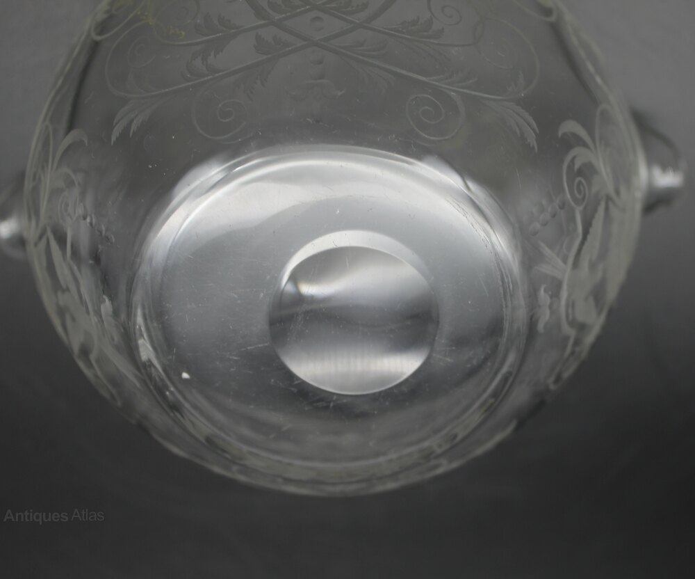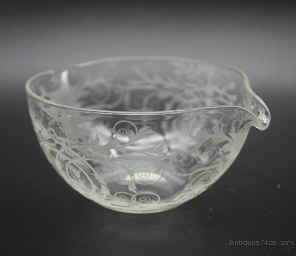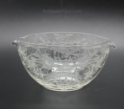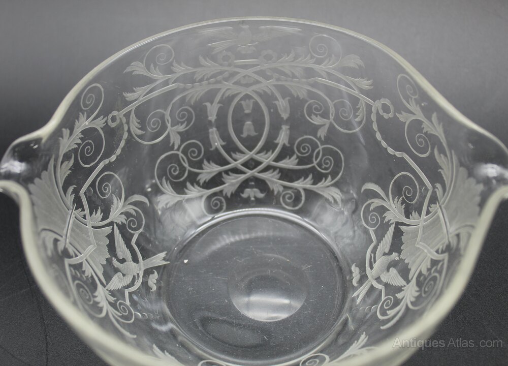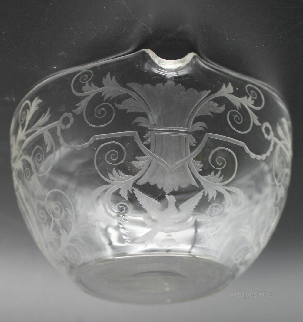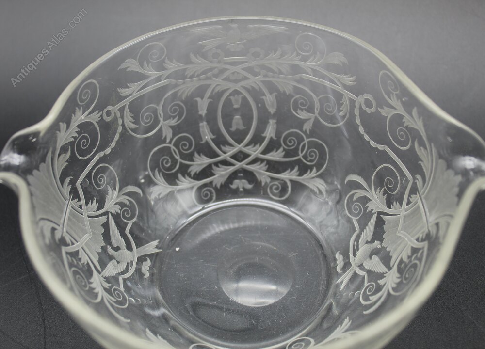 Beautifully etched and engraved wine glass rinser. Delicate, high quality. Decorated with eagles, swags and sheeves. With polished pontil. 15.5cm lip to lip, 13cm diameter, 7cm high. C1880.Shipping information