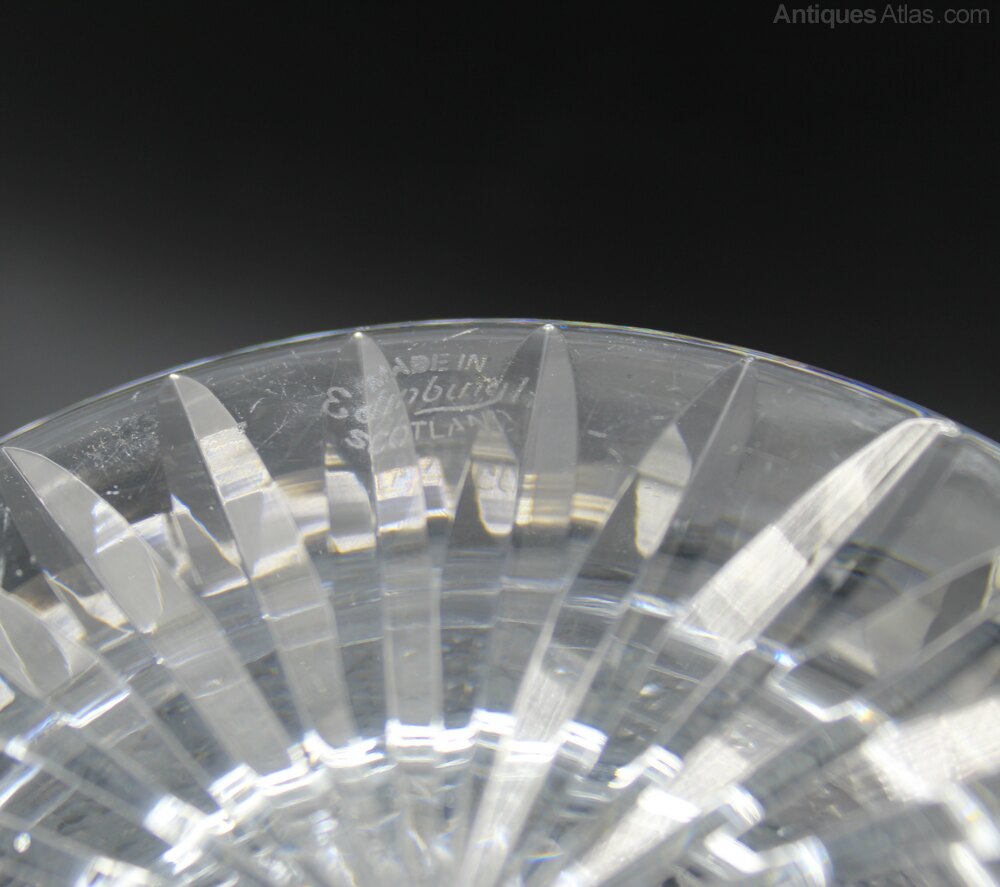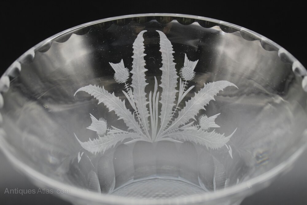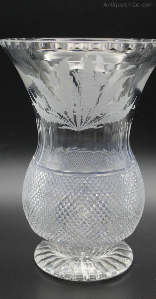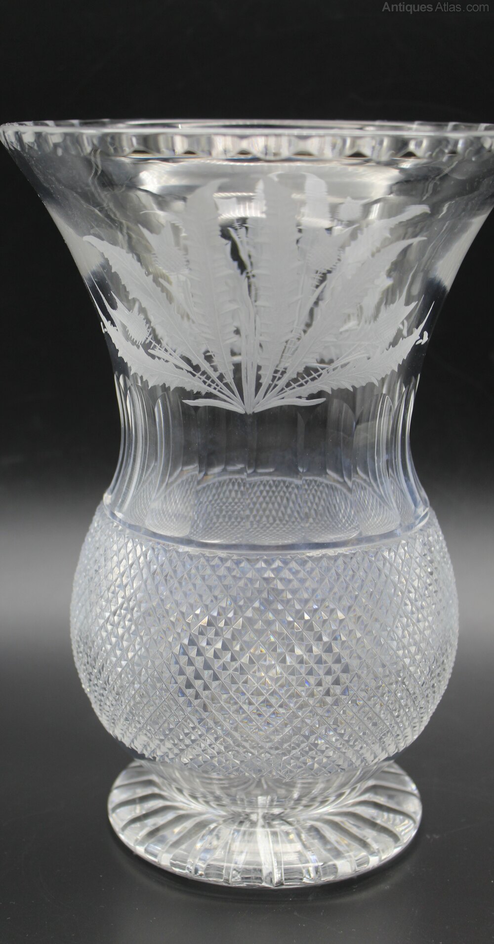 Beautiful vintage Edinburgh crystal thistle vase. 24.3cm high, 17cm top diameter, 11cm base diameter. A couple of minor scratches to inside of vase, near etched decoration. Etched maker's mark to base. Thistles engraved on either side around the top of the vase.Shipping information
