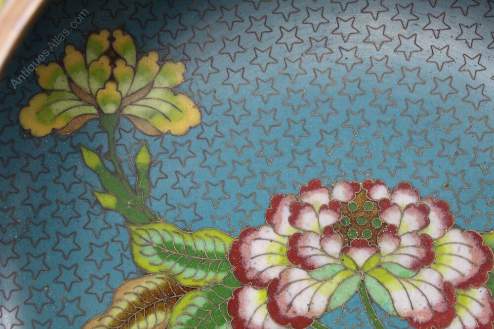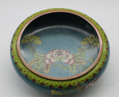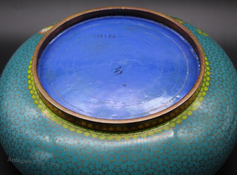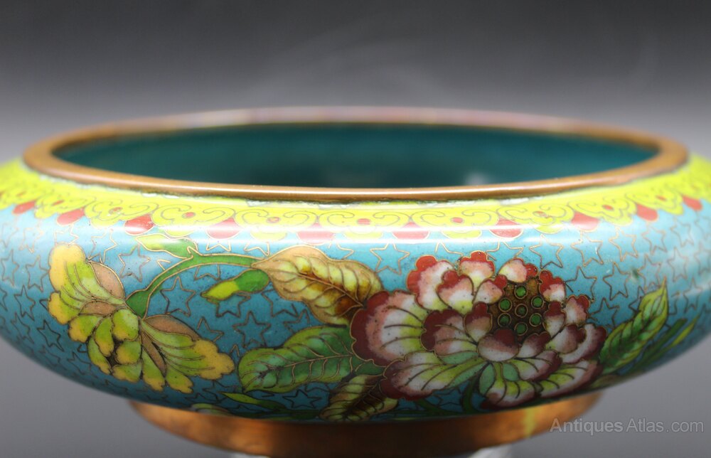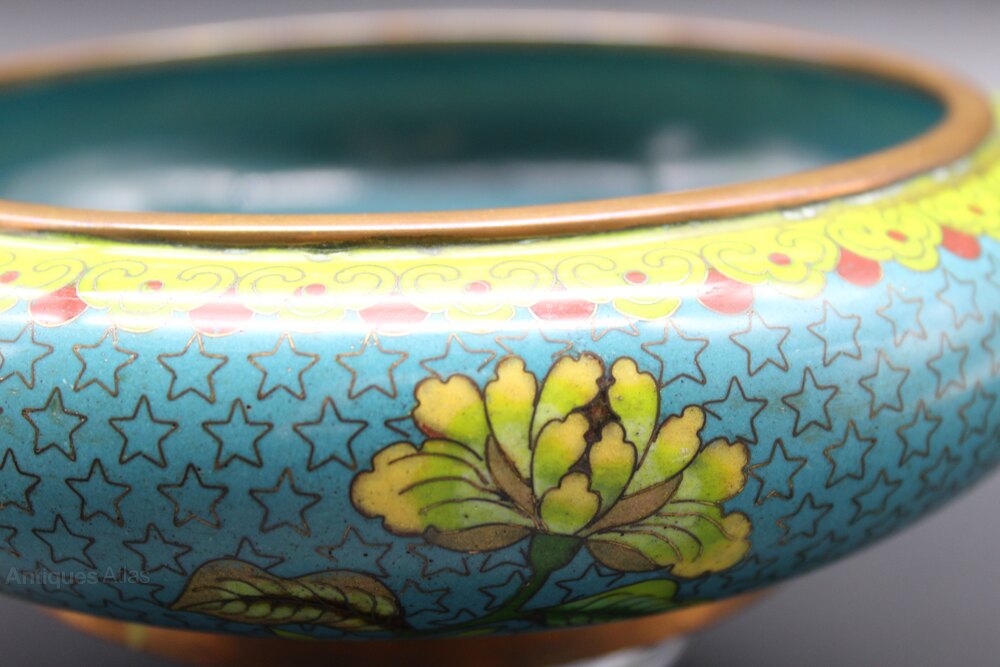 Lovely bright colours on this antique Chinese cloisonné enamel bowl on copper. Turquoise-blue ground with floral motifs and scrolling borders. Late Qing - 1890-1910. "CHINA" mark to base. 20.5cm diameter, 15.5cm diameter top opening, 6.5cm high, 13cm base diameter.Shipping information