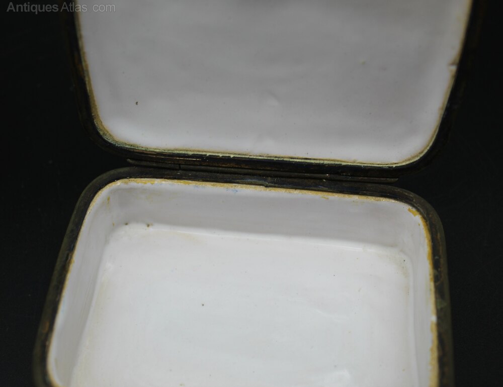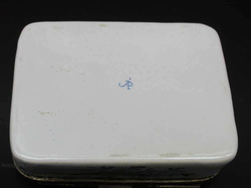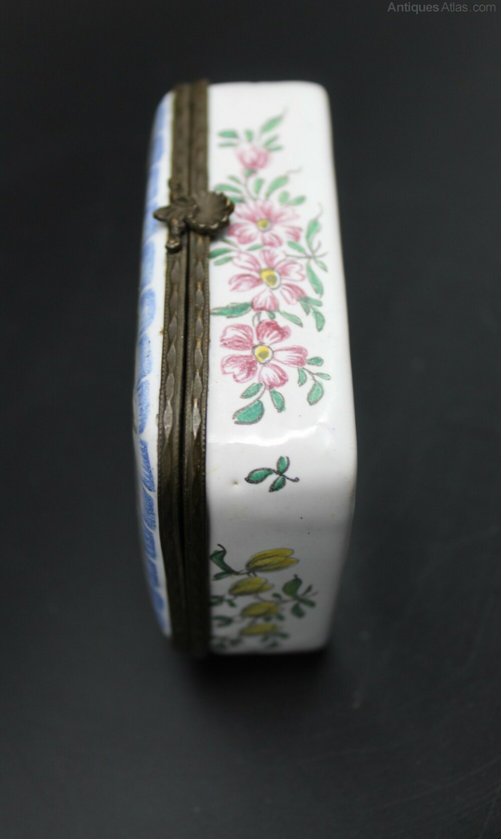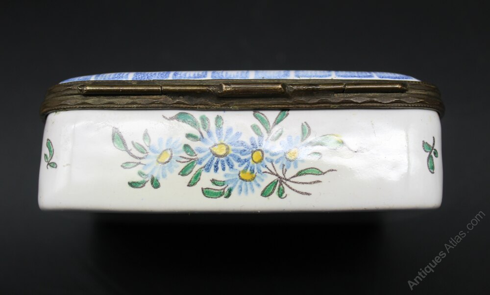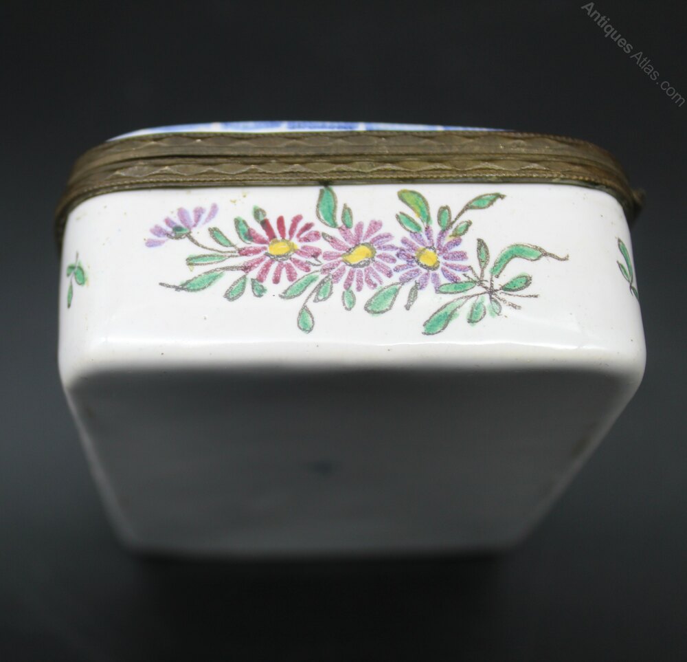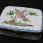 Lovely French Faience, Aprey style box. Late 19th Century. Hand painted decoration of bird in a tree and floral panels. No cracks, chips or restoration. 10cm wide, by 8cm dep and 3cm high.Shipping information