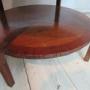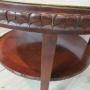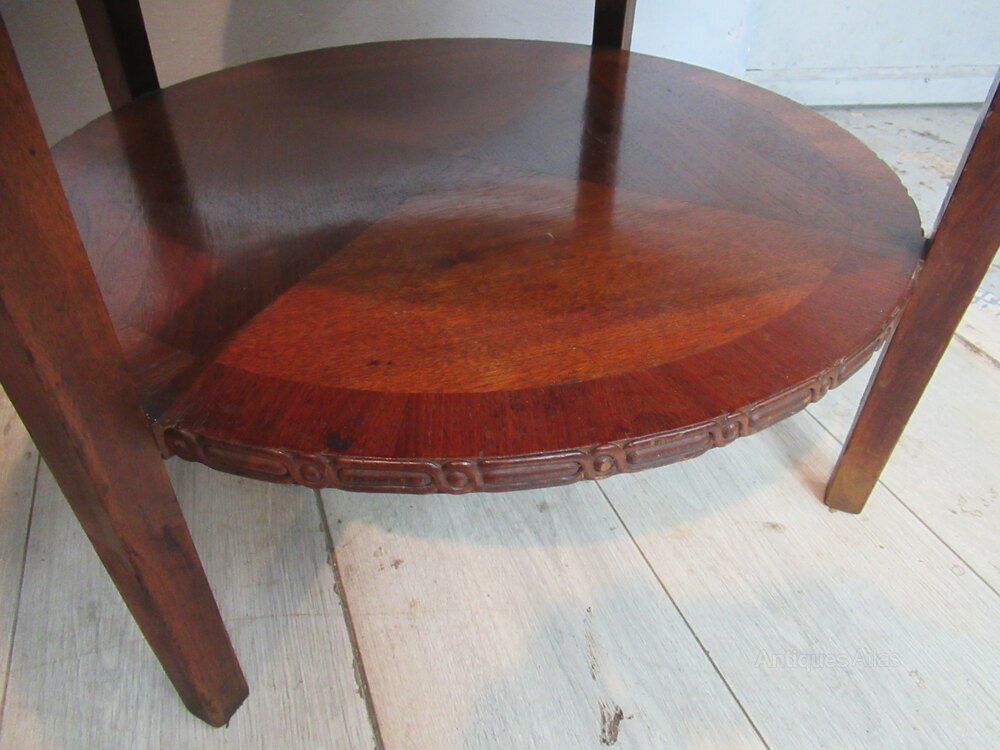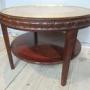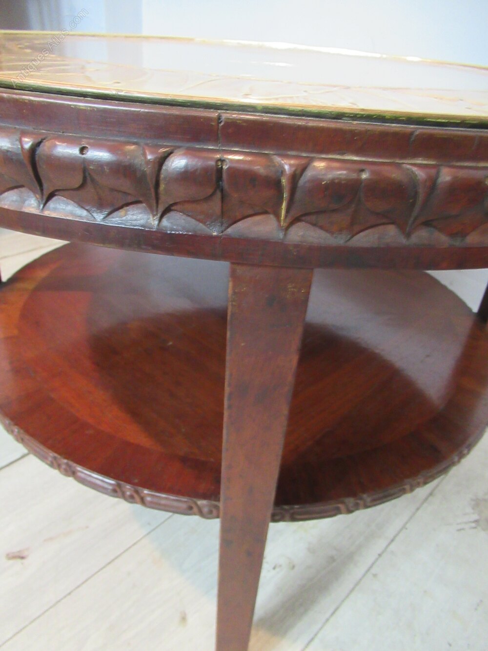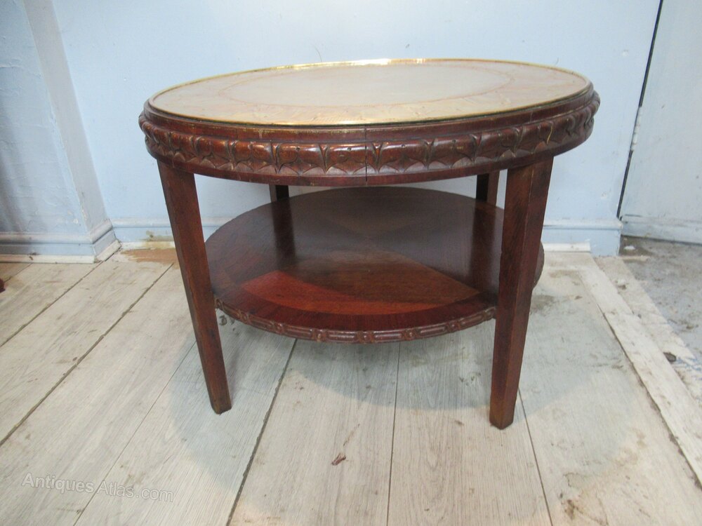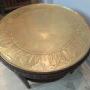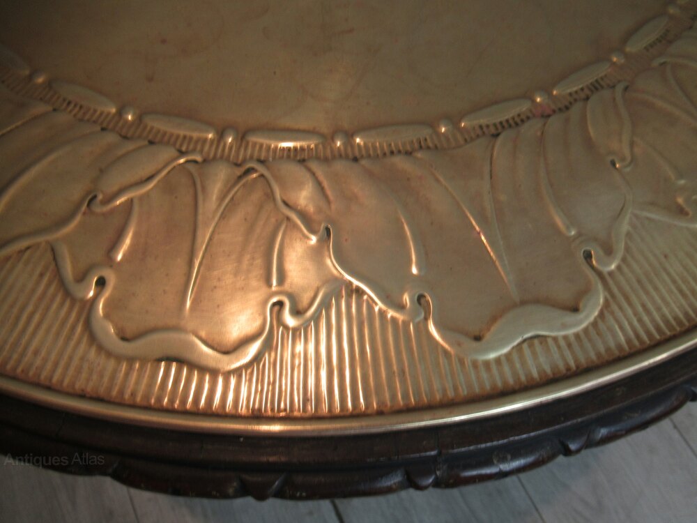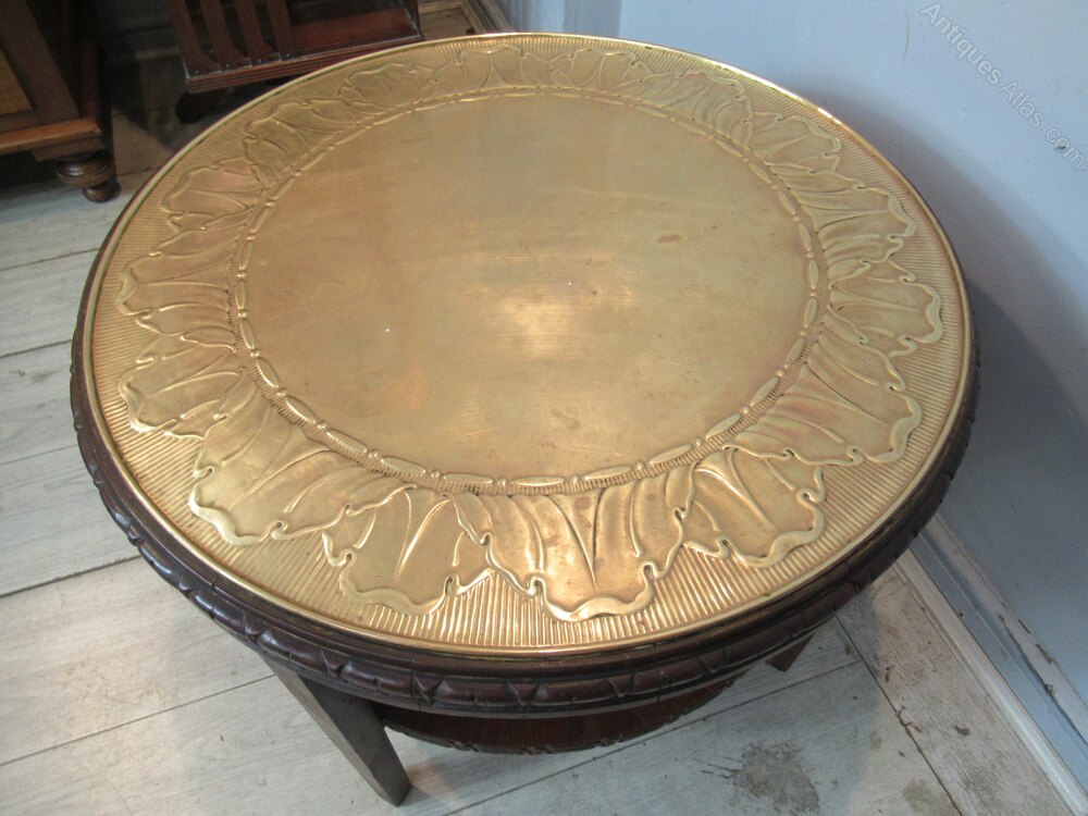 1920s round mahogany coffee table with an embossed brass top . The table has a carved top edge, on four taper legs with a lower undershelf.Date1920s