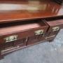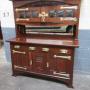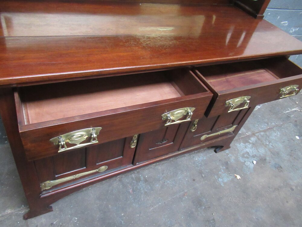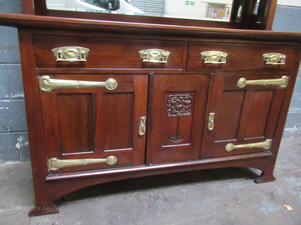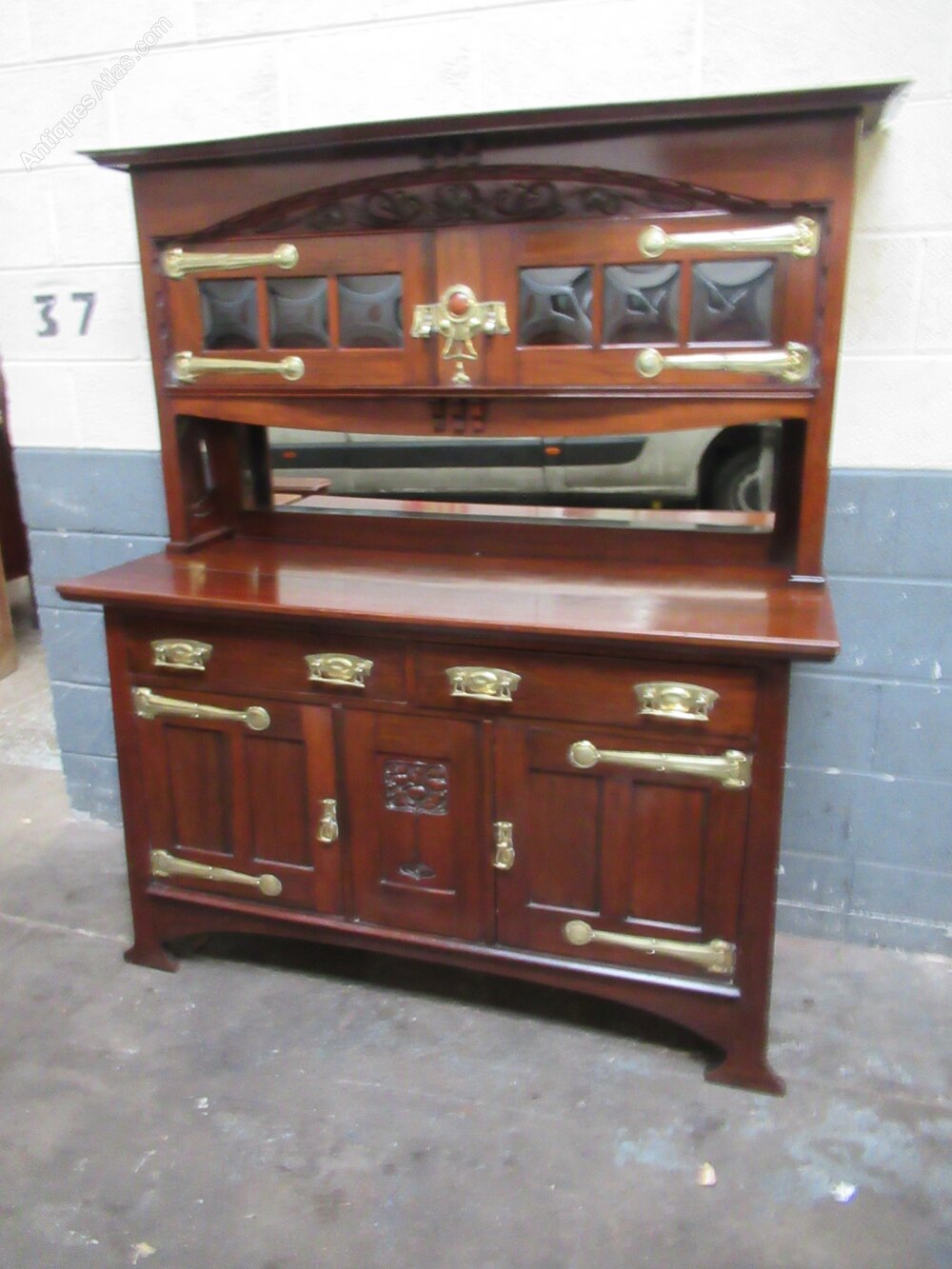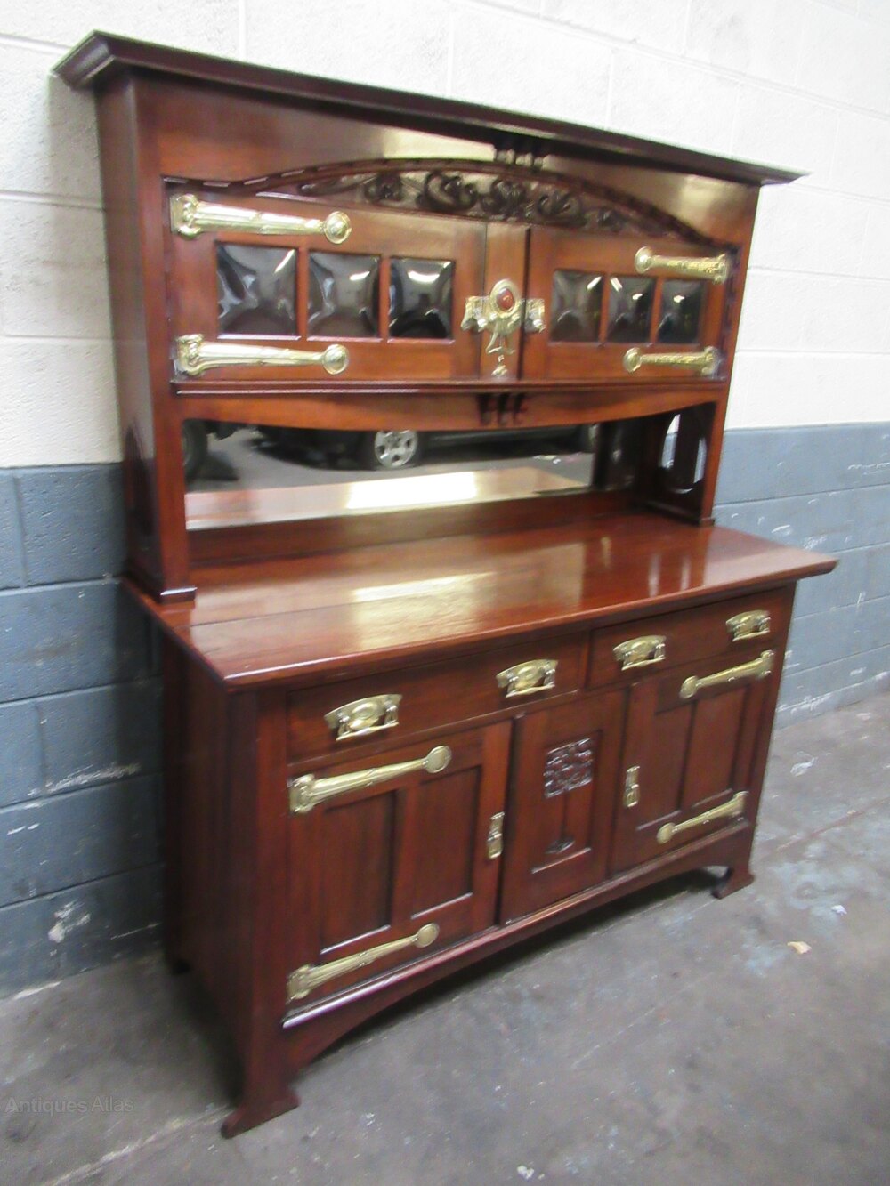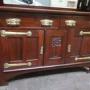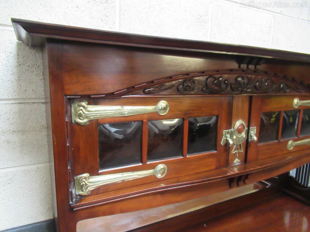 Large Arts and Crafts mahogany side board , which will split into two sections. The top with a carved arch, two convex glass doors with ornate brass fittings. There is a full length bevel mirror , The base has two drawers and two cupboards, all with brass fittings .DateArts and Crafts :