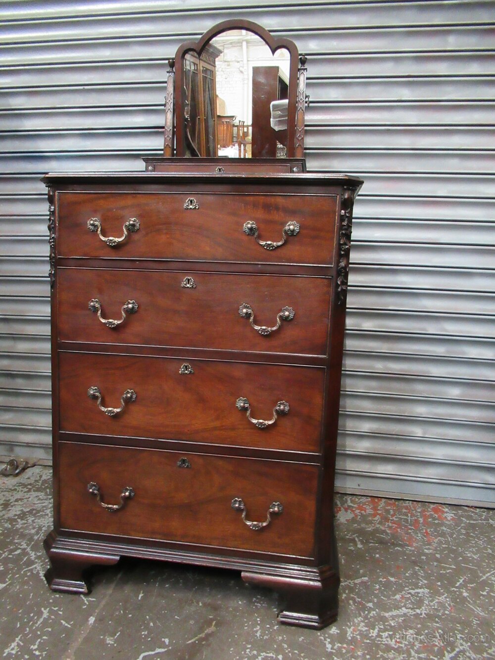 Chippendale style mahogany dressing chest dating from 1910 . With four graduated drawers with brass handles , and standing on shaped bracket feet. The top has a small trinket drawer with carved and taper swing mirror supports.Date1910s :