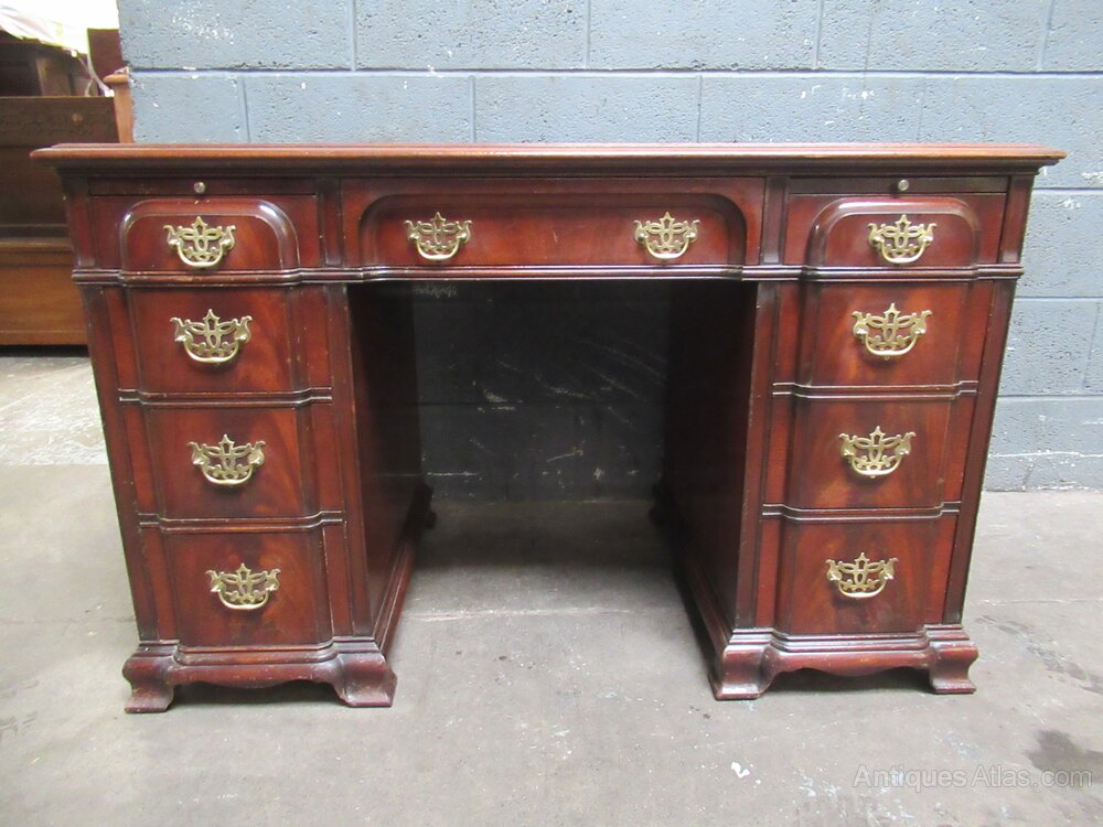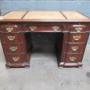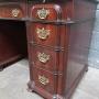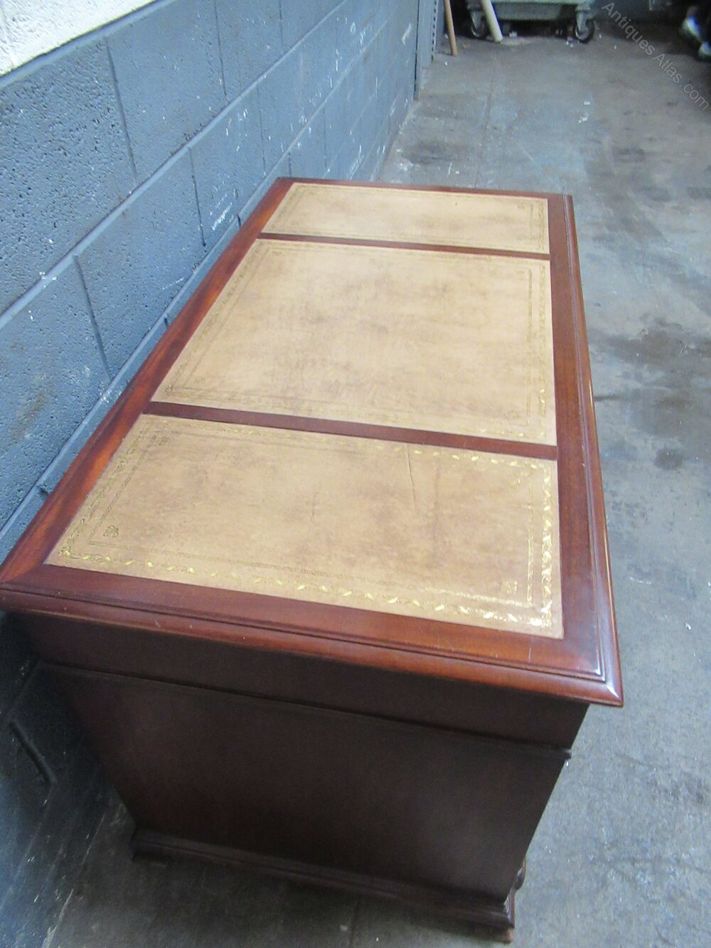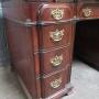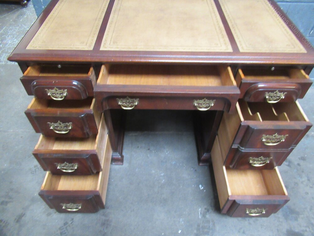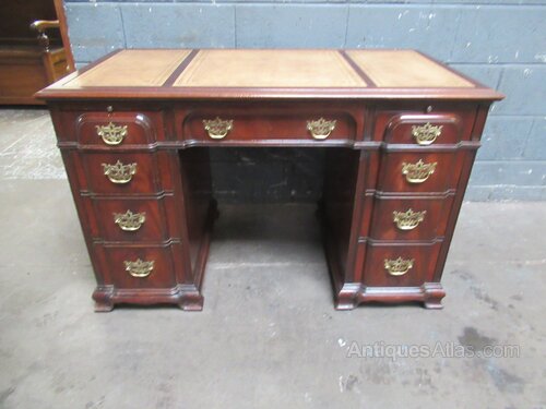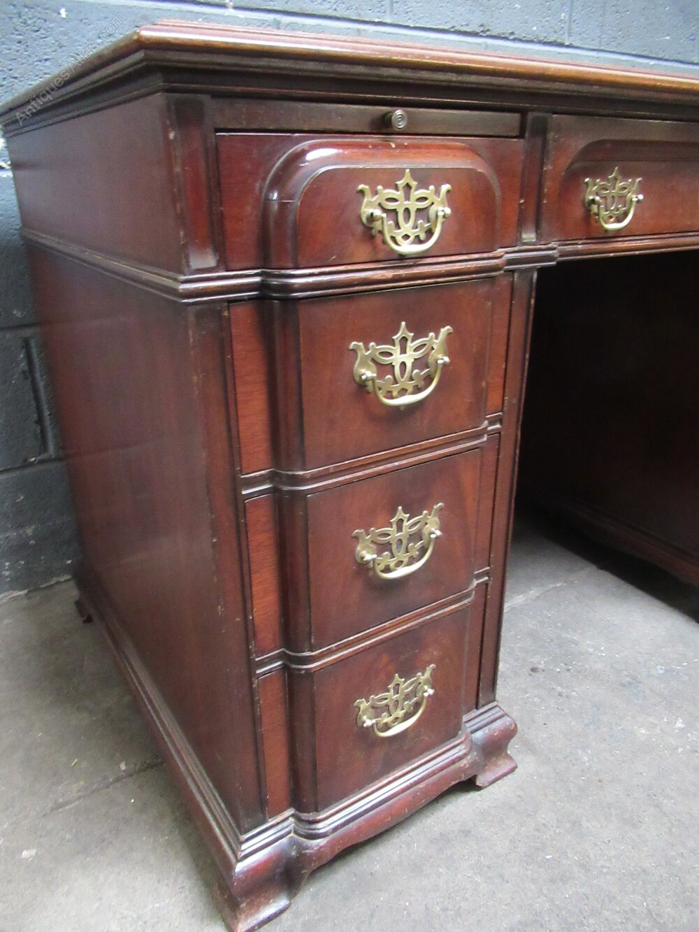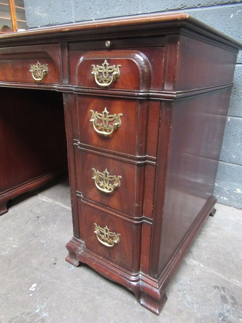 A mid century mahogany knee hole desk in the antique style. The top has three light tan leather liners. There are eight drawers in all . with the right side has a double file drawer, all with brass handles,, the desk does not split down.Date1950s