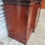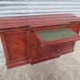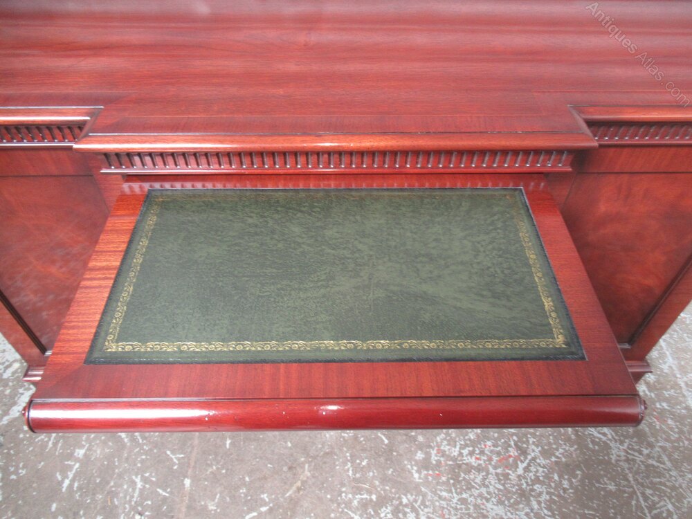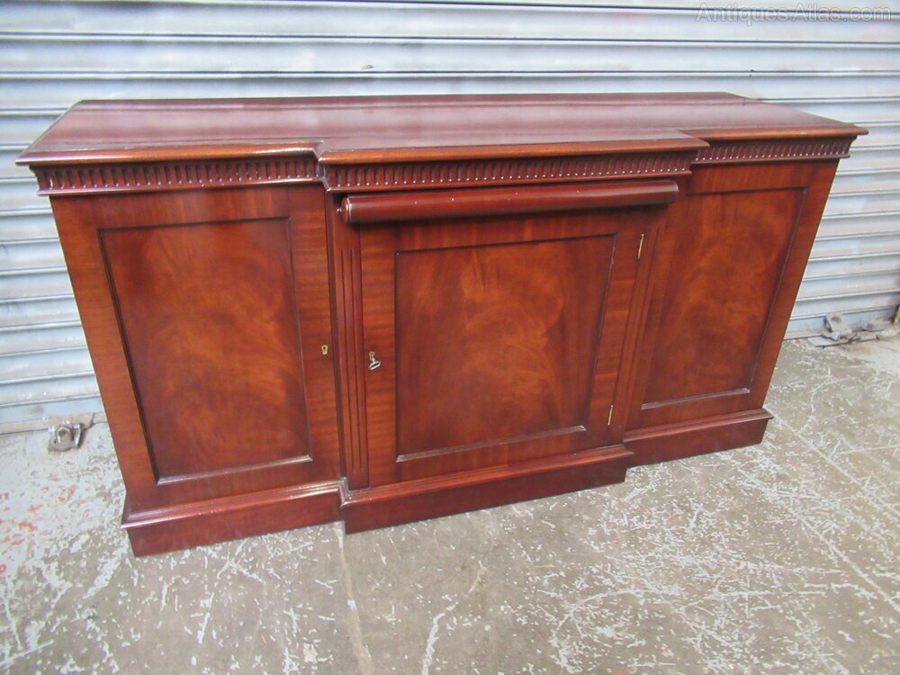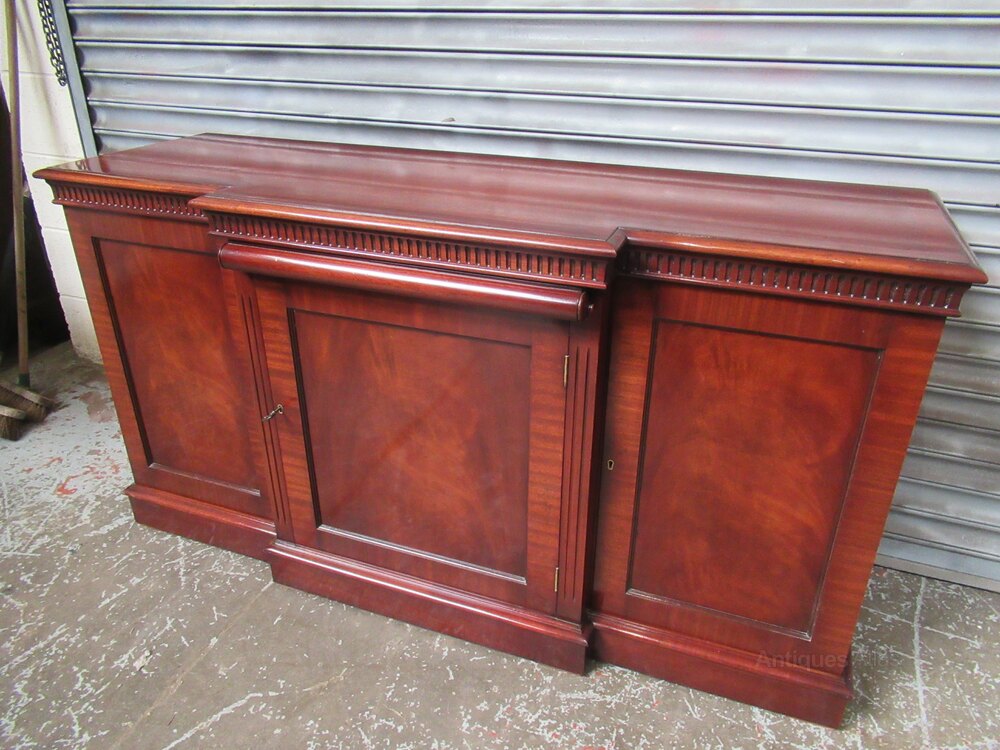 Modern mahogany sideboard in the antique style , in as new condition, With a break out front , with three cupboards, with locks and key . The interior has a shelf in each cupboard , which are adjustable . There is a pull out top slide shelf / server which has a green leather inset liner, with gilt tooling . Label to the rear for N H Chapman ,co Newcastle,Date1990s :