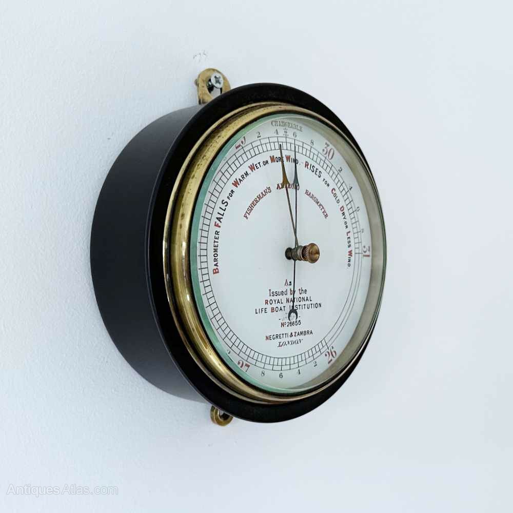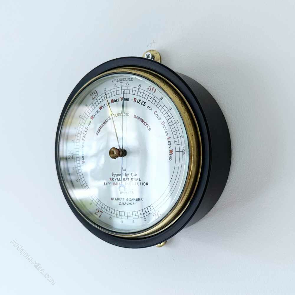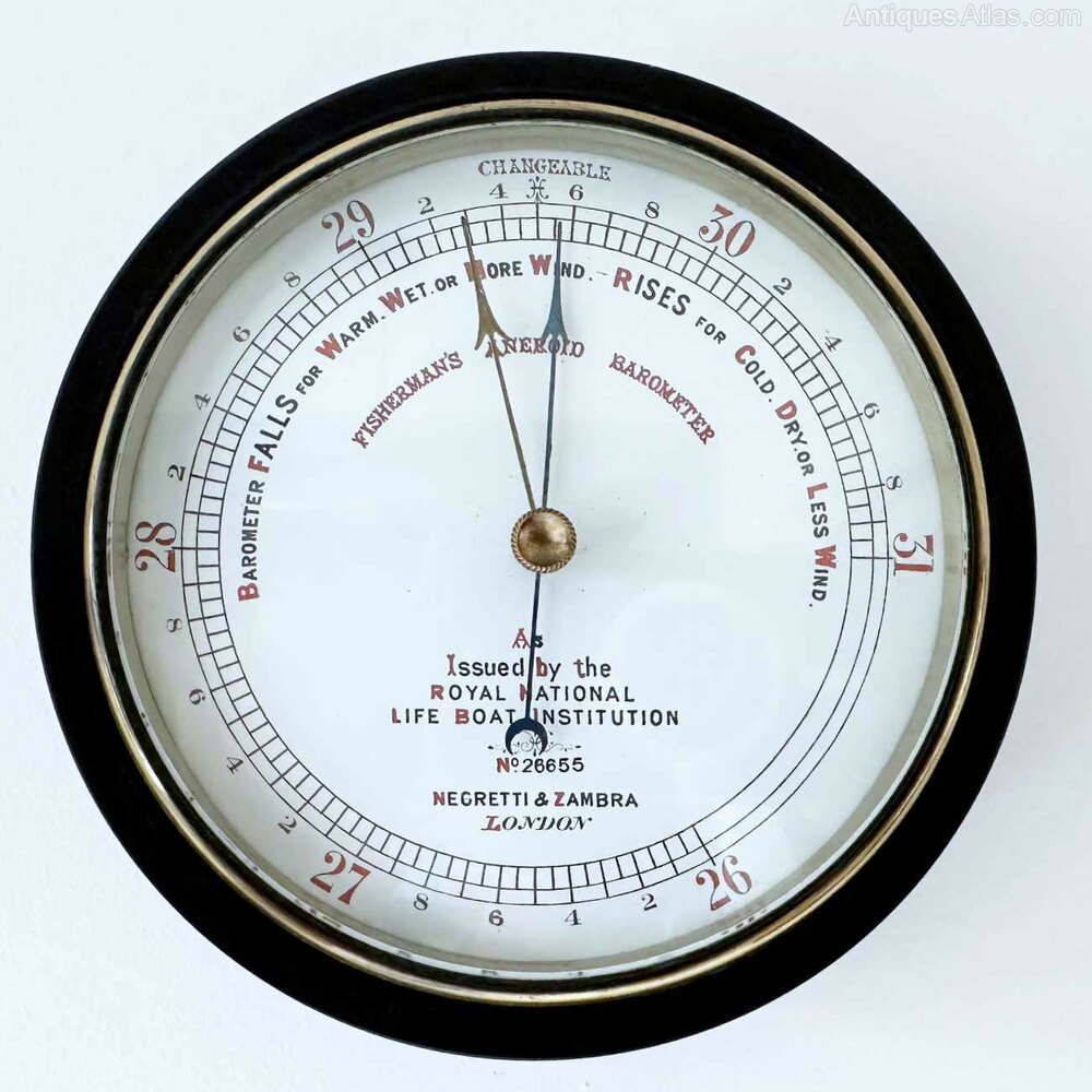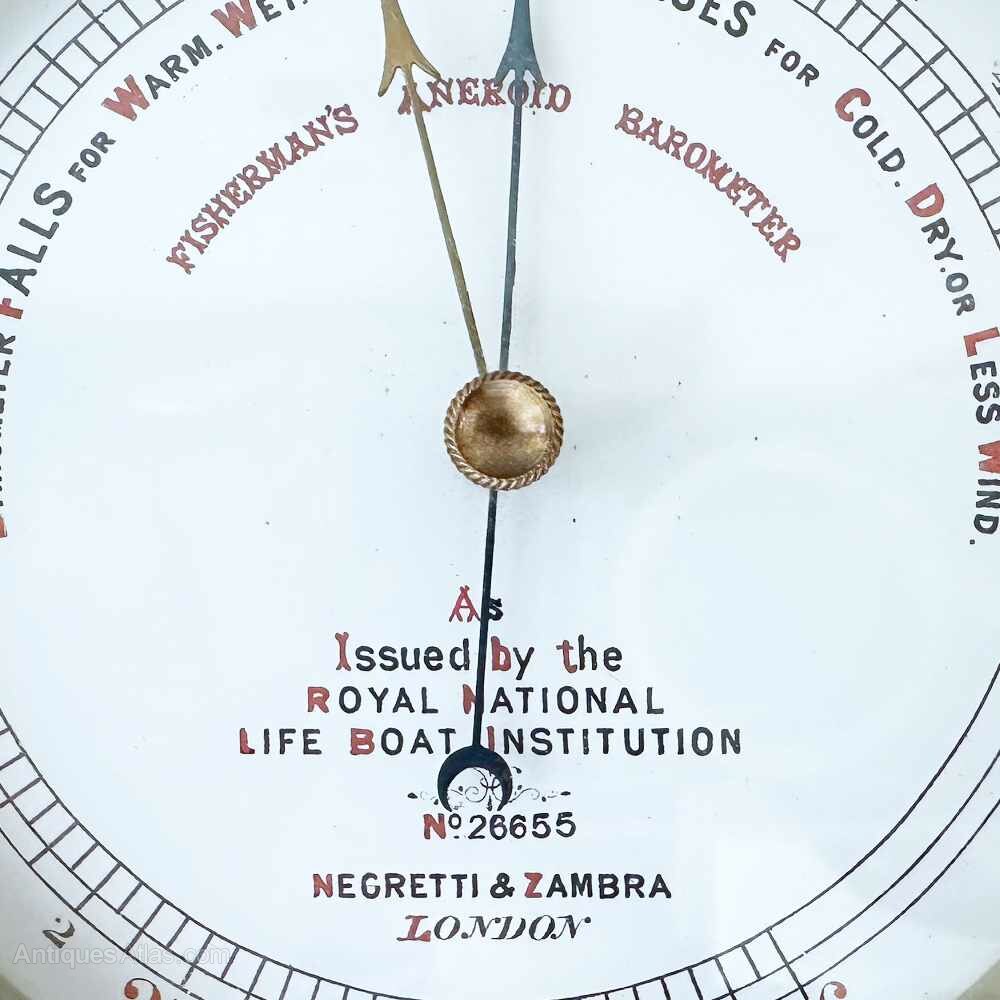 For sale, a late Victorian Fisherman’s Aneroid Barometer with five-inch enamelled dial by Negretti & Zambra of London and issued by the Royal National Lifeboat Institution (RNLI) – No. 26655.As early as 1864, Negretti & Zambra were advertising “The Fisherman’s Aneroid Barometer”, their catalogue states,