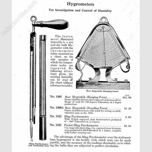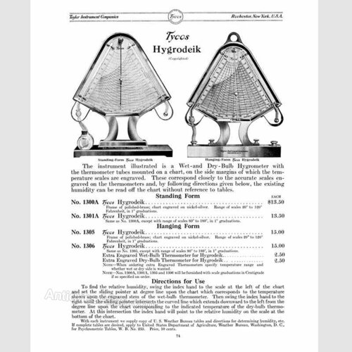 From extant advertising, the Hygrodeik seems to have been developed during the company’s period of renaming its US arm under the brand name, Tycos since both US and UK catalogues use similar imagery. The UK catalogues also present images of instruments which are branded to Tycos indicating that the company thought it unnecessarily costly to reproduce the same with S&M branding.