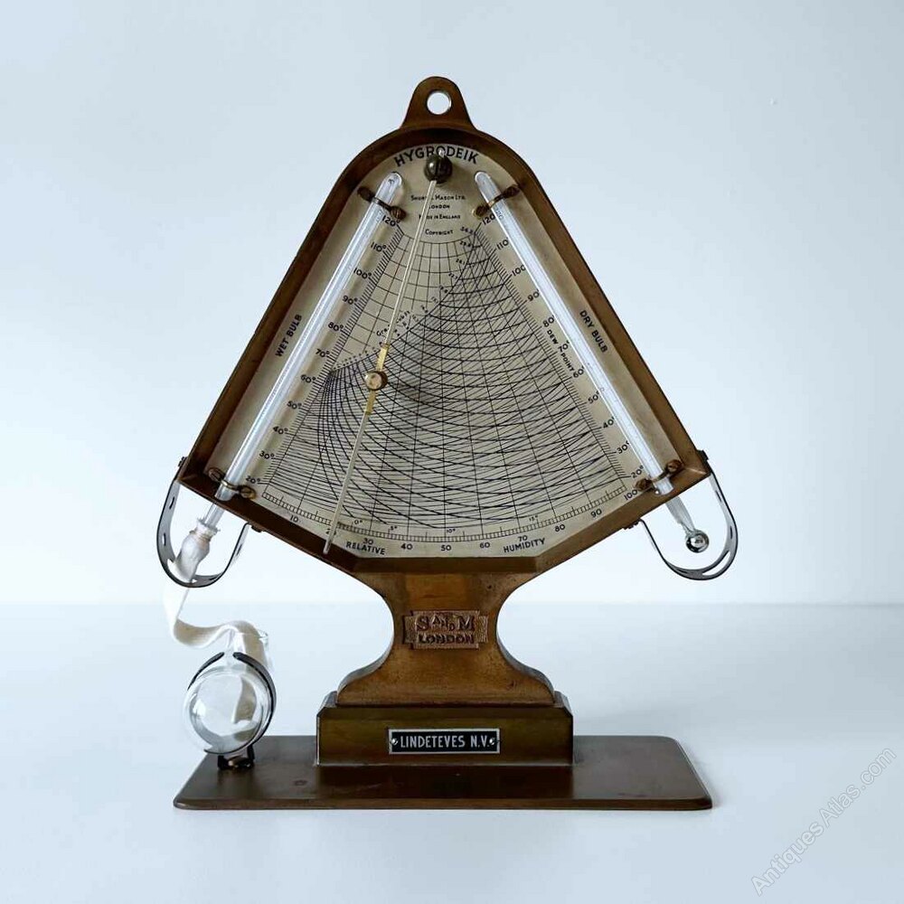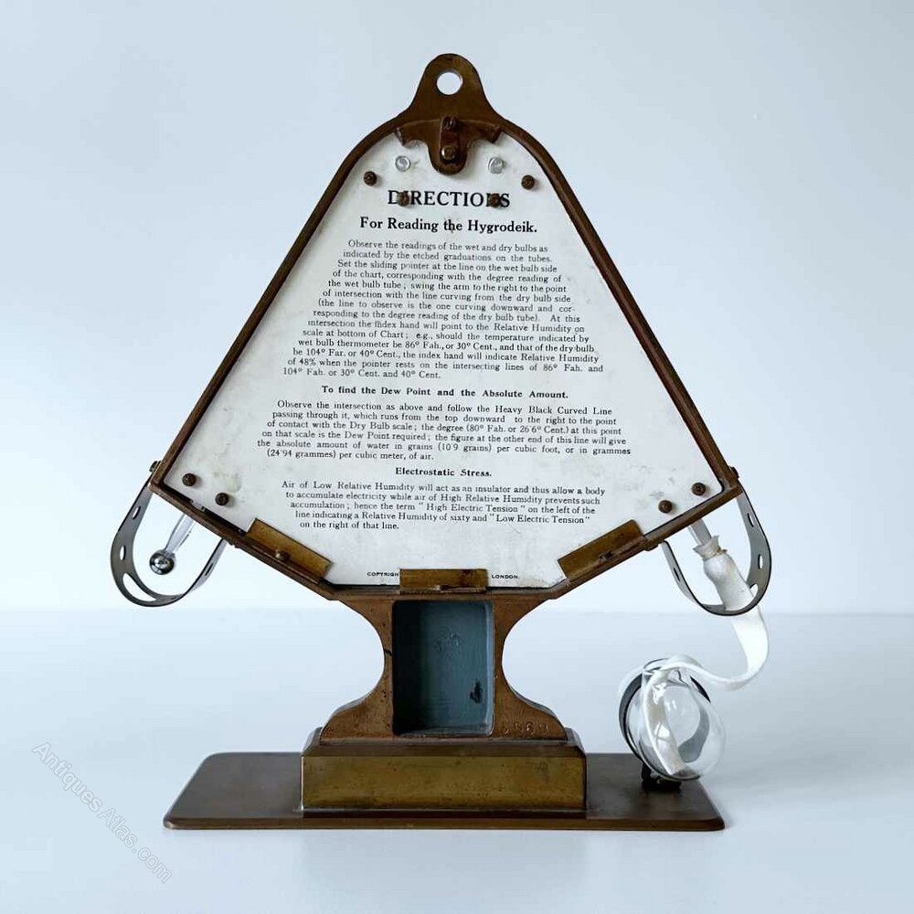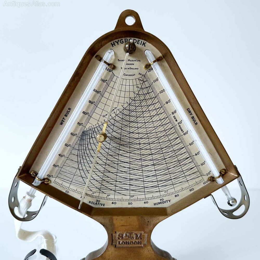 For sale, an Early Twentieth Century Hygrodeik or hygrometer by Short & Mason, London.Manufactured from solid brass, this ingenious wet and dry bulb hygrometer is structured with both thermometers angled on either side of a triangular scale. The white glass backed thermometers have their bulbs protected at the protruding ends by means of solid brass loops with holes cut into them to aid the free flow of air. The wet bulb is covered with cotton tubing to keep it continuously damp by means of a glass water trough affixed to the base.