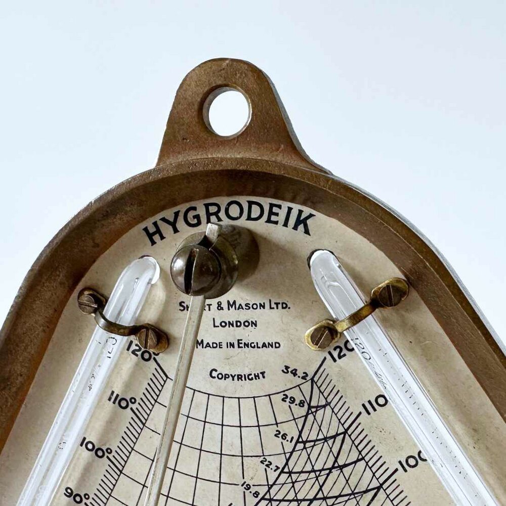 The central engraved and silvered dial reads from 10-100 degrees of humidity and has temperature scales running at the same angle as the thermometers. It has a central brass point hinged at the top of the scale with a secondary sliding pointer incorporated on the index arm. The brand name Hygrodeik appears at the top of the scale with the company name below, “Short & Mason Ltd, London and “Made in England”.