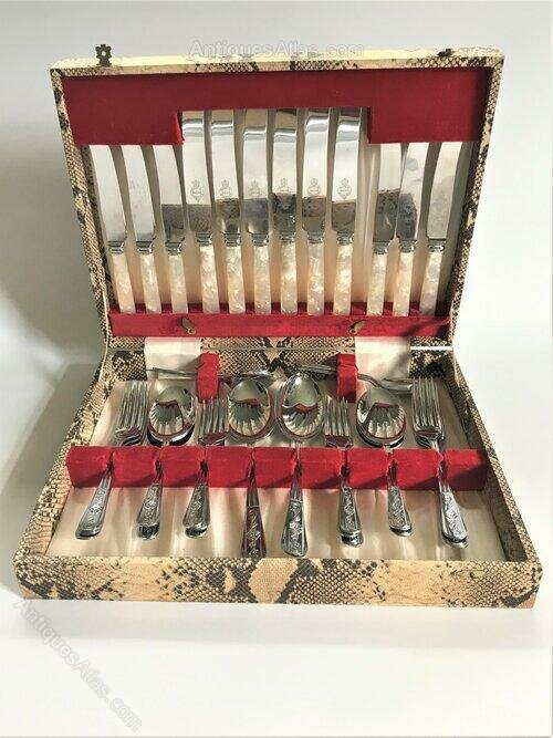 A handsome boxed canteen of chrome plated flatware. The vintage forks and spoons have patterned handles featuring floral and foliar motifs, and the knives have mother-of-pearl handles.The canteen is complete and comprises six each of the following :- Table forks, Table knives, Dessert spoons, Dessert forks, Dessert/Entrée knives, teaspoons. There are two large serving spoons in addition.