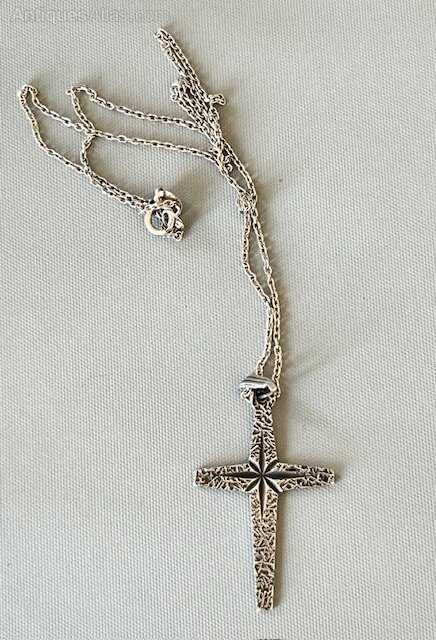 A delightful vintage silver cross, with a textured finish and a star engraved to the centre. The reverse is marked 'sterling silver' and the cross is supplied with a silver chain, making this a ready to go gift idea.Postage and packing