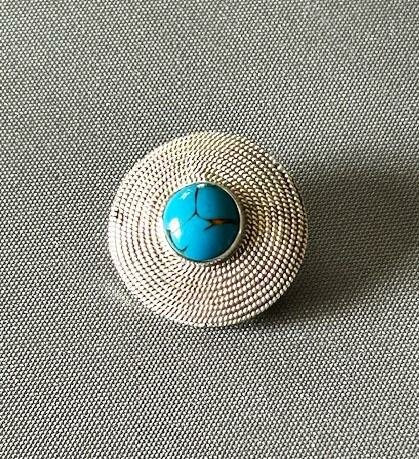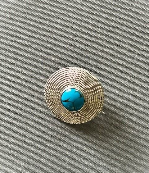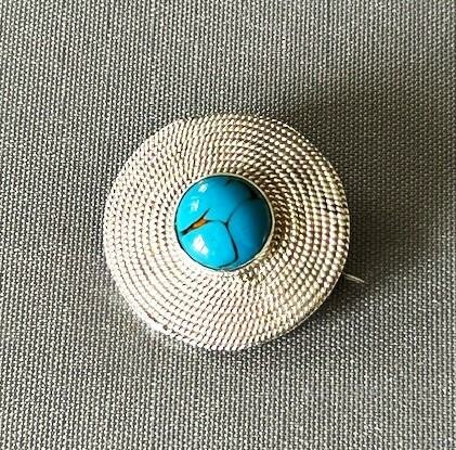 A wonderful Arts & Crafts antique brooch attributed to Bernard Instone. This unusual design has a spiral rope-twist body and a central enamel cabochon, known as a matrix turquoise and often found associated with this maker. The reverse is marked Sterling Silver and the pin is fastened with a 'C' clasp. A gorgeous period brooch by a great designer of the Arts and Crafts movement.Postage and packing
