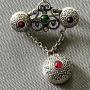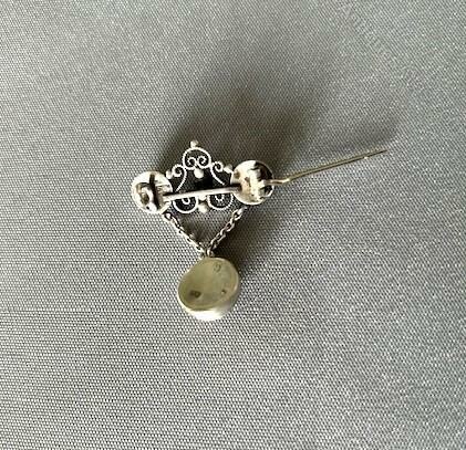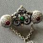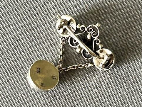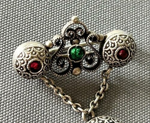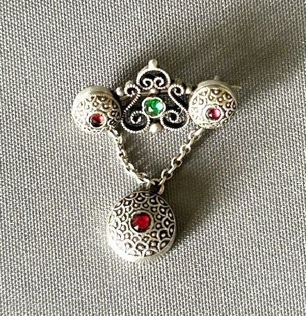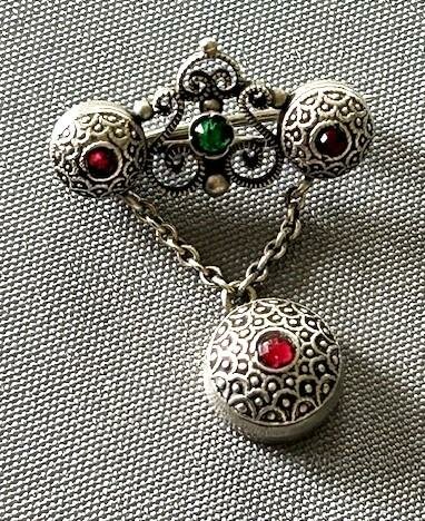 Gundorph Albertus was a Danish silversmith (born 1887) working for George Jensen in the early 20th Century and becoming head of production following Jensen's death in 1935. Probably his greatest achievement was designing the iconic 'Cactus' pattern for the company's flatware range.This wonderful early example of his jewellery is in the style of a 'Bunad' brooch - traditional Norwegian wedding brooches often worn by men on the collar. It is set with red and yellow paste stones and has a pendant fall to the base, being fastened with a 'C' clasp.