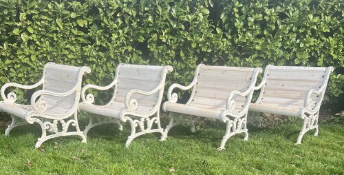 A rare set of 4 very heavy and generously proportioned Victorian cast iron and wood garden chairs. Reputedly brought back to England from the Calcutta Polo Club, India. The shaped wooden seats have been refurbished and all are in excellent ready to use condition. Dimensions:- Height…27.5’’/ 70cm. Width…28.5’’/ 72.5cm. Depth…24.5’’/ 62cm.ALL TRADE ENQUIRIES WELCOME.