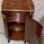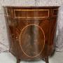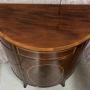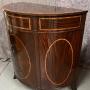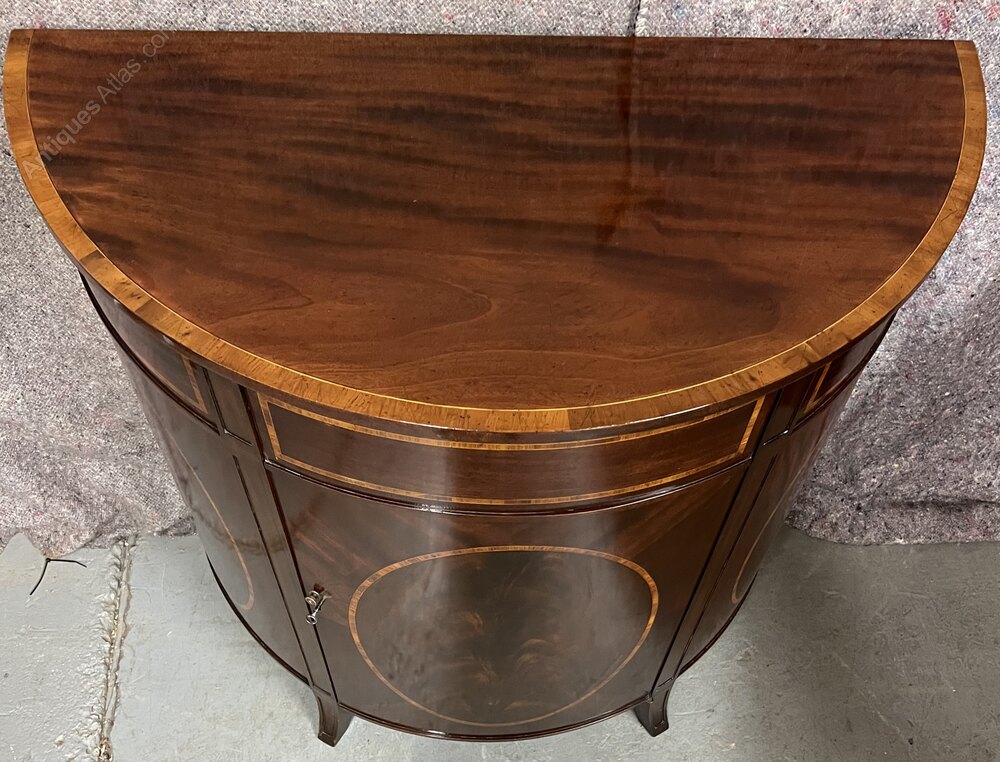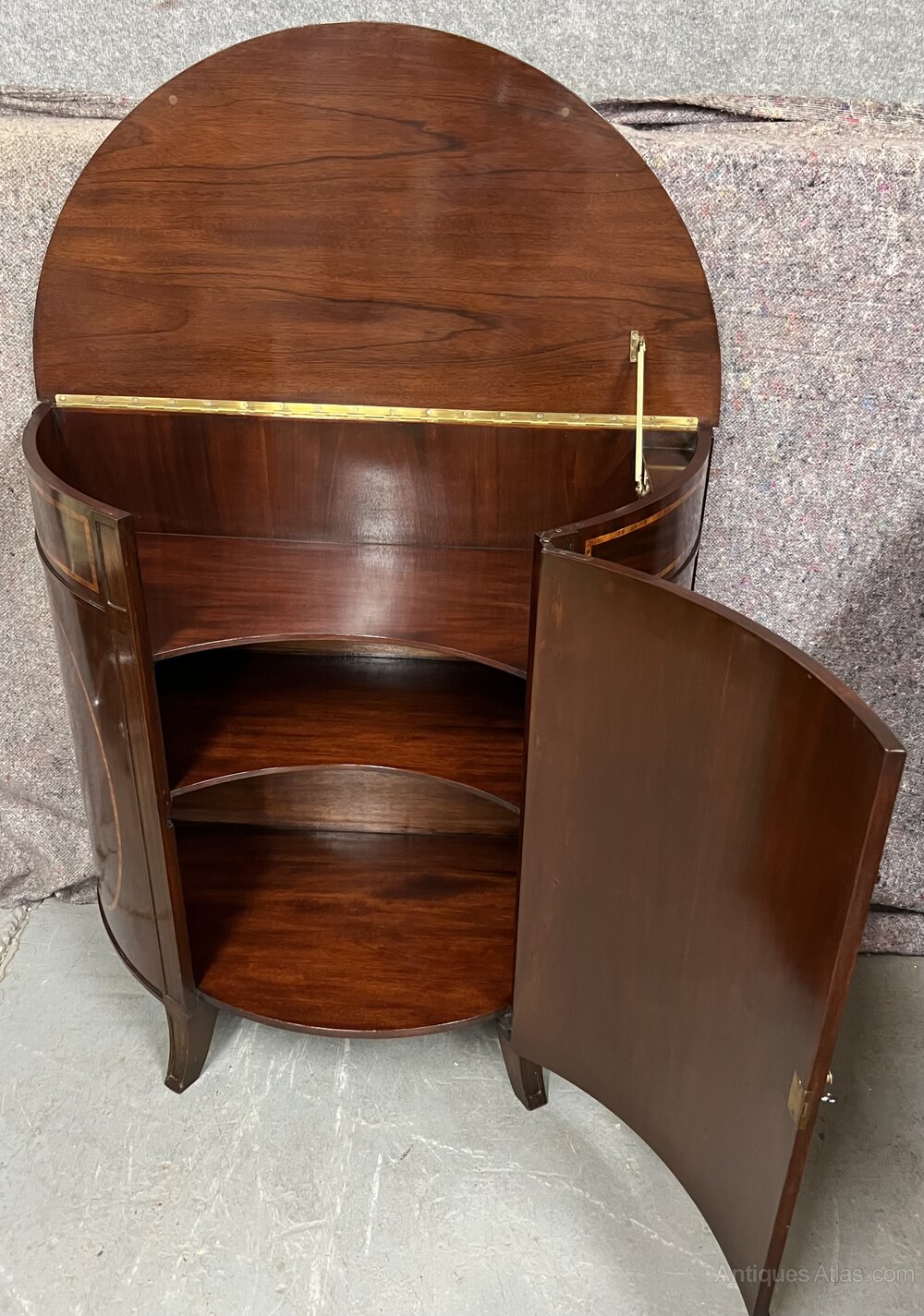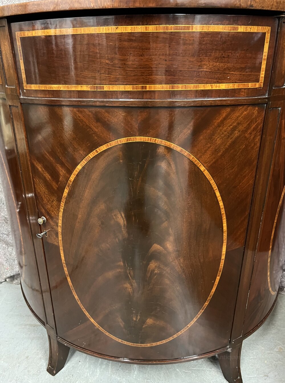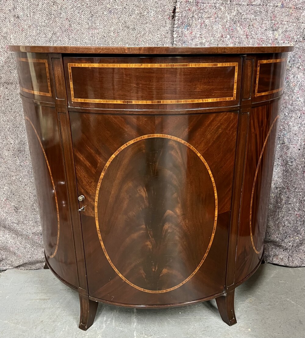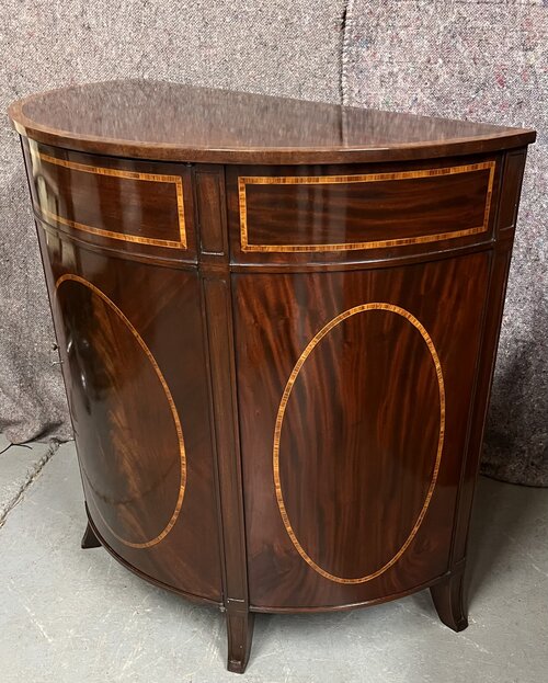 A superb Sheraton Revival demi lune cabinet. The bow fronted figured mahogany top cross banded and lifts to allow access to the polished interior. The frieze has kingwood banding above the centre door which has a typical Sheraton Style figured mahogany oval panel outlined again with kingwood inlaid banding and is flanked by conforming oval inlaid panels. The whole raised on short splayed feet with working lock & key. Condition- Fine, no damage or repairs. Dimensions:- Height…38.5''/ 90cm. Width…37''/ 94cm. Depth…18.75''/ 48cm. Delivery to most of U.K. £55.ALL TRADE ENQUIRIES WELCOME.