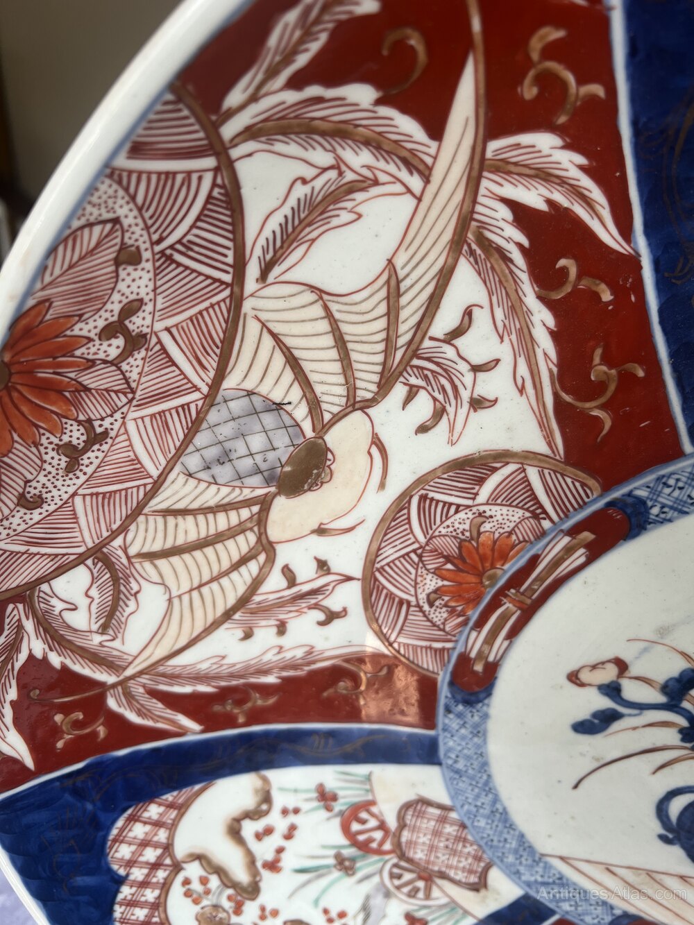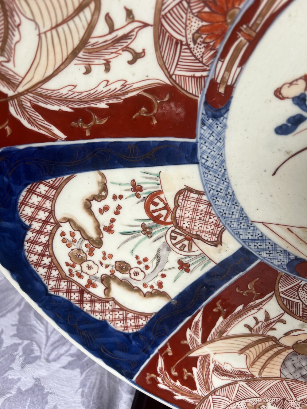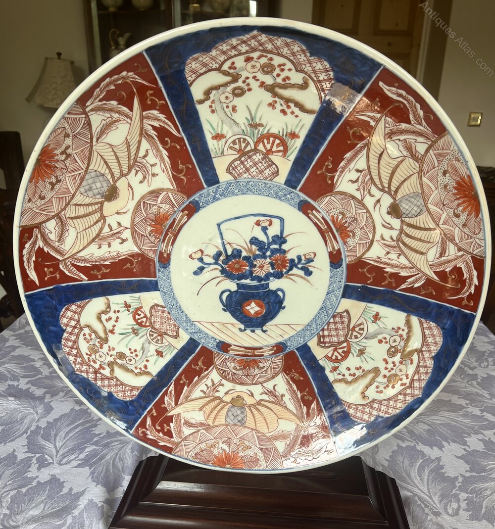 A large 19th.Century Imari Charger. The blue ground panels decorated with clouds, leaves and flowers. The red ground panels decorated with bats and fauna. The centre panel showing a vase of flowers on a table. The whole hand painted in red, blue and green with gilded highlights and the reverse is also decorated. Dimensions:- Diameter…18.25’’/ 46.5cm. Depth…2.3/8’’/ 6cm. Free U.K. delivery on this item.ALL TRADE ENQUIRIES WELCOME.