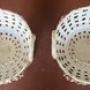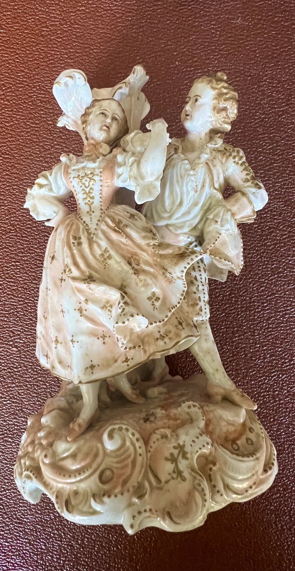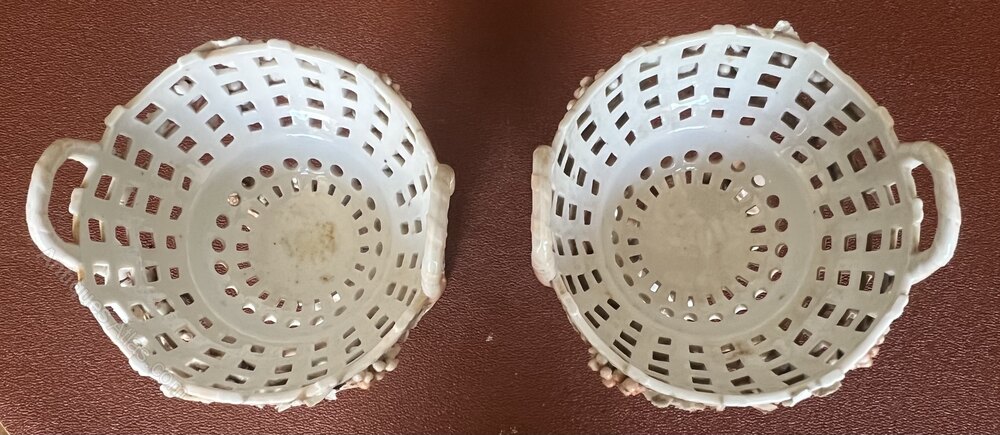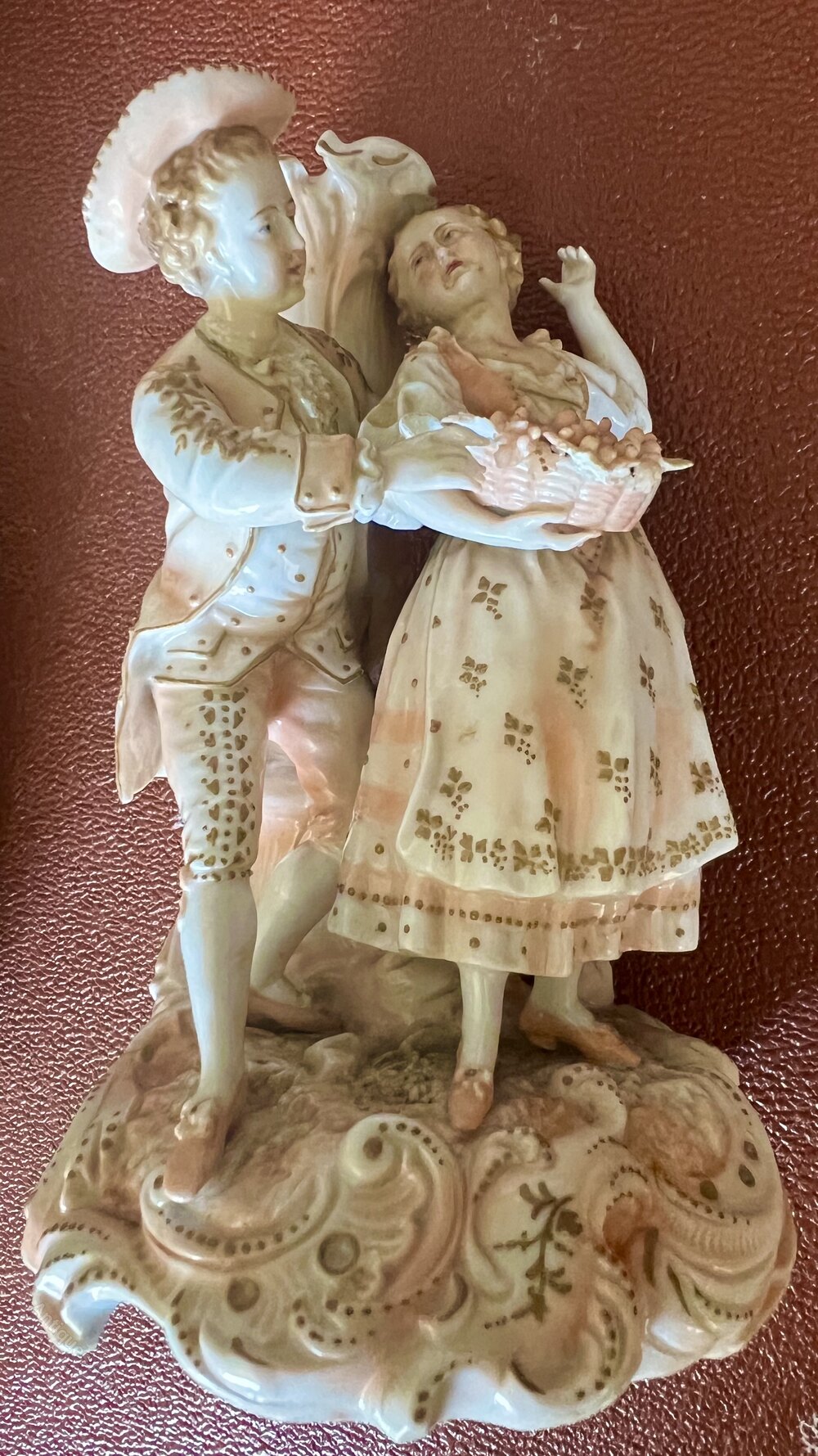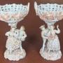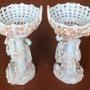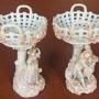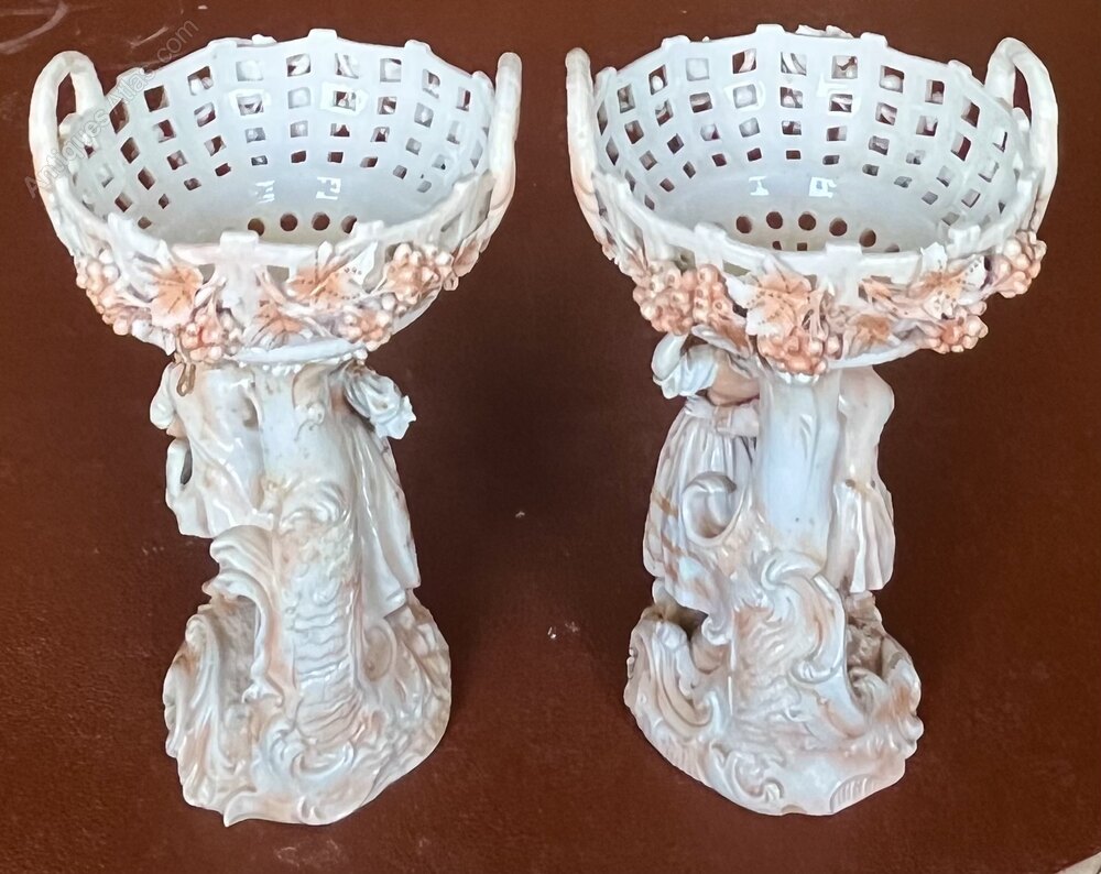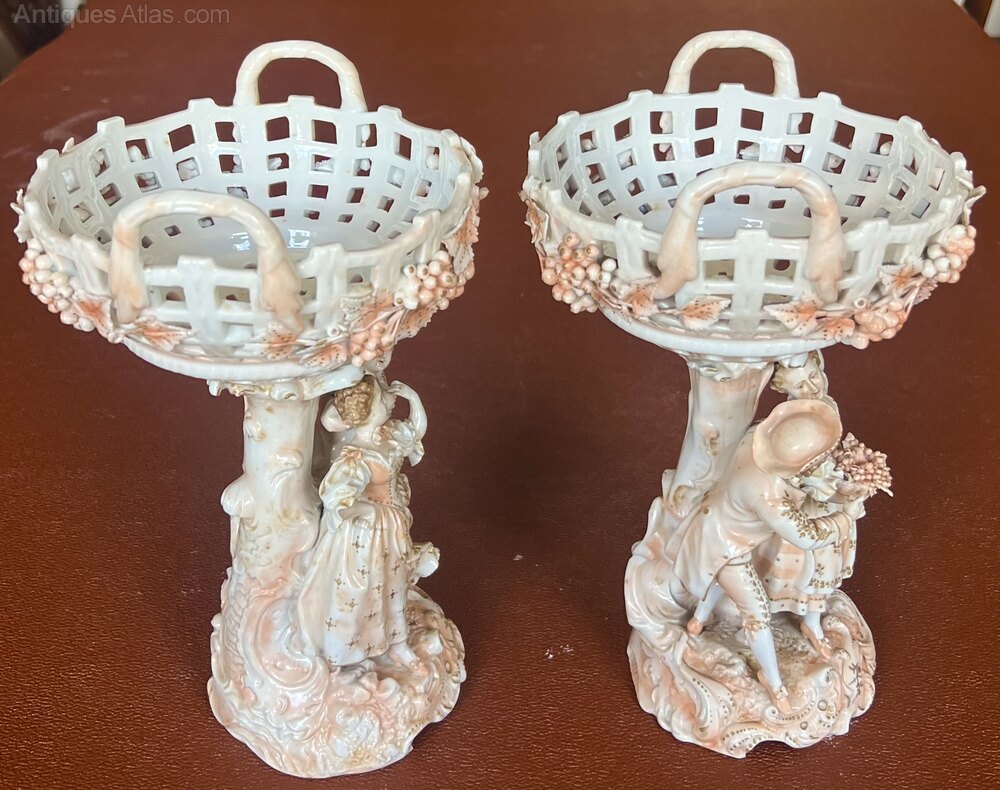 An attractive and good quality pair of Continental porcelain figural centrepieces, circa 1900. The shaped bases having 18th century dressed couples with very good detail and decorated in peach, white and gilded highlights. The pierced bowls encrusted with flowers, leaves and berries in conforming colours. Both with 2 raised handles and are removable from the bases. Condition- Very good with minimal very small chips to a couple of leaf edges (hardly noticeable ). Dimensions:- Height…11’’/ 28cm. Width…6.5’’/ 16.5cm. Depth…6.75’’/ 17cm. Free U.K. delivery on this itemALL TRADE ENQUIRIES WELCOME.