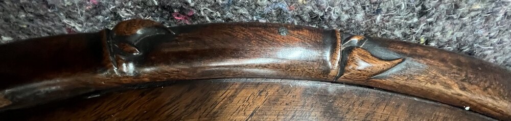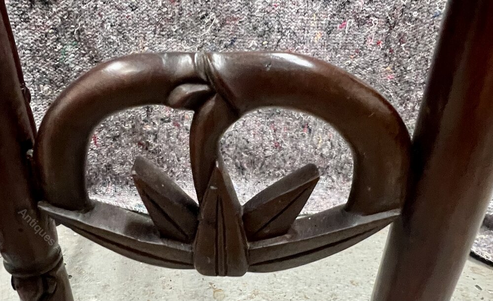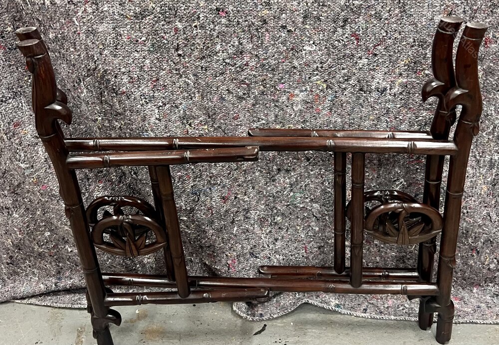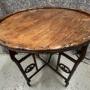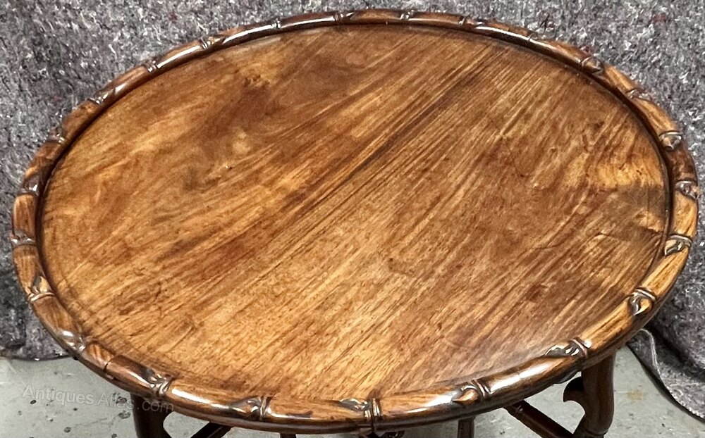 A good late C19th Chinese ''Qing'' Dynasty circular hardwood occasional table. The circular removable tray-top having a shallow carved faux bamboo gallery. The foldable 4 legged base with faux bamboo carved decoration joined with cross stretchers and further faux bamboo leaf brackets. Condition- very good, warm patina and working hinges for easy storage. Dimensions:- Height…25’’/ 63.5cm. Diameter...27.75’’/ 70.5cm. Delivery to most of U.K. by furniture carrier £45.ALL TRADE ENQUIRIES WELCOME.