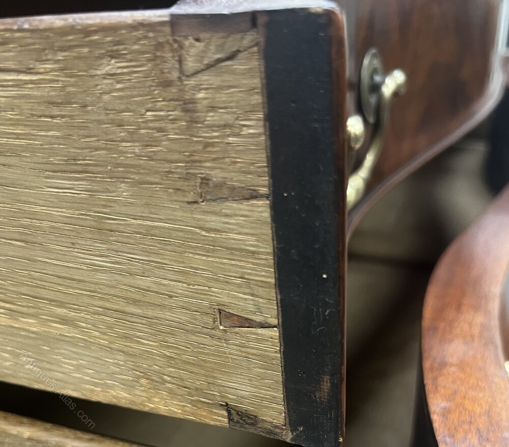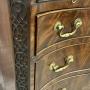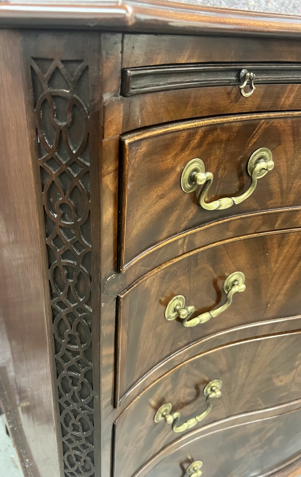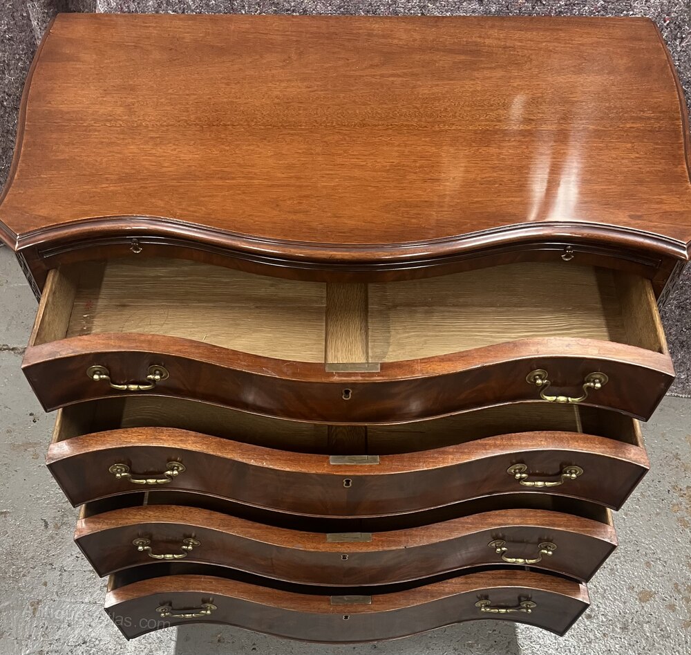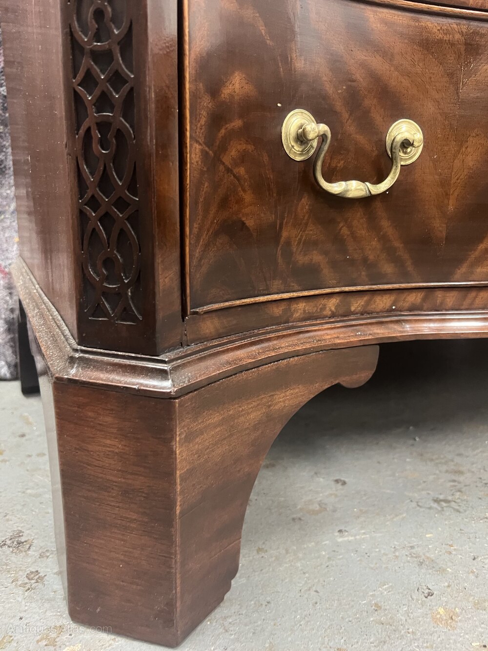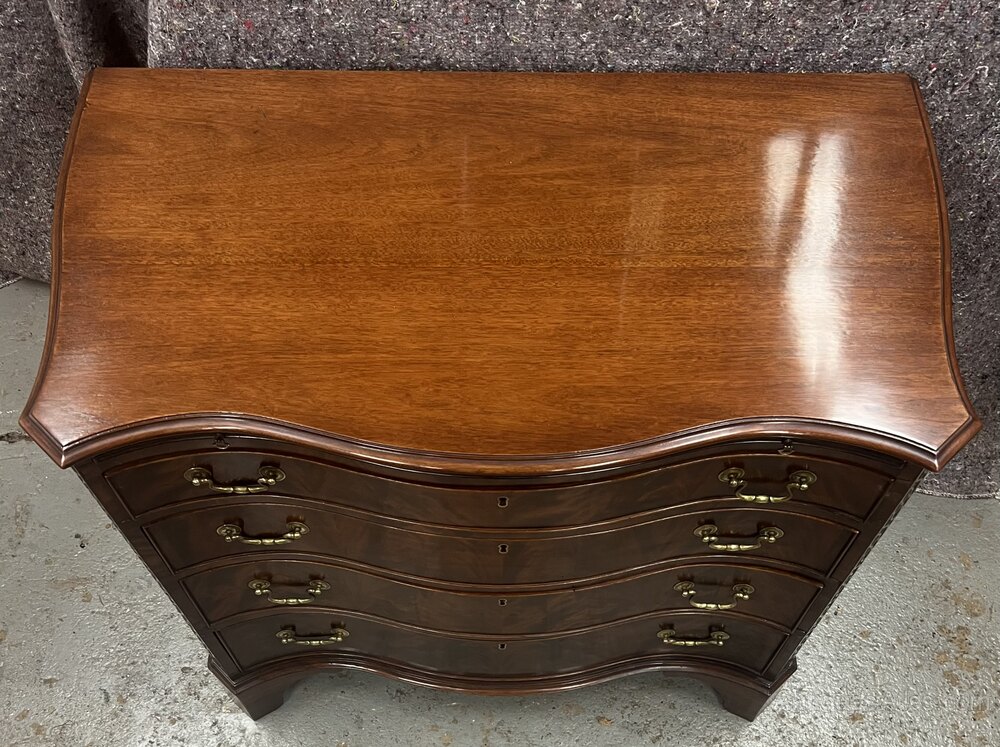 A very good 19th.Century Chippendale style figured mahogany bachelors chest of serpentine form with canted corners. The solid mahogany top having a moulded edged above the cock beaded brushing slide with axe head pulls. Below are 4 graduated and cock beaded serpentine shaped drawers retaining the original brass swan neck handles and escutcheons with solid oak linings throughout. The canted corners having Chippendale style blind fret carving and the whole raised on off set shaped and canted bracket feet. Dimensions:- Height…35’’/ 89cm. Width…40’’/ 102cm. Depth…21’’/ 53cm. Delivery to most of U.K. mainland £60.ALL TRADE ENQUIRIES WELCOME.