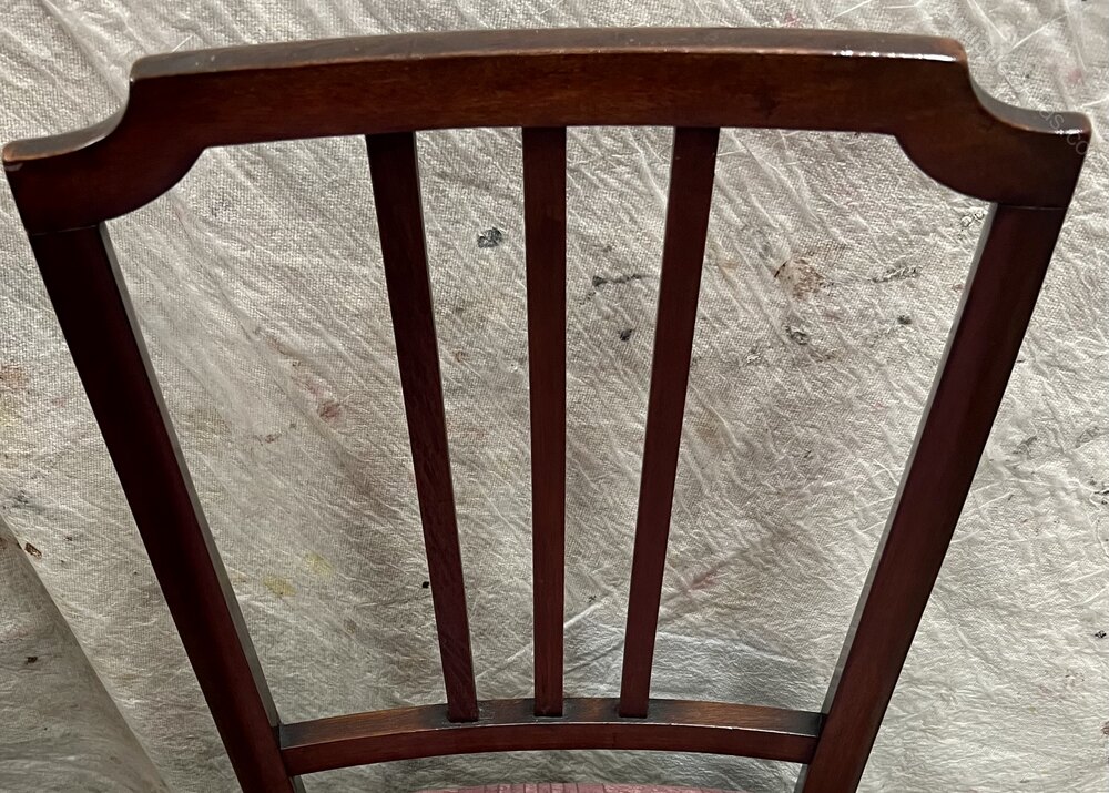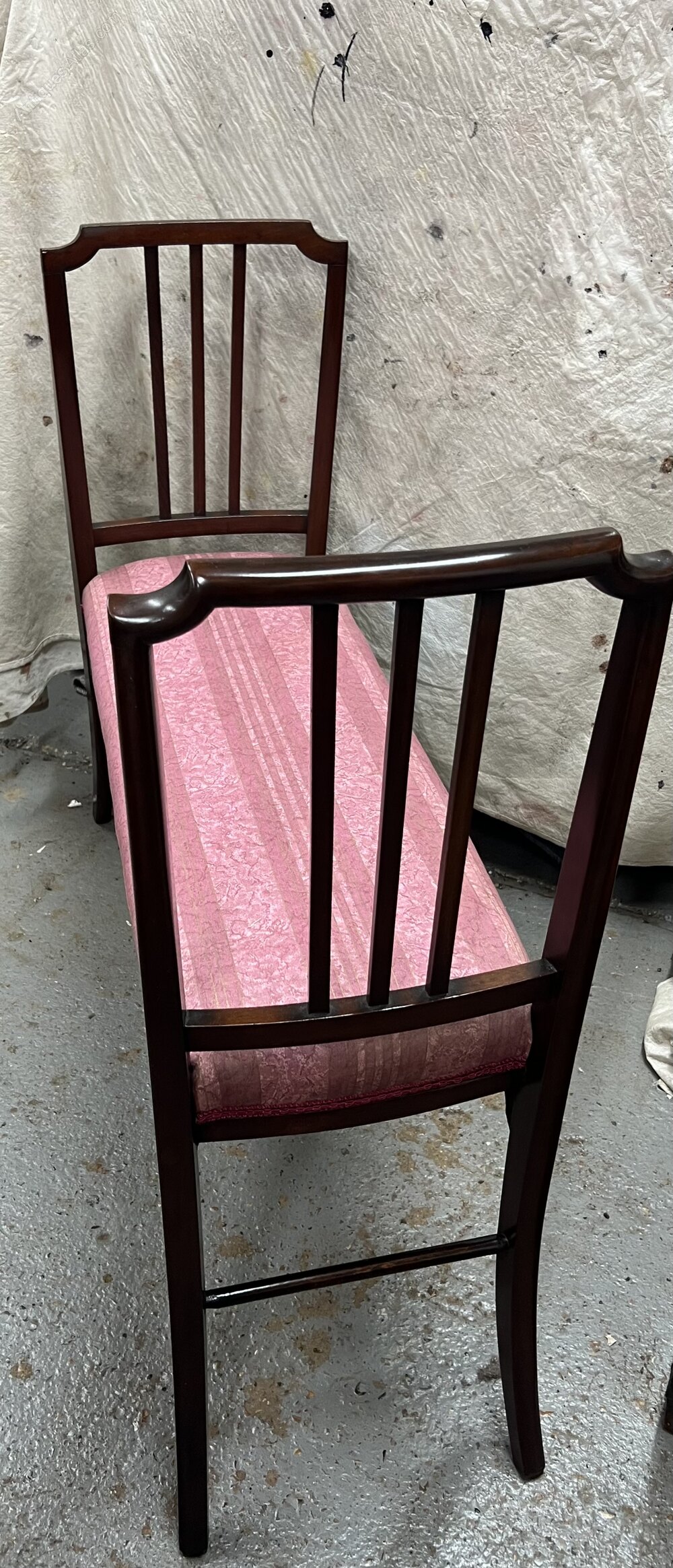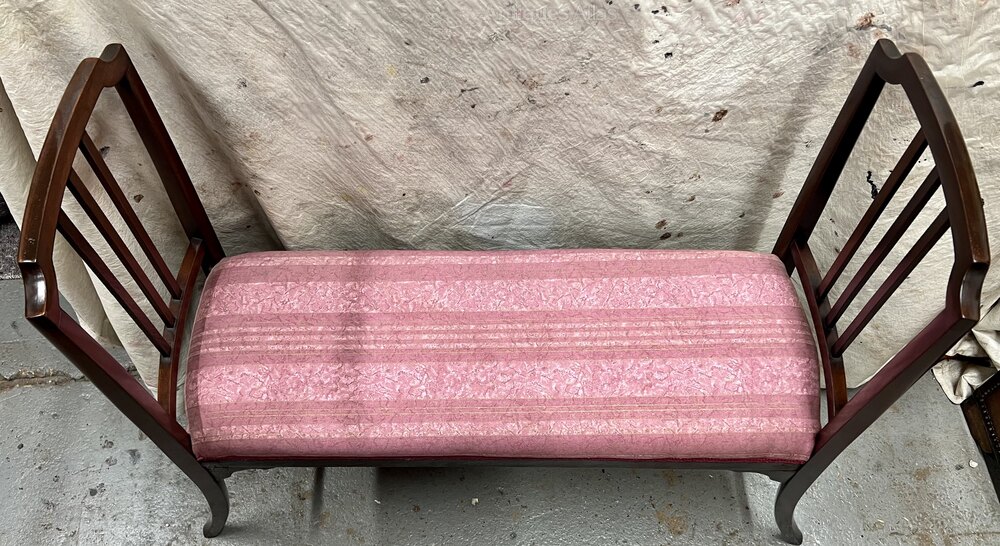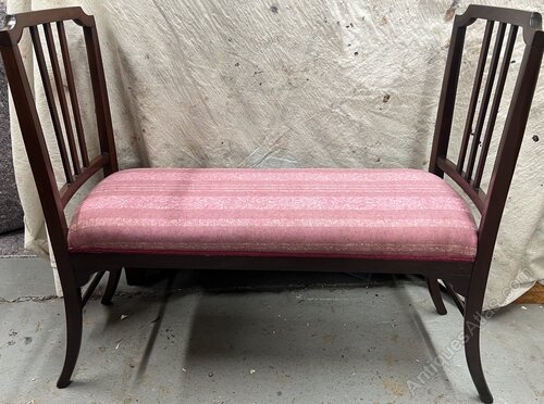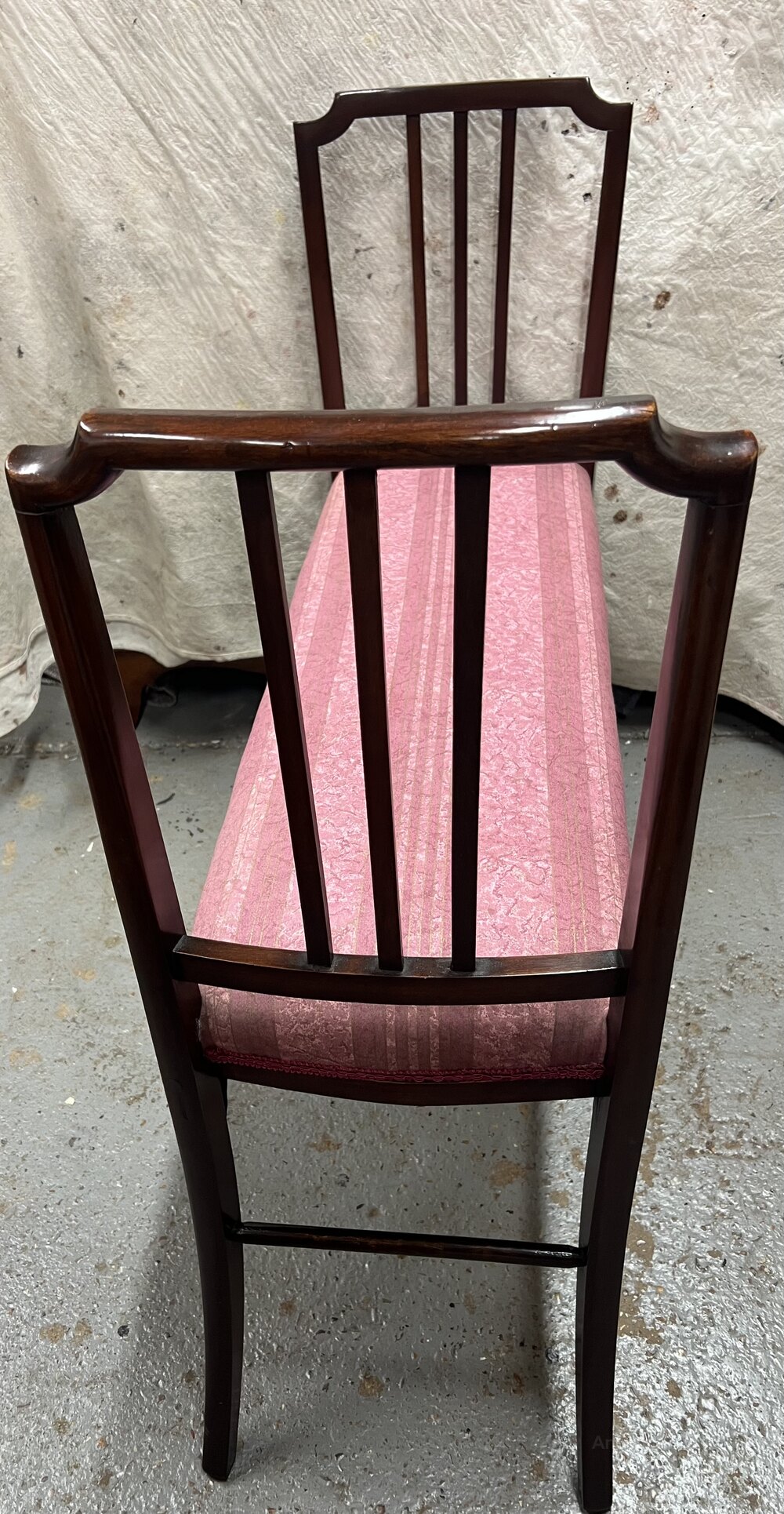 Edwardian mahogany chair back window seat. The sides having shaped and slatted supports and raised on out-swept legs with strengthening corner brackets. The pink striped stuff over seat upholstery is in good serviceable order but would benefit from a new top cover. Dimensions:- Height…35''/ 89cm. Width at Floor…43''/ 109cm Depth…14''/ 35.5cm. Seat Height…20''/ 51cm. Delivery by furniture carrier £50.ALL TRADE ENQUIRIES WELCOME.