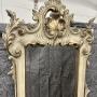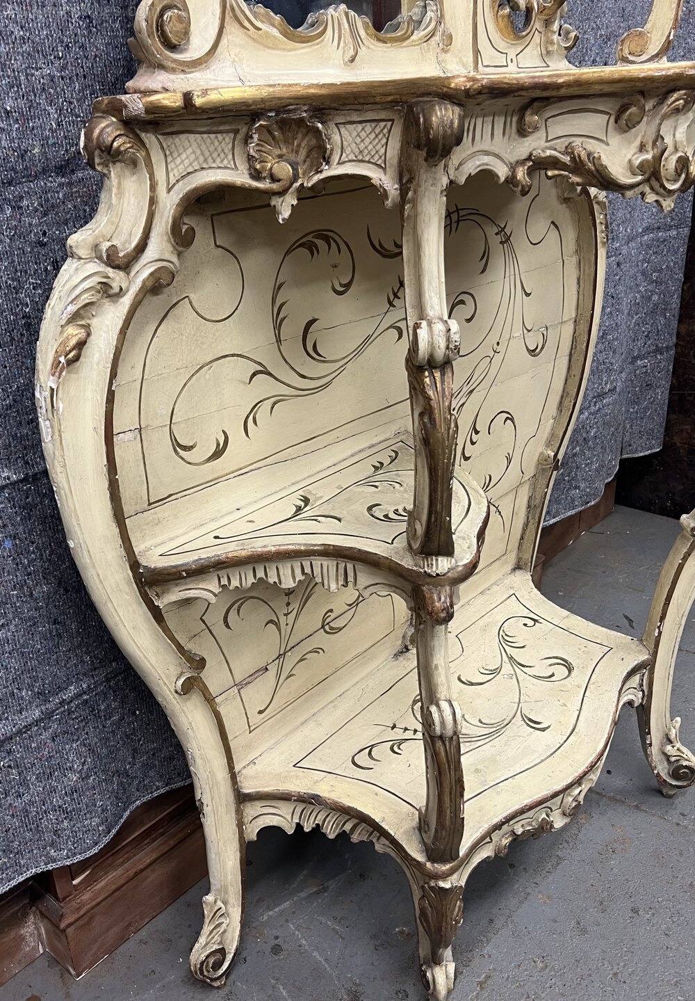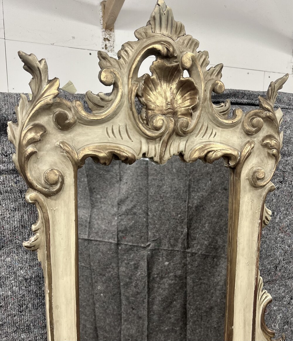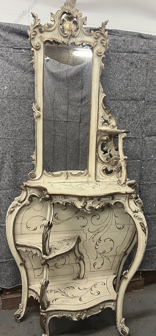 A late 19th C. Venetian, Shabby Chic Rococo painted and gilded console table with mirror of asymmetrical design. The mirror having scrolls and foliage carving with shaped shelf and open carving to the right side with a carved “C” scroll support. The base of bombe form with serpentine front above a carved frieze joining the 3 shaped cabriole supports. To the left is a shaped shelf with further “C” scroll supports above a lower shelf. The whole in shabby chic condition with several signs of wear which add to the character of this unusual console table. Dimensions:- Max.Height…88’’/ 223.5cm. Base Height…42.5’’/ 108cm. Top Height…45.5’’/ 115.5cm. Max Width…41.5’’/ 105.5cm. Max Depth…15.5’’/ 39.5cm. Delivery by furniture carrier £75.ALL TRADE ENQUIRIES WELCOME.