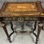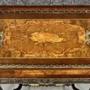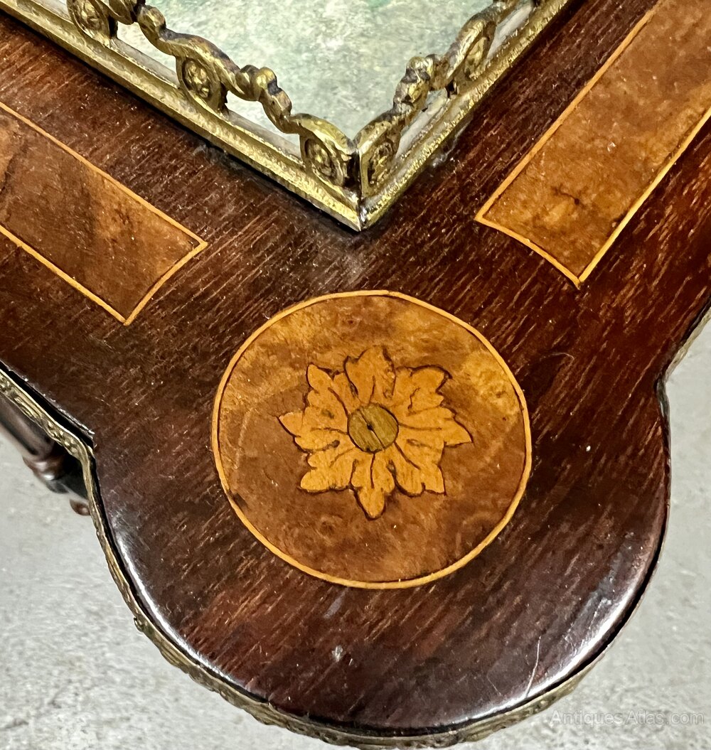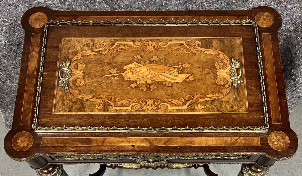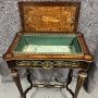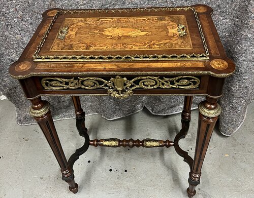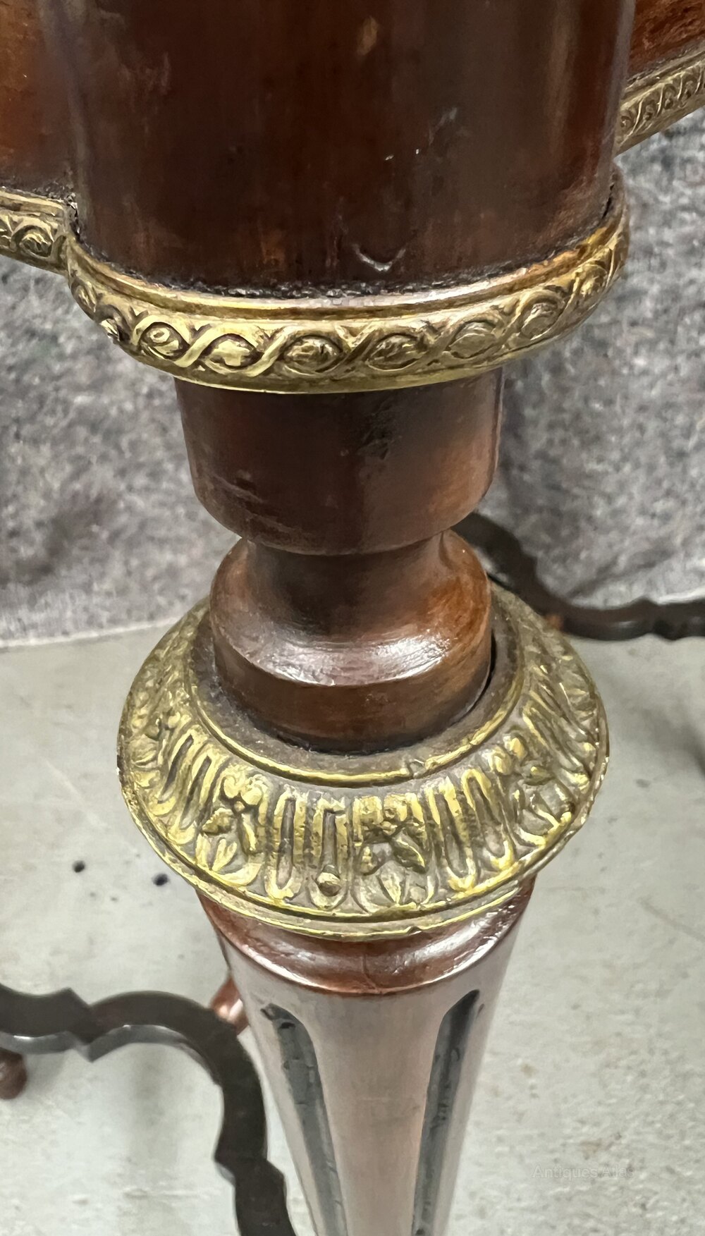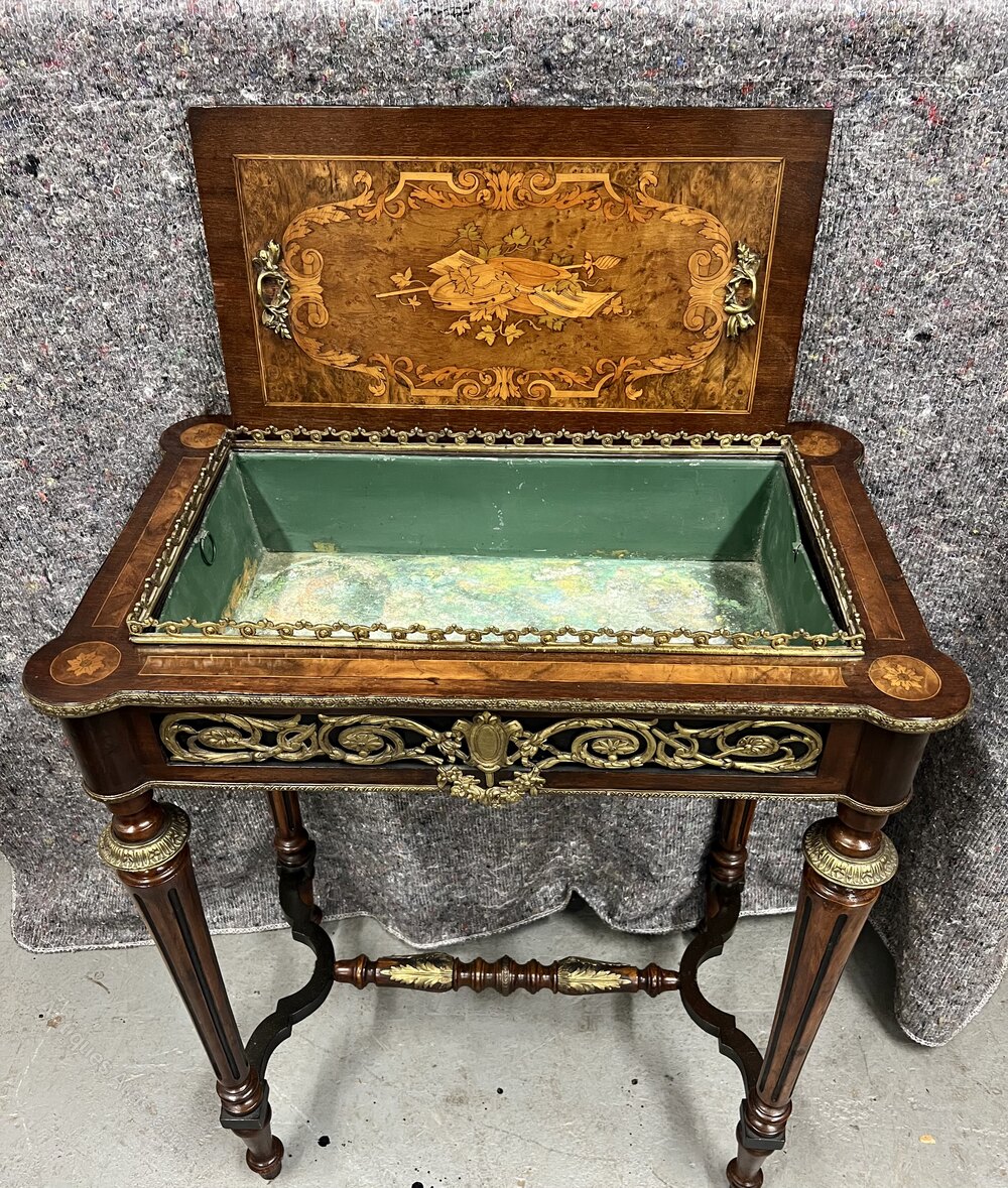 A beautiful and good quality 19th C. planter, plant stand or jardiniere. The removable marquetry lid inlaid with musical instruments and vine leaves in birds eye maple, walnut, box wood, satinwood and green stained sycamore, all set within a mahogany border with gilded handles. The interior retaining the original green metal liner which sits in the mahogany and inlaid frame having rounded corners with marquetry patrae and gilded brass pierced gallery. The frieze having further mounts to all sides and supported on 4 turned, tapering and reeded legs with further gilded mounts joined with supporting stretchers and mounts. Condition- Very good and original. Plants and flowers etc. can be displayed when in flower and when not the lid can be replaced and used as a side of lamp table. Dimensions:- Height…30’’/ 76cm. Width…24’’/ 61cm. Depth=..15’’/ 38cm. Interior liner dimensions:- Height…3.75’’/ 9.5cm. Width…18’’/ 45.5cm. Depth…10’’/ 38cm. Delivery by furniture carrier £50.ALL TRADE ENQUIRIES WELCOME.