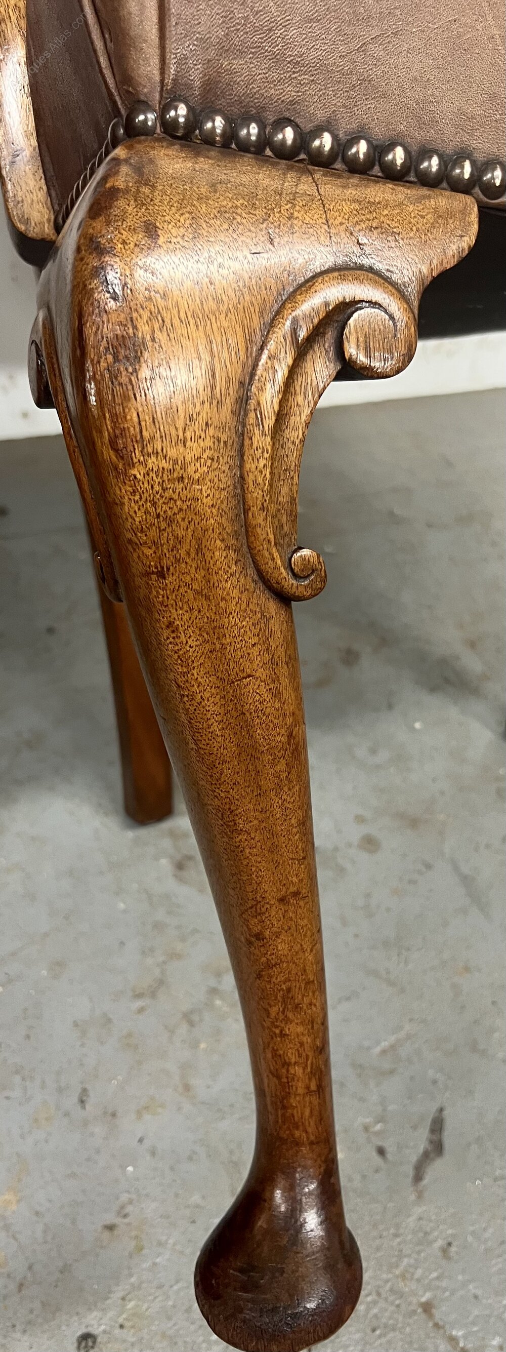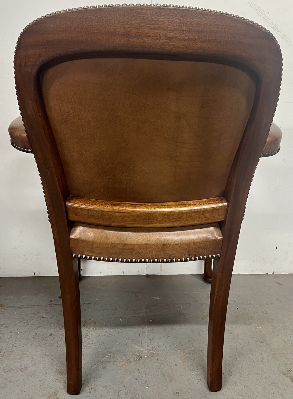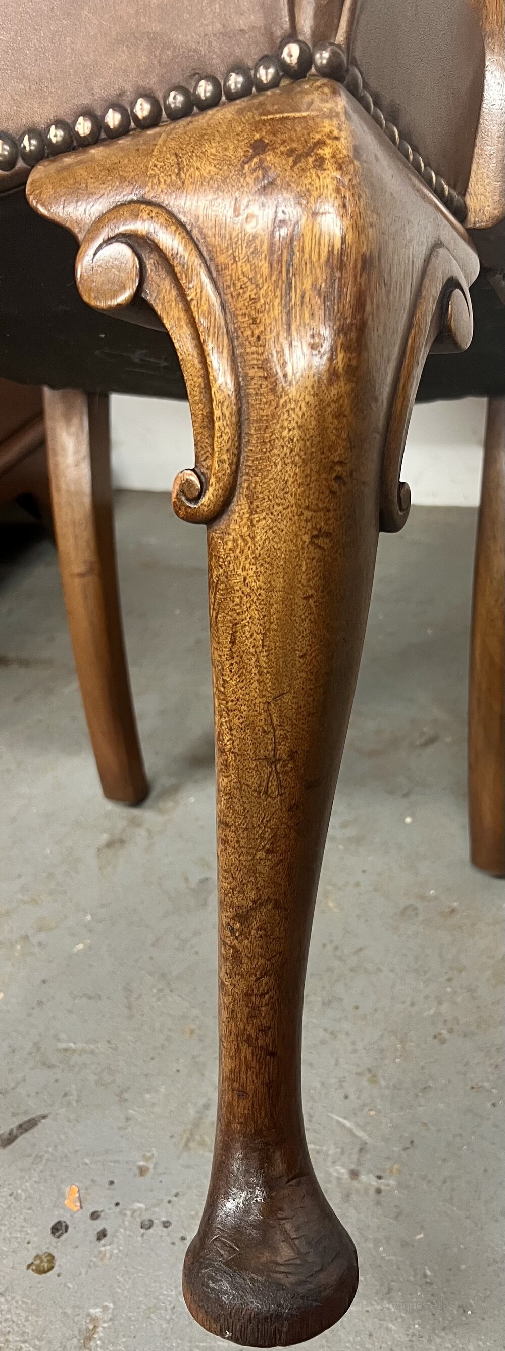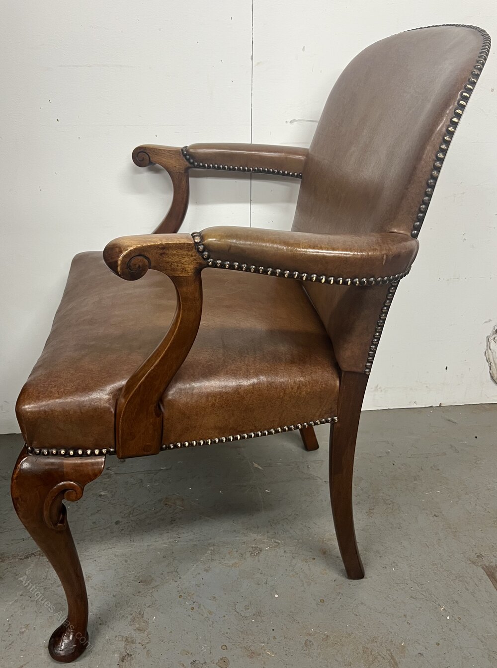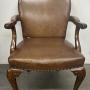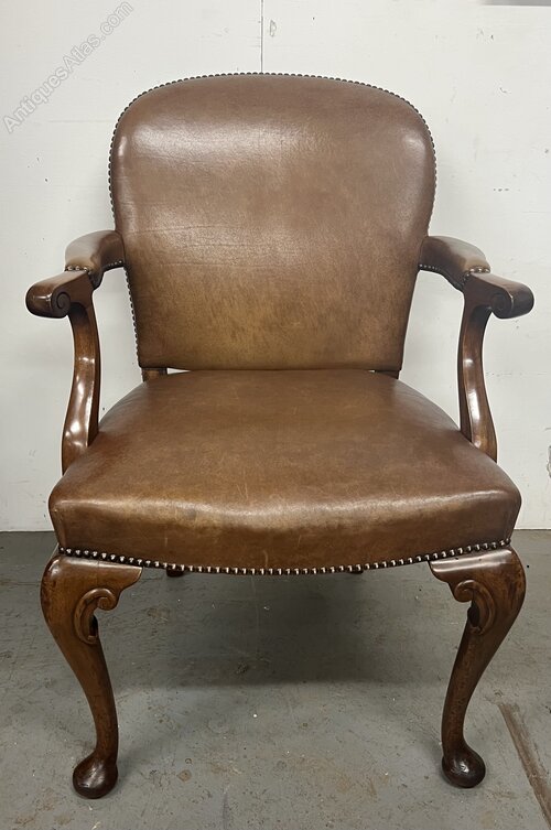 A good 1920’s mahogany and brown leather desk chair. The padded back, seat and open arms having brass studded detail, the whole raised on Queen Ann style cabriole legs with carved “C” scrolls and pad feet. Condition- very good, no damage or repairs. Dimensions:- Max. Height…37’’/ 94cm. Width…24’’/ 61cm. Depth…27’’/ 68cm. Seat Height…21’’/53cm. Delivery by furniture carrier £48.ALL TRADE ENQUIRIES WELCOME.