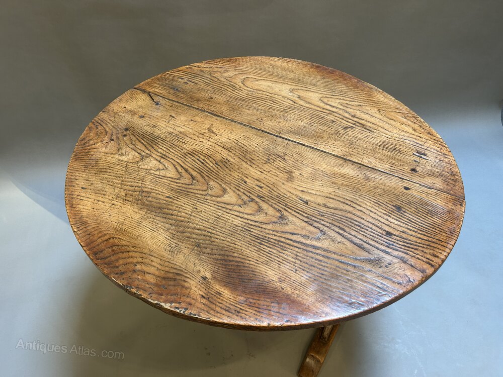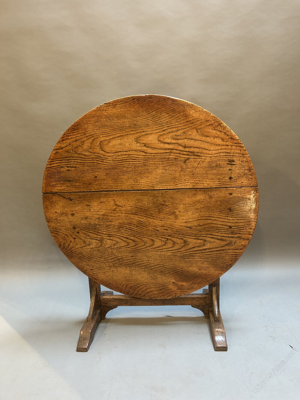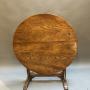 a C19th very decorative ash vendange (wine-tasting) table, the circular folding top of great figure and buttery colour raised on fruitwood base - the top with a little twist, the base with a little wobble in accordance with age & usage , the whole with masses of decorative character.70h x 99 x 99