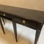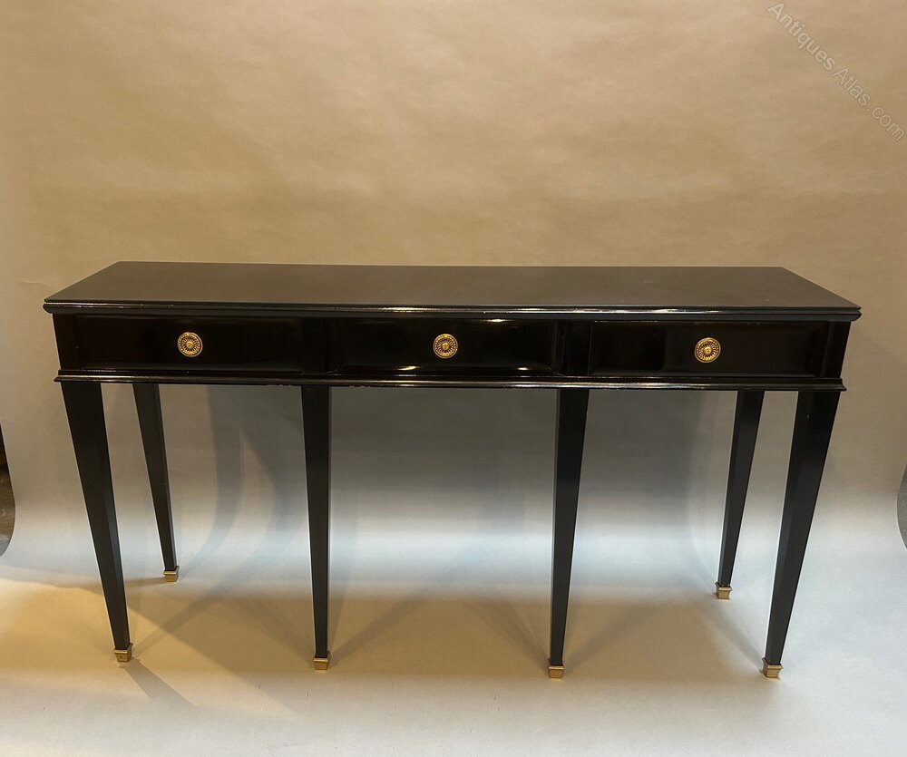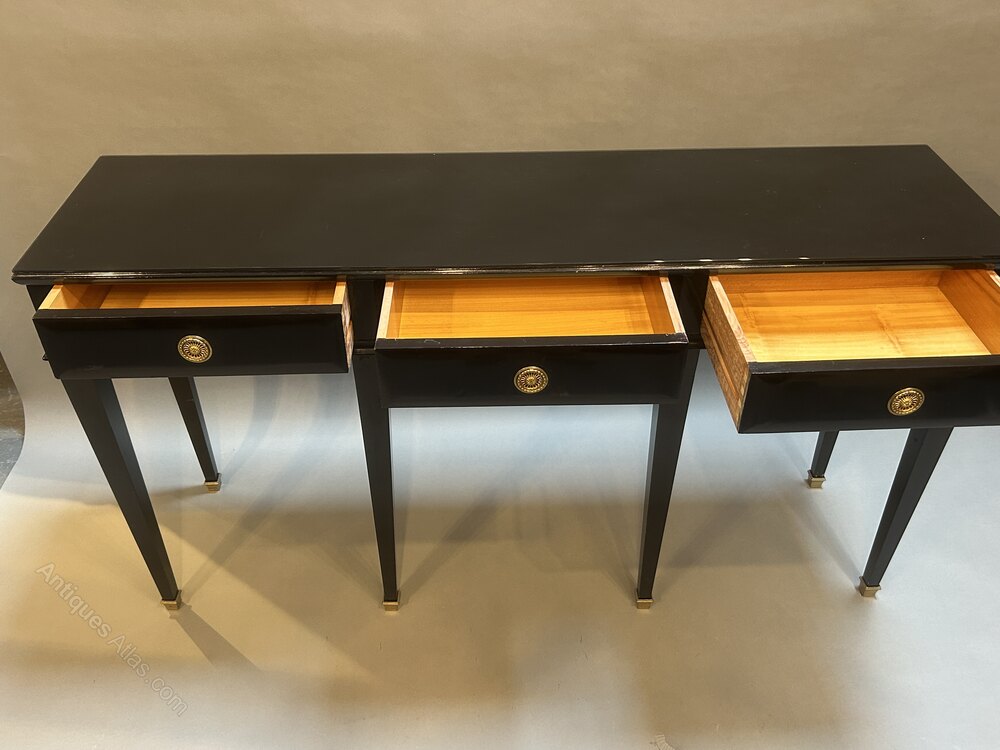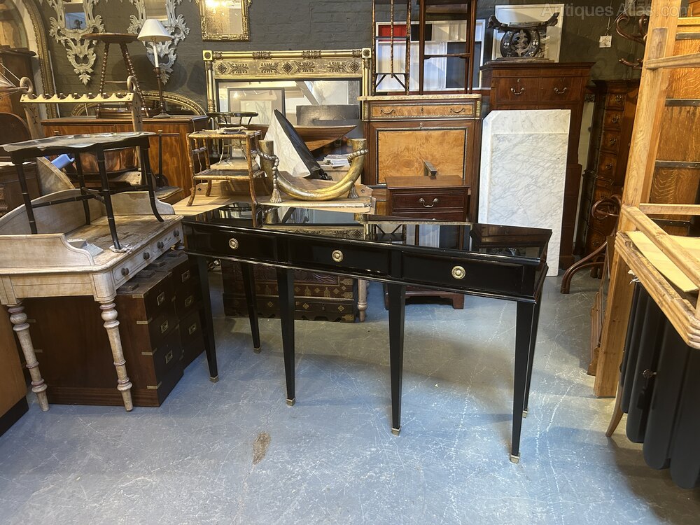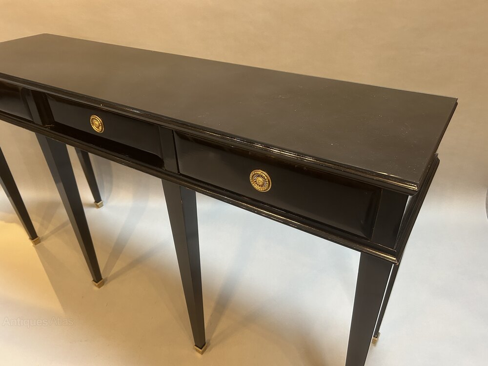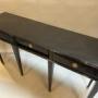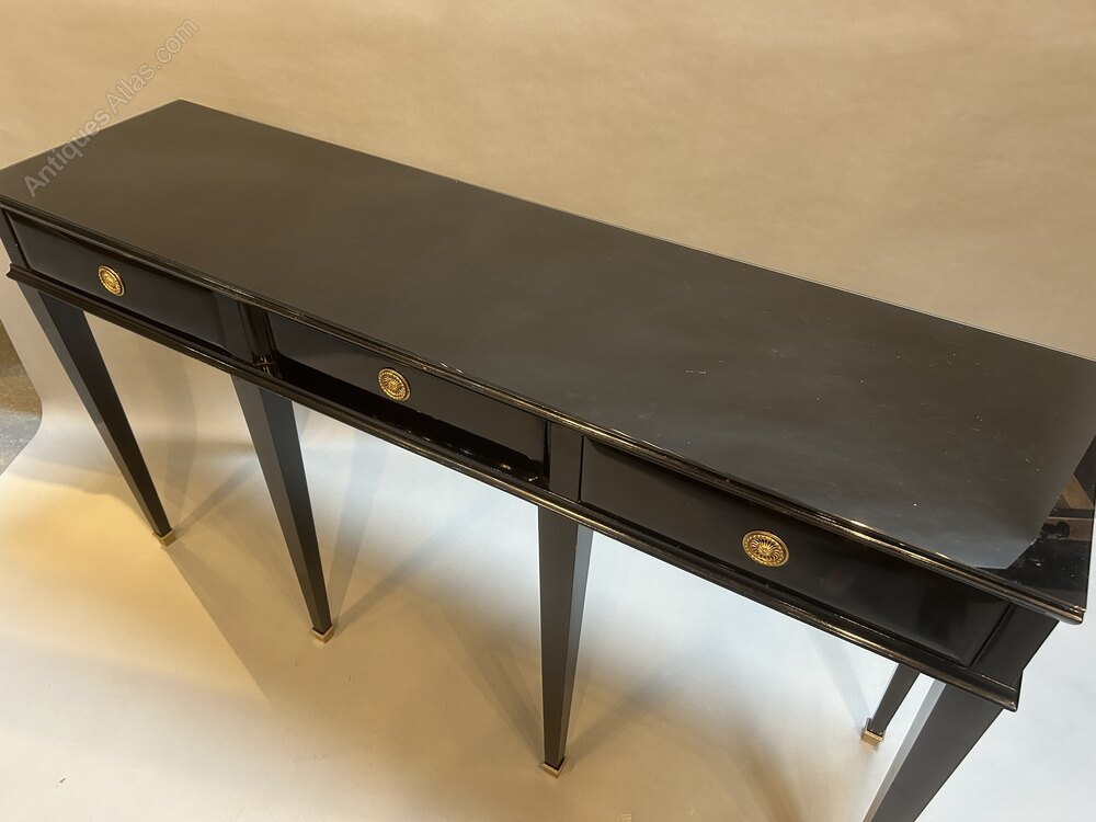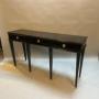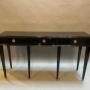 Circa 1930s Italian console table, black lacquered fitted 3 frieze drawers with gilt ring handles, raised on 6 tapering supports to gilt sabot.92x 164w x 44d