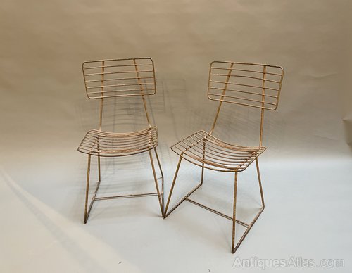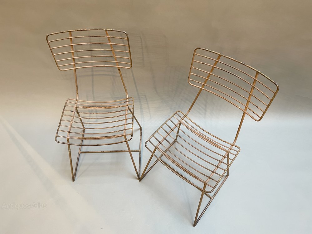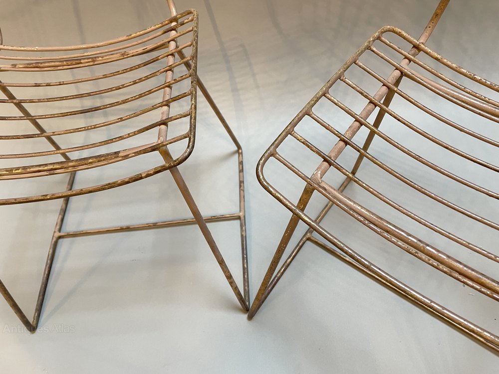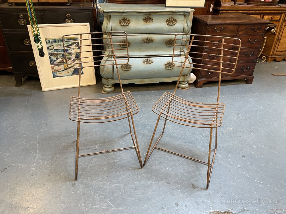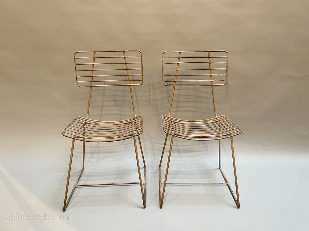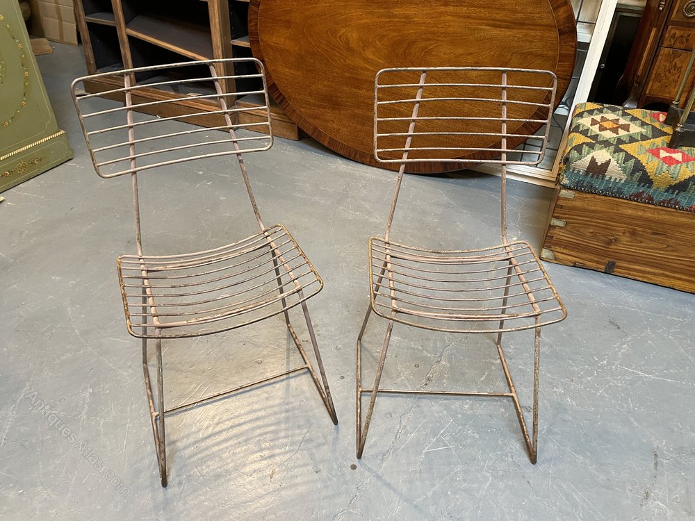 a stylish pair of (probably) Italian mid- Twentieth Century side chairs, with distressed painted finish to steel frames.DateRetro