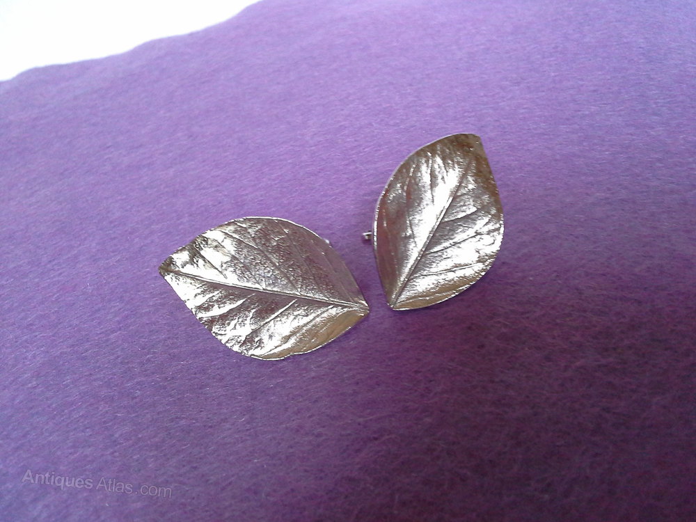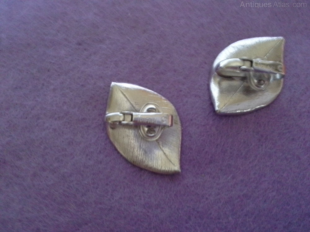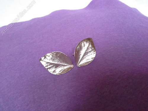 A very nice pair of Crown Trifari silvertone earrings in the shape of leaves, showing good detailing of leaf veining and texture. The earrings are in very good condition and the clips are positive and secure. They are comfortable to wear and measure approx. 2.8cms in length and are 1.9cms at their widest point.Items are shipped using Royal Mail 'Signed For' Service in the UK, charged at cost.