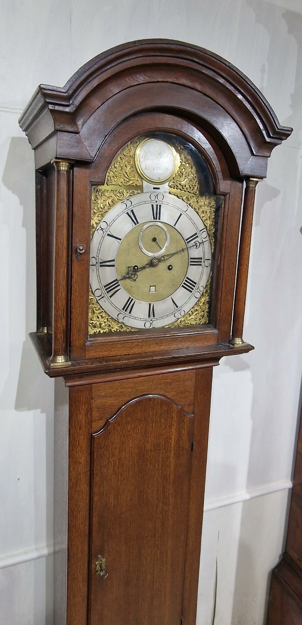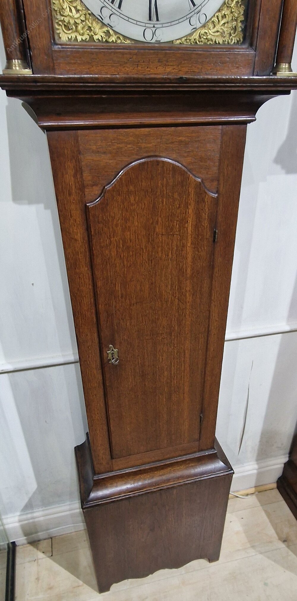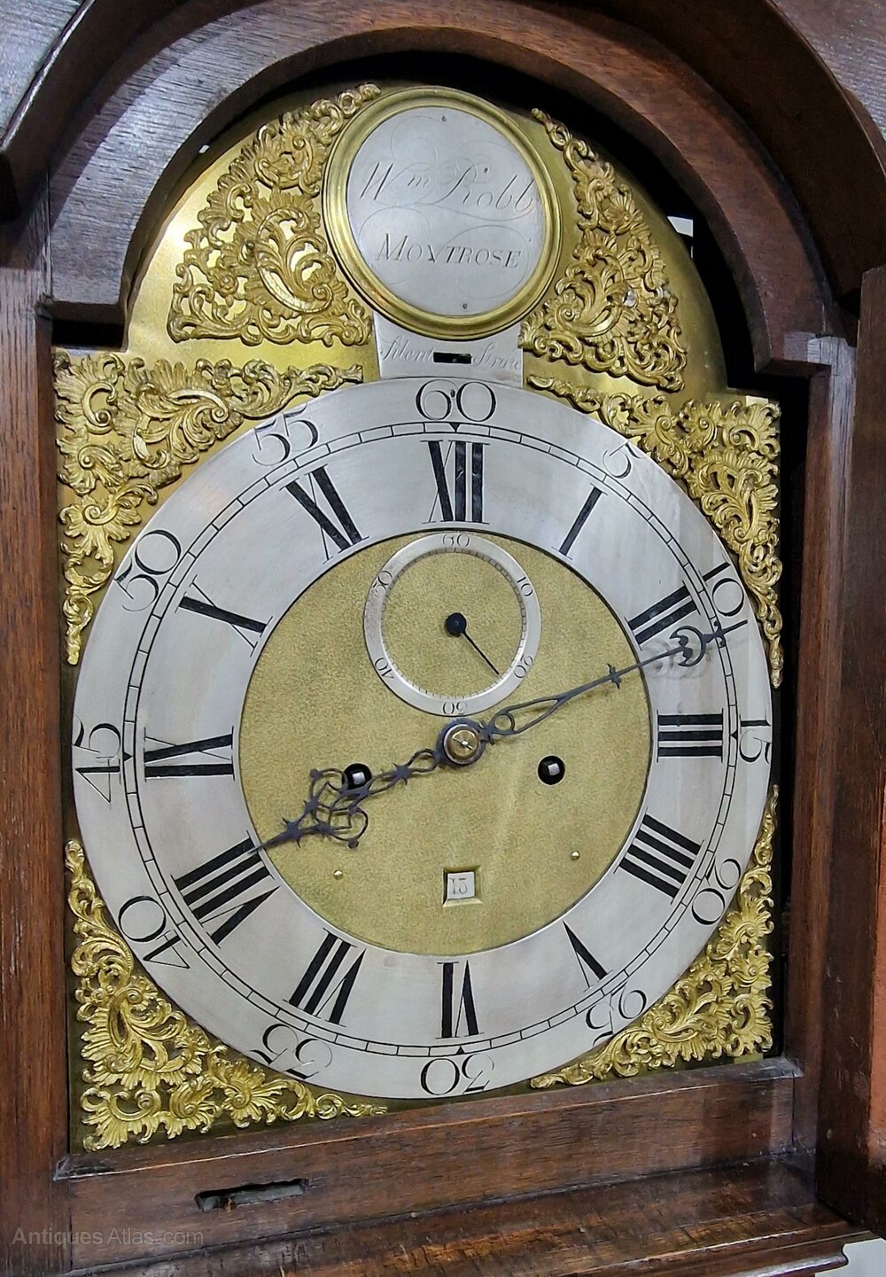 A quality Scottish Georgian longcase clock. A smaller, well proportioned oak case with an arched trunk door. An arched hood pediment with brass capped front and rear hood columns. An arched brass and silvered dial signed to the circular arch boss 'Wm Robb Montrose'. A strike/silent lever to the arch below the name boss and date and seconds dials. A quality 8-day duration mechanism striking the hours on a bell. Circa 1770.William Robb of Montrose is recorded in Whytes' 'Scottish Clock & Watchmakers' book as working from 1746-1780. He was an important and highly talented clockmaker and he is illustrated on the front and back cover of the book with a complicated astrological clock.