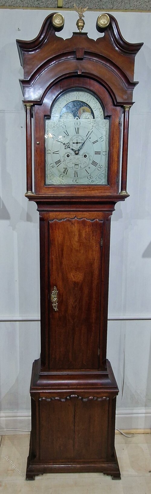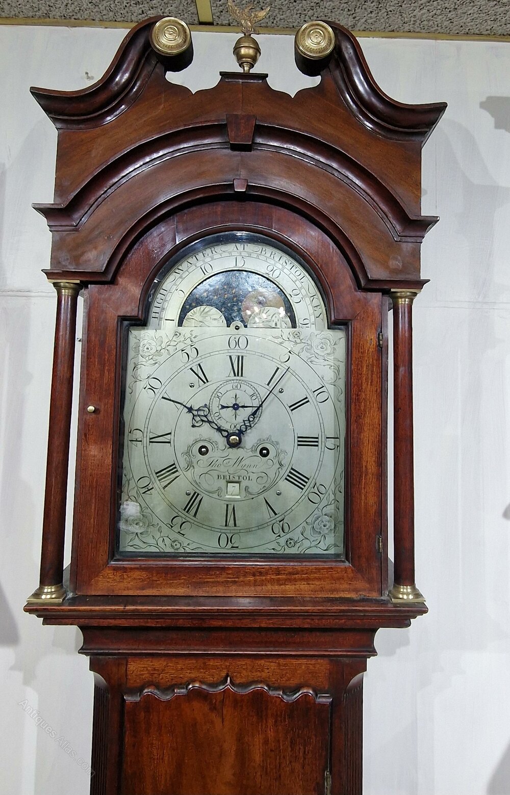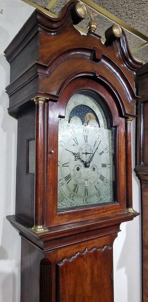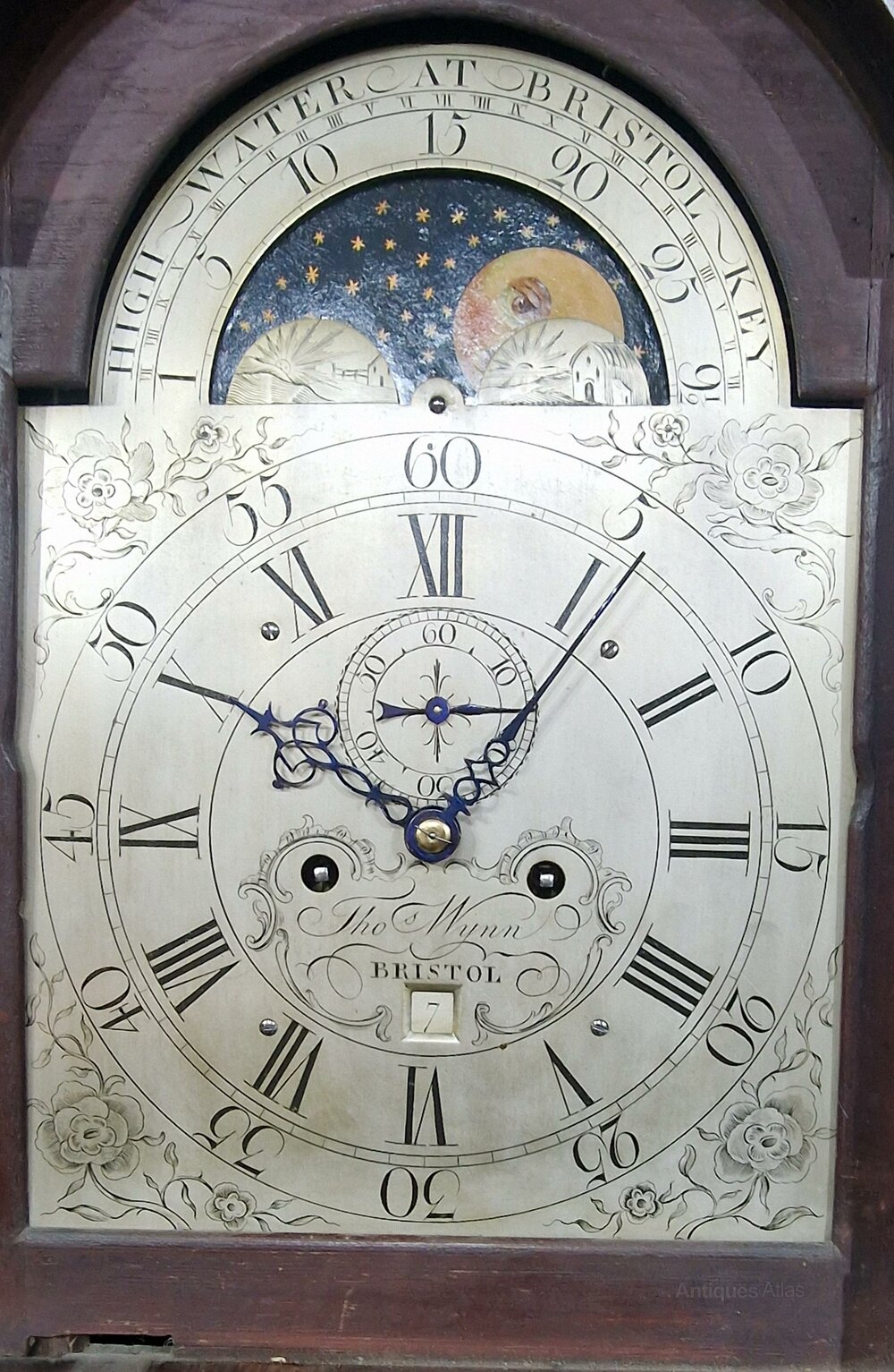 An impressive and elegant Georgian mahogany longcase clock. A fine quality case with a swan-neck pediment in the distinctive Bath and Bristol style. A mahogany case with brass capped hood columns and side glass hood apertures. An original central brass finial. A wavy hood door top and matching raised plinth panel. A very well engraved silvered dial with blued steel hands. A seconds dial, date aperture and lunar moon phases showing high water at Bristol quay. Signed to the dial 'Thos Wynn, Bristol'. An 8-day duration mechanism striking the hours on a bell. Circa 1775.Thomas Wynn of Bristol is recorded in A J Moores 'The Clockmakers of Bristol' book as working from 1763. He was married in 1763 in Almondsbury. Three Bristol high water clocks are noted in the book