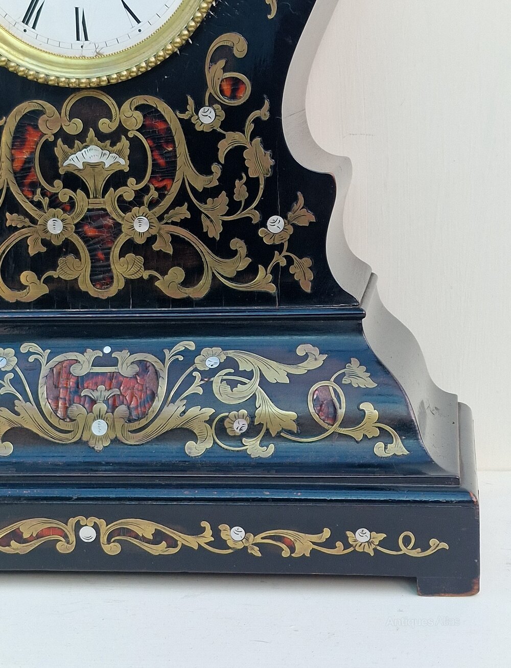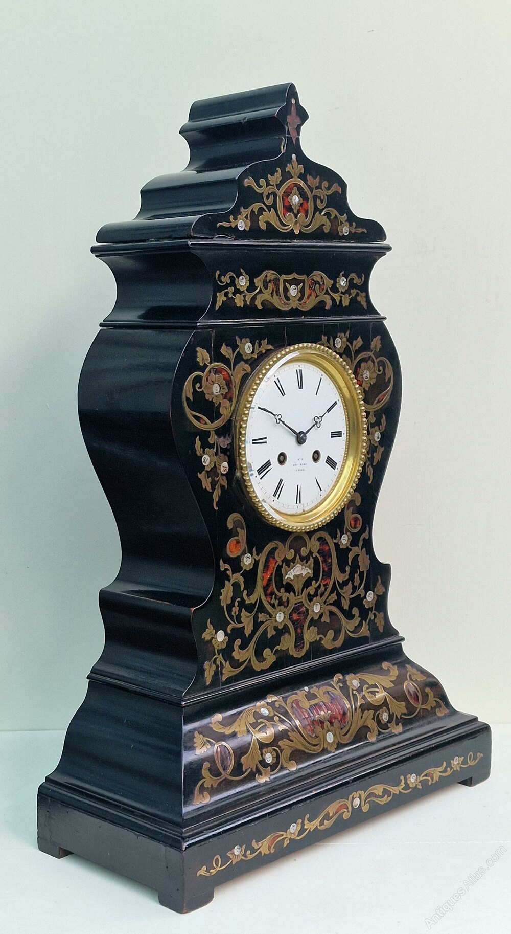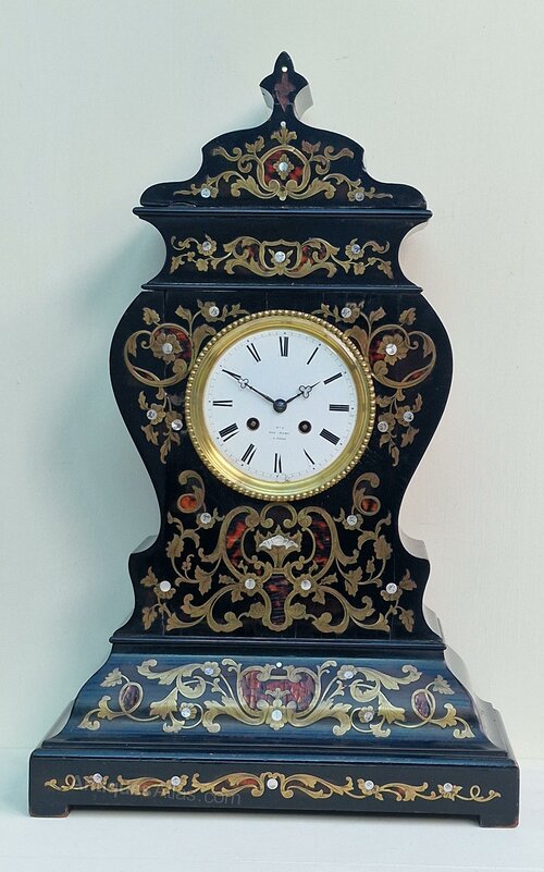 An quality inlaid mantel clock by Henri Marc of Paris. A multi coloured inlaid case over an ebonised background. An enamel dial with Roman numerals and blued steel hands signed by maker 'Hry Marc a Paris'. A well cast gilt dial bezel surround. An 8-day duration, silk suspension mechanism striking the 1/2 hours and hours on a bell. Circa 1850.Height 21" / 53cms Width 13" / 33cms Depth 6" / 15cms