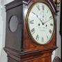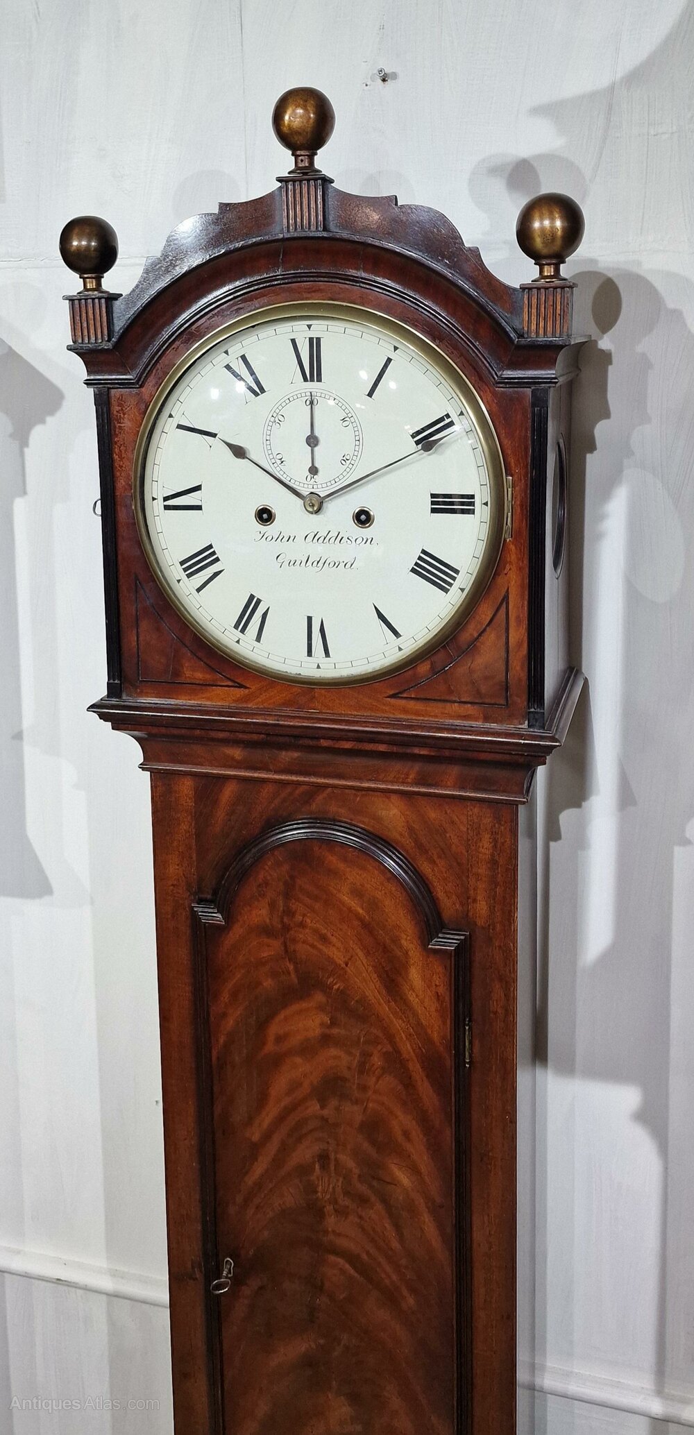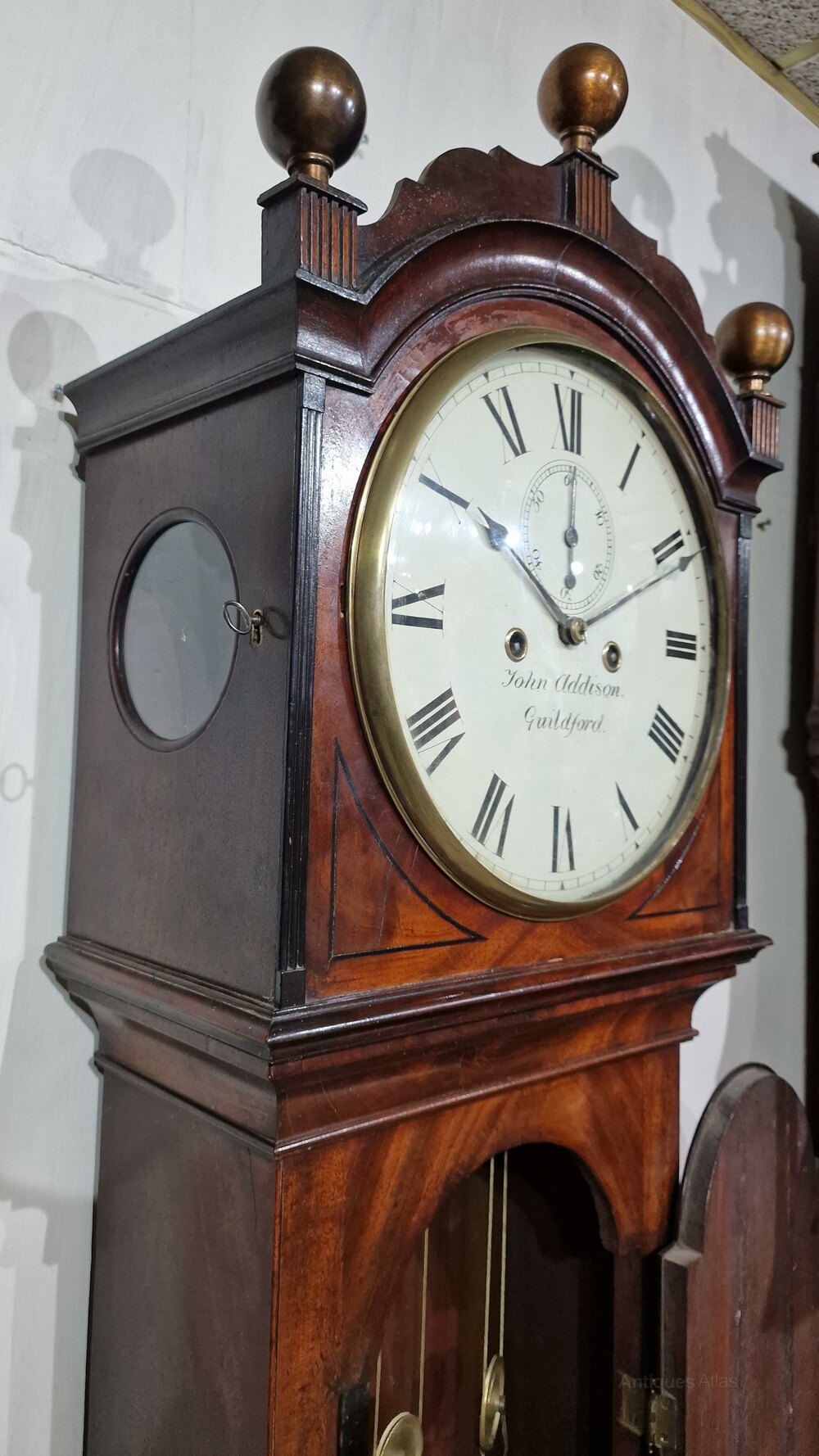 A small proportioned Regency mahogany regulator longcase clock. A slim case with an arched pediment surmounted by 3 gilded ball finials. Choice flame mahogany case veneers. Ebonised line inlays to the hood with fluted small side mouldings. A re-entrant base panel moulding as often seen on London area cases. A convex glass to the cast brass bezel. A circular painted dial with blued steel hands. A seconds dial and signed 'John Addison Guildford'. A fine quality, precision, 8-day duration mechanism striking the hours on a bell. It has a dead-beat escapement with maintaining power. Brass cased weights and a very heavy pendulum bob with a wooden rod as seen on most regulators. Circa 1825.John Addison of Guildford is recorded in Baillies' 'Watchmakers and Clockmakers of The World' book as working in the early 19th century.