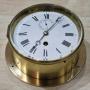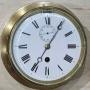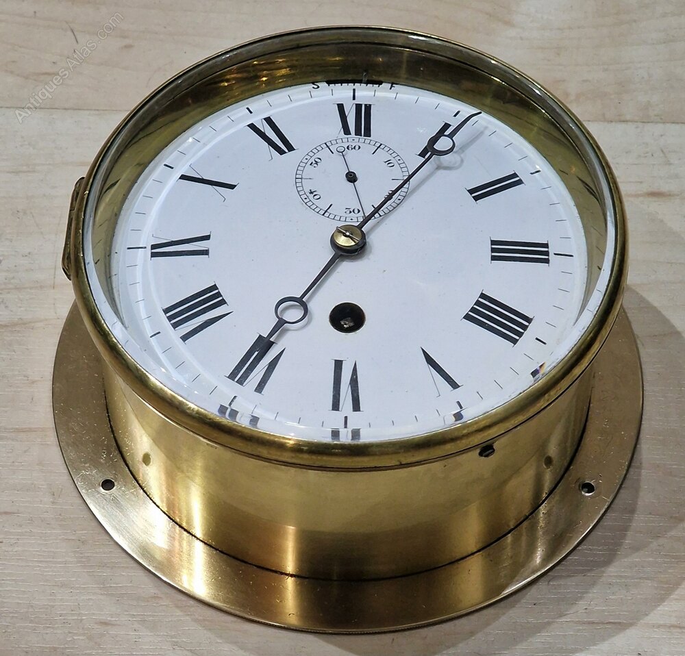 A small proportioned brass ships clock. Bevelled glass to the opening front bezel. A good quality brass case. A 5" enamel dial with a subsidiary seconds dial.Slow/Fast regulator at the top. Blued steel 'moon' hands. A 7-day timepiece mechanism. Circa 1920.Height/Width 6" / 15 cms Depth 3 " / 7 cms.