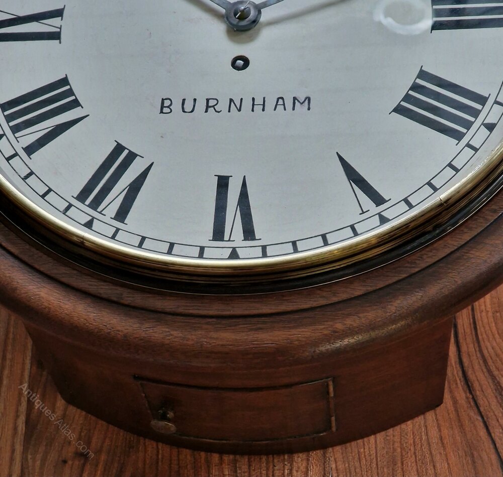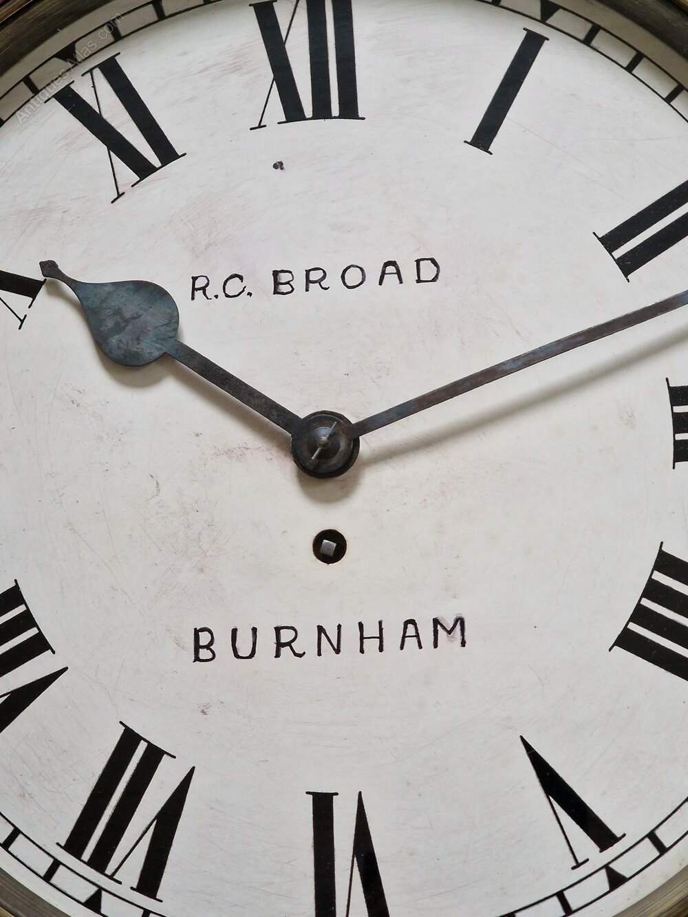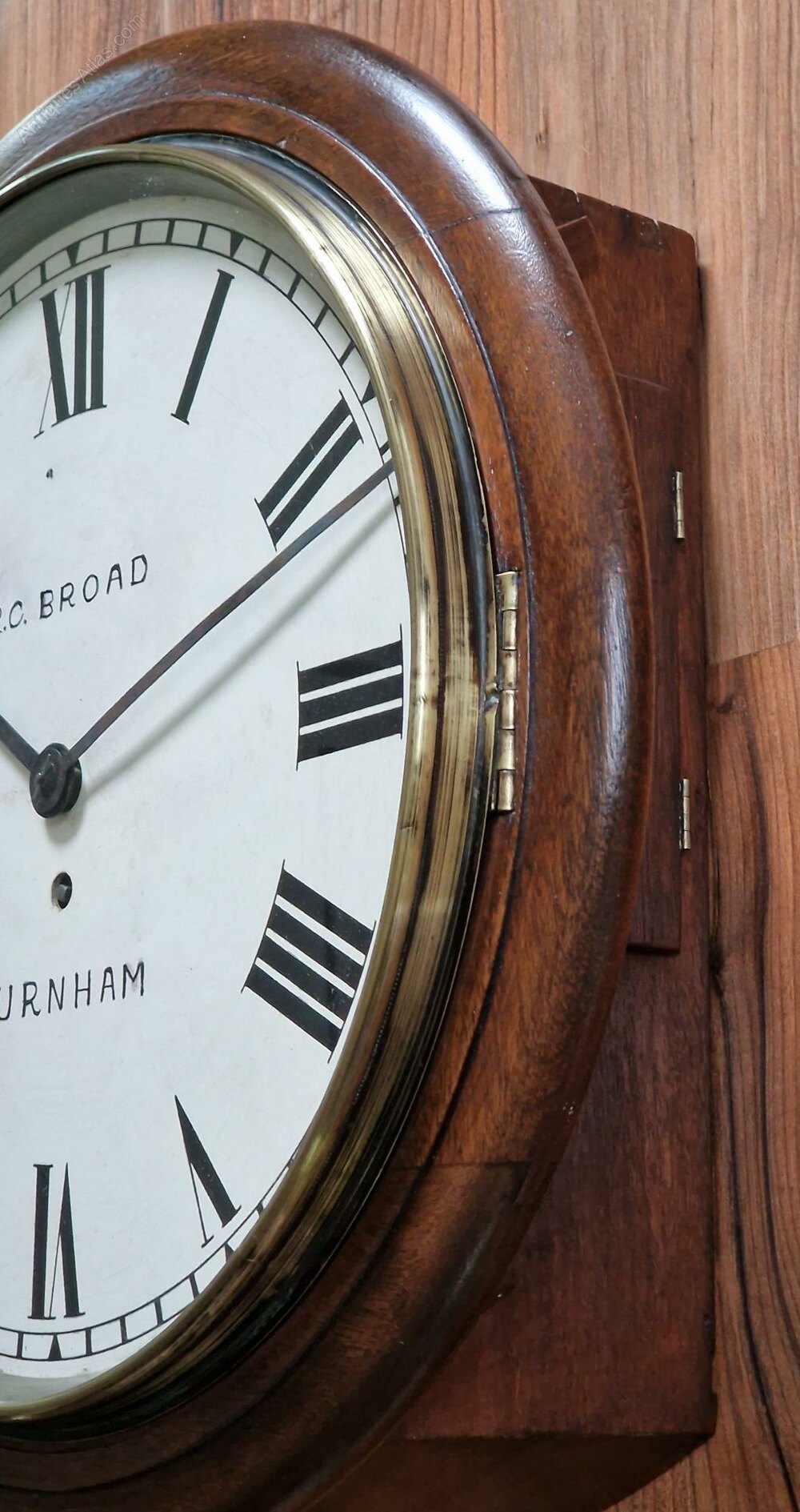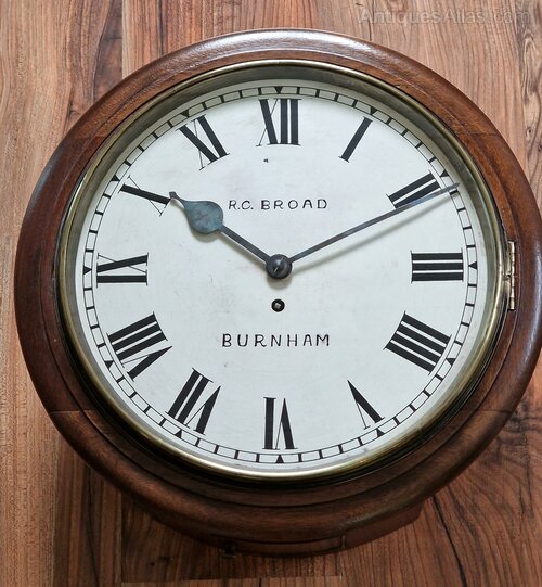 A larger 14" painted dial fusee wall clock. The dial is signed 'R.C. BROAD BURNHAM' with blued steel hands. A mahogany case with a brass bezel surround. An 8-day duration fusee timepiece mechanism. Circa 1900.Richard Broad is recorded in A J Moores ''The Clockmakers of Somerset'' book.