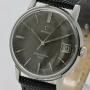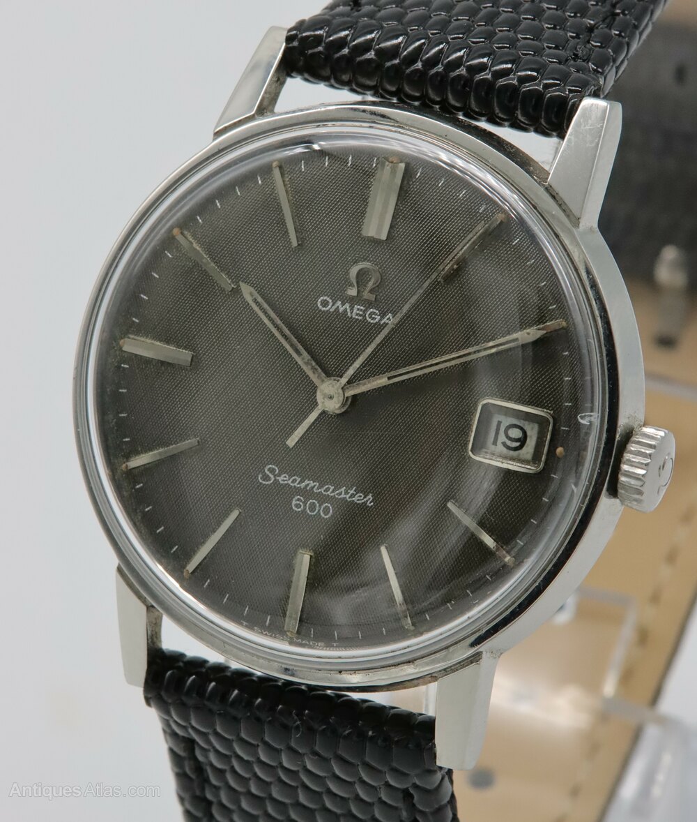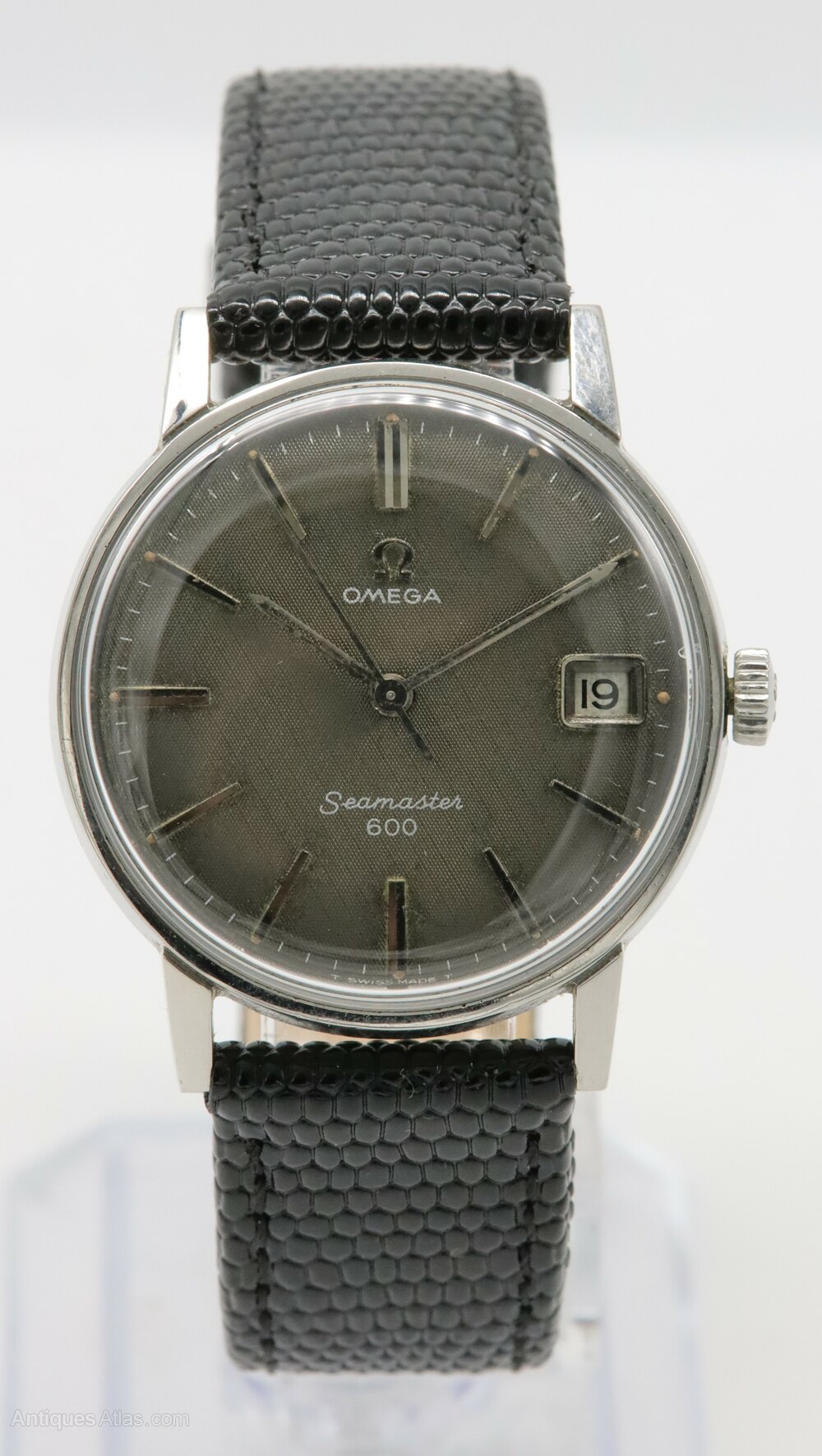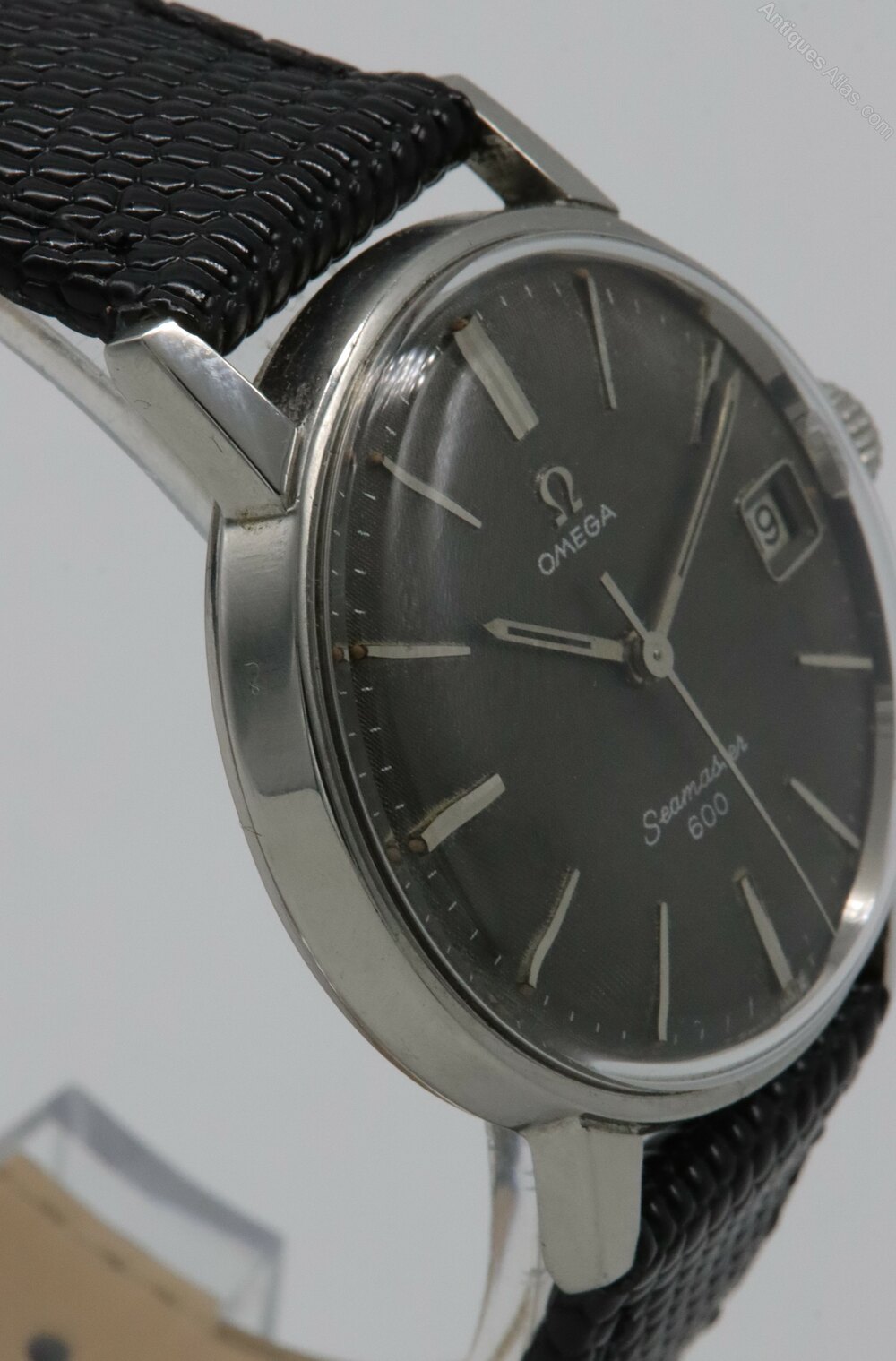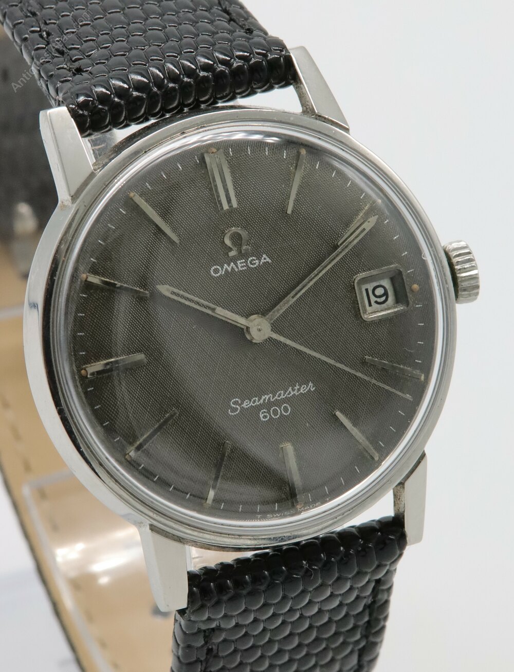 A 1966 Omega Seamaster 600 stainless steel wristwatch. A very rare dial, linen effect over the grey/black dial. Applied steel batons with faceted edges, backed by lume dots. An applied steel Omega logo, with a white print for 'Omega' and 'Seamaster 600'. The hours and minutes are indicated by slim steel 'pencil' hands. A date aperture to 3 o'clock surrounded by a steel frame. Signed 'Swiss Made' to 6 o'clock.A stainless steel case with a slim bezel surround to the dial. A screw down case back with the Omega 'Hippocampus' logo to the centre. Original Omega winding crown. The main case body is one piece, giving it a slim overall look. Case reference 135.011.