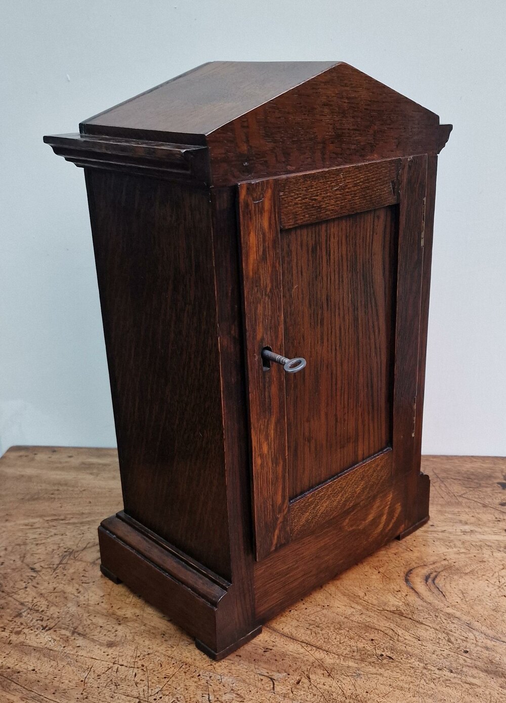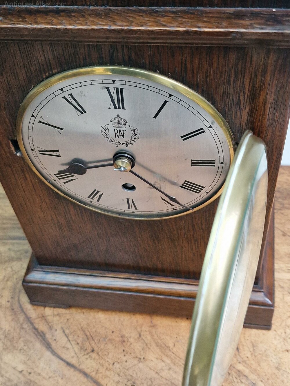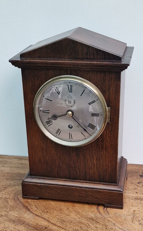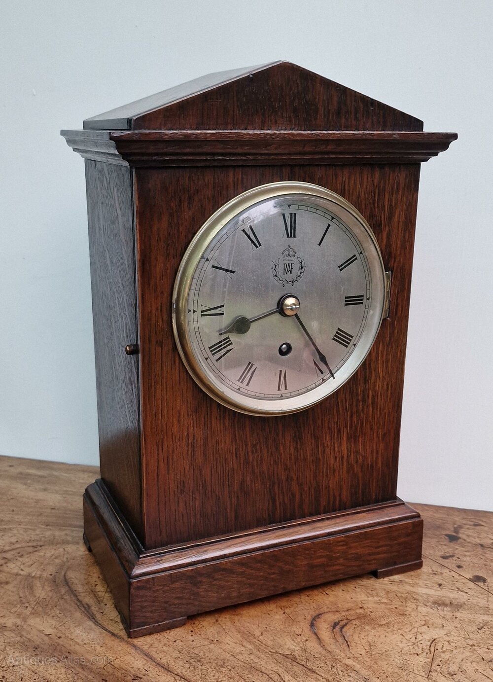 A historically important WW2 period RAF officers mess clock. An architectural pediment to the oak case. The original back door lock, key and winding key. An engraved silvered dial with the RAF laurel emblem and blued steel hands. Convex glass to the case brass bezel with the original latch and push button side release.An 8-day duration precision English fusee mechanism no. 4896 by F.W. Elliott in 1938.