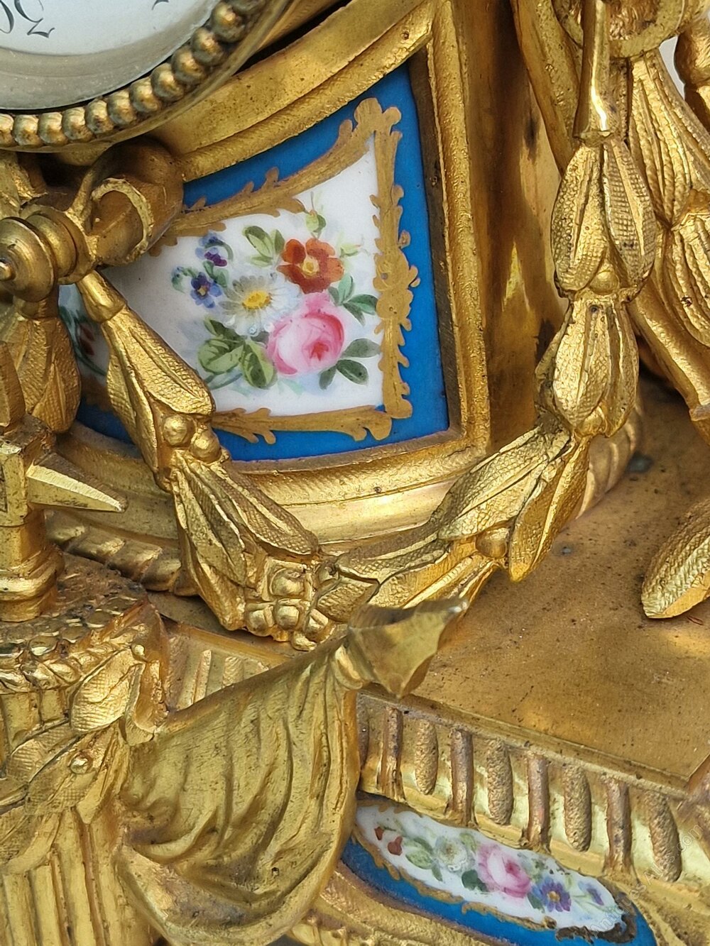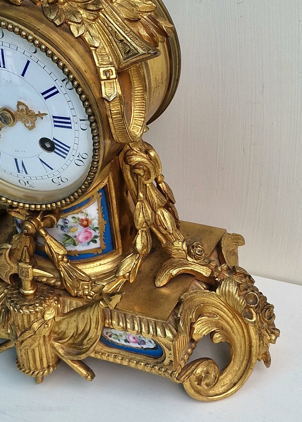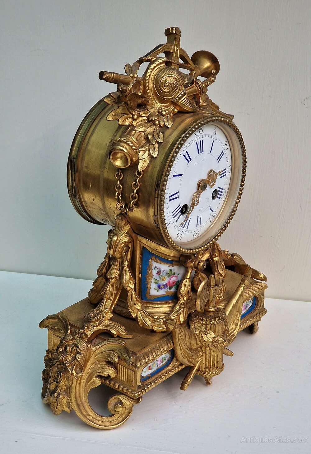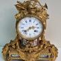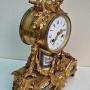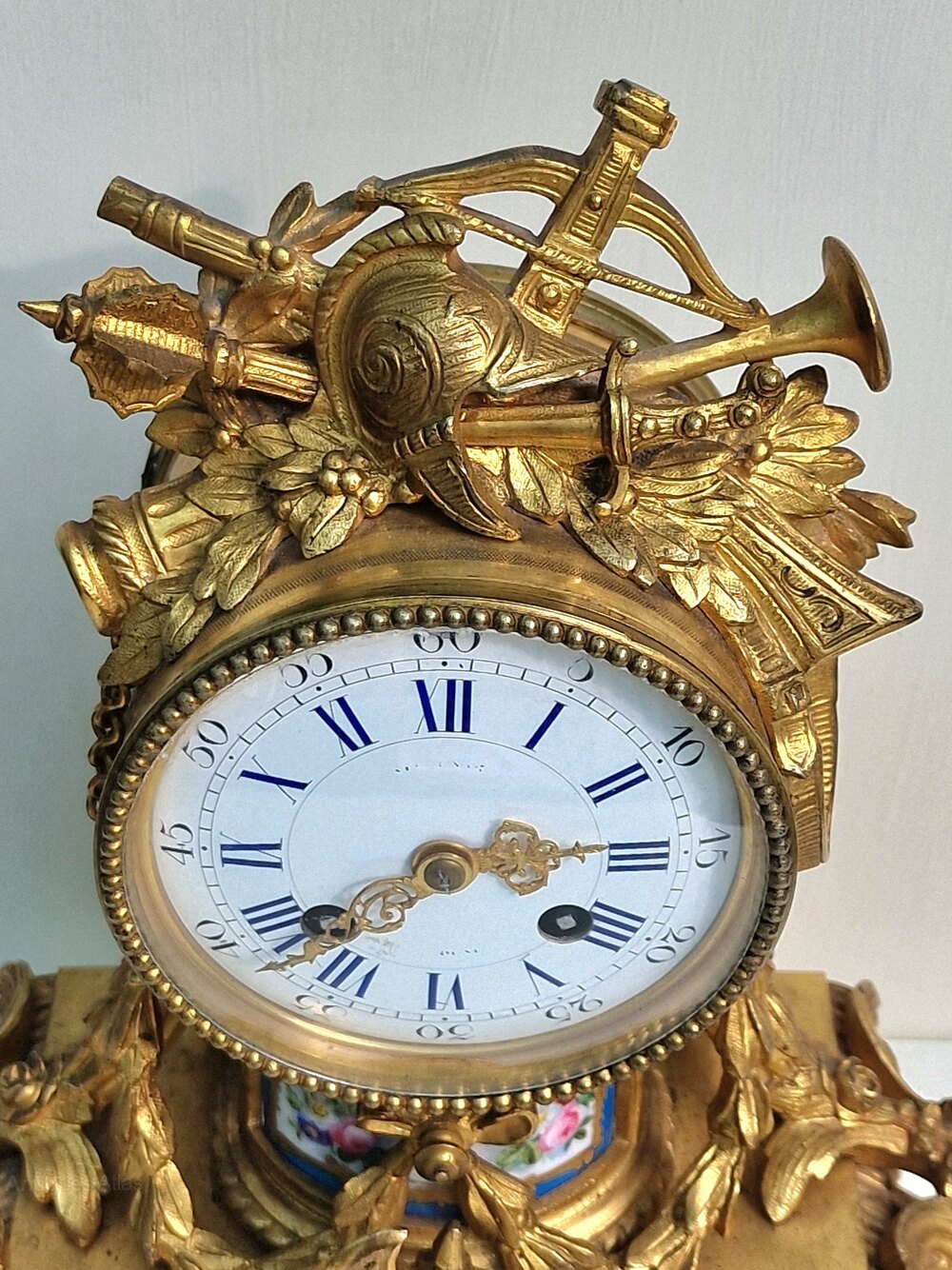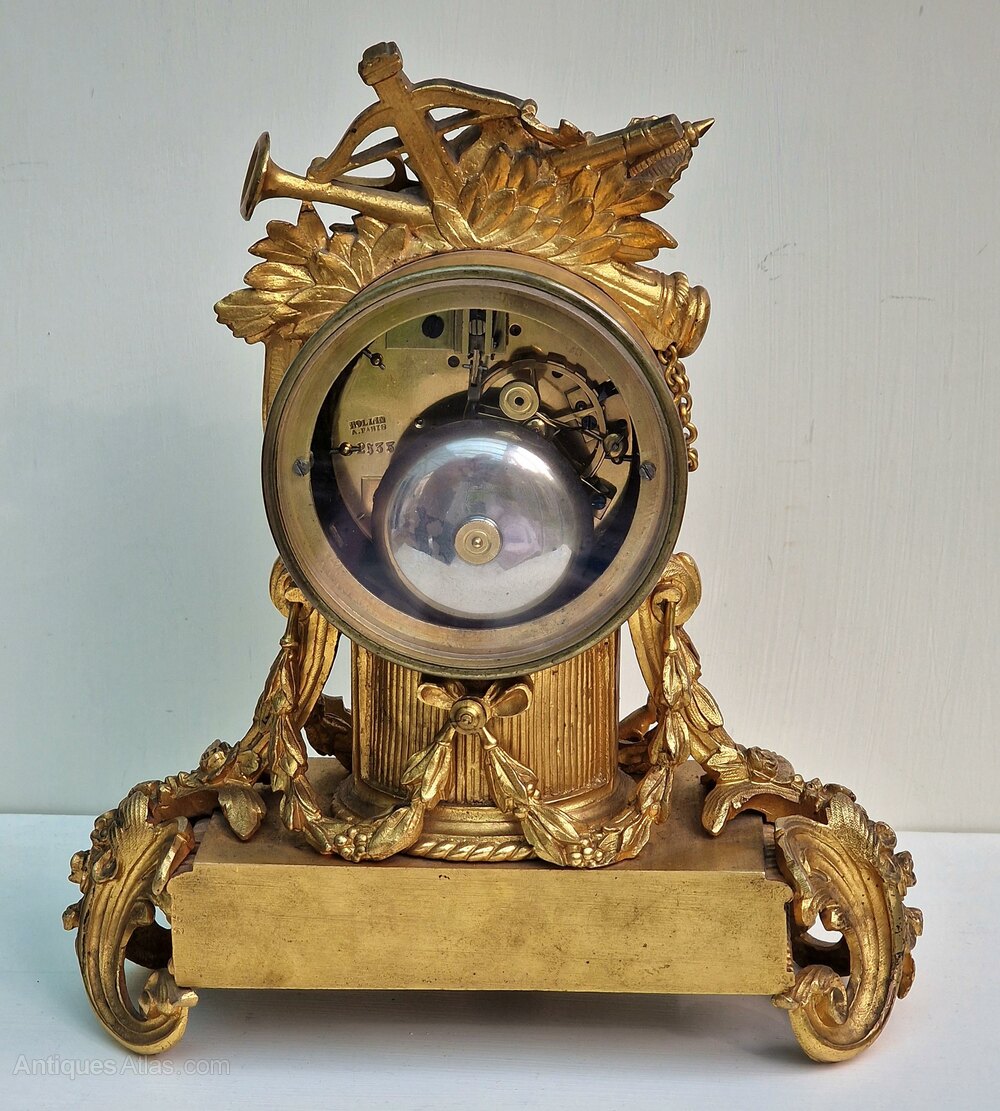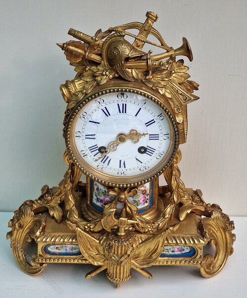 A good quality French mantel clock of smaller proportions. Inset numbered porcelain panels to the gilt bronze case. Musical instruments to the pediment with a military hat. Floral swags to the base of rococo design. An enamel dial with blue Roman numerals and fretted gilt hands.An 8-day duration mechanism striking the 1/2 hours and hours on a bell marked Rollin of Paris. Also marked by the retailer 'Steverard Boulogne-S Mare'. Circa 1885.