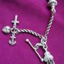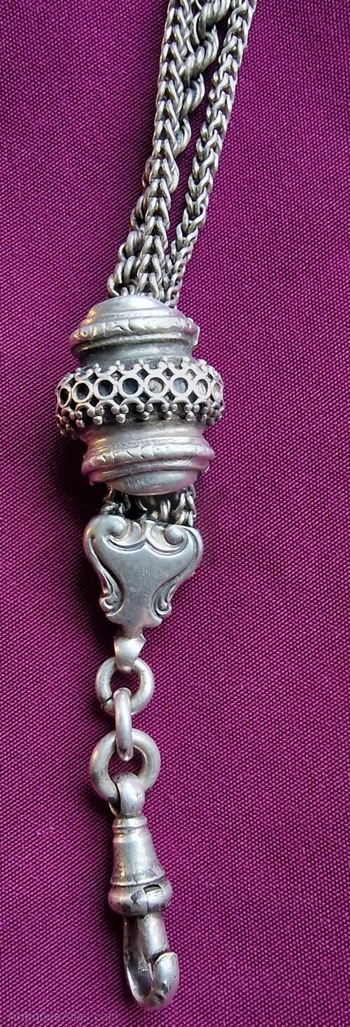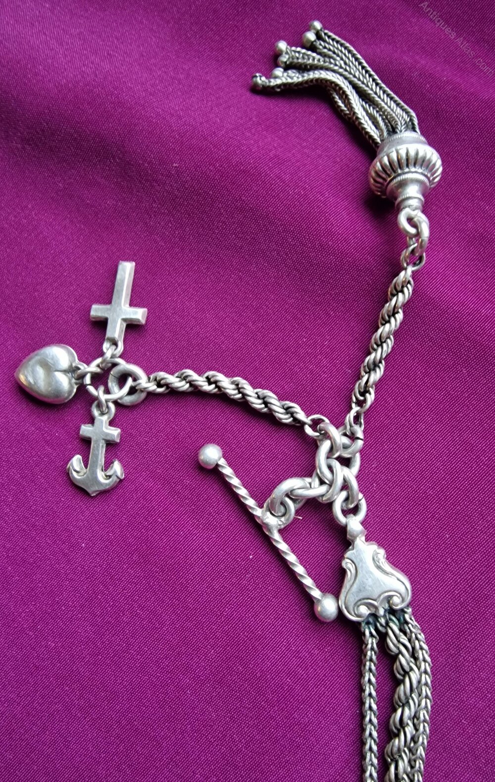 A high quality silver 'Chatelaine' pocket watch chain. A clip and silver strands to one other end. A T-bar with a cross, anchor and heart. Circa 1900.Length 30cms.