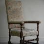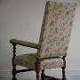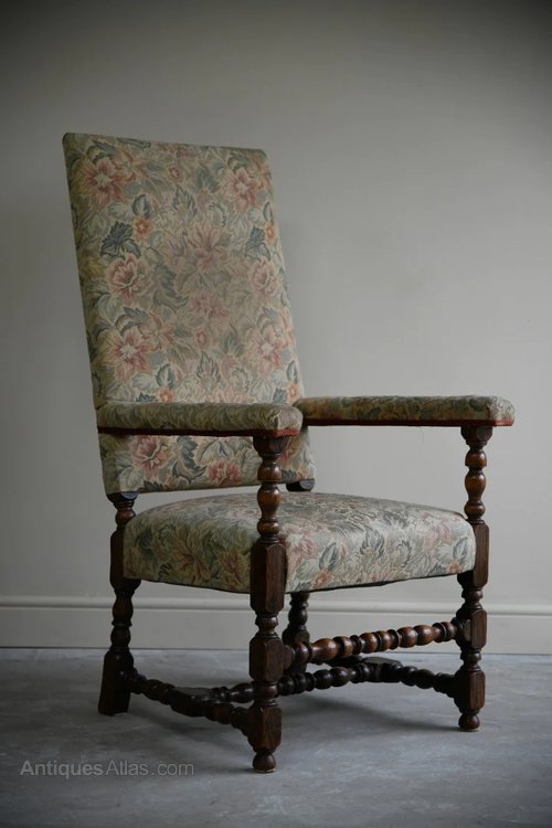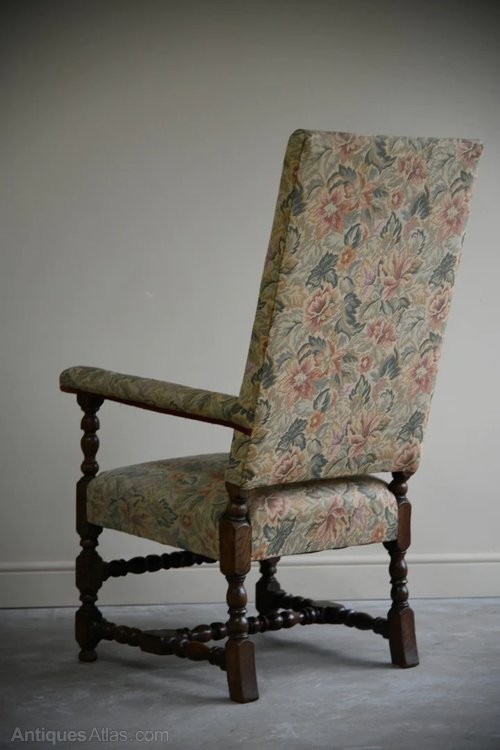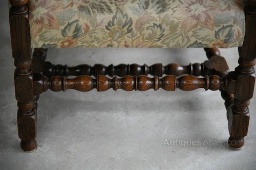 Early 20th Century Upholstered Carver Chair in the 17th Century style, upholstered back and seat with open arms on turned and block oak legs and stretchers.Dimensions: 62cm x 72cm x 42cm seat height x 64cm arm height x 113cm high.