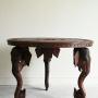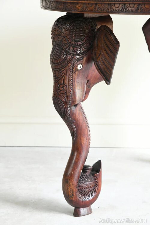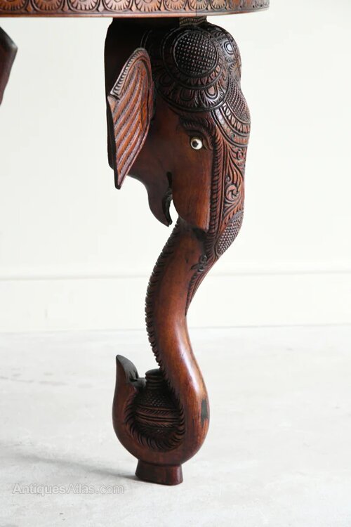 Large Anglo Indian Carved Teak Round Coffee Table. Early 20th Century Anglo Indian coffee table, solid teak round top with carved decoration on three carved elephant head legsDimensions: 91cm diameter x 65cm high