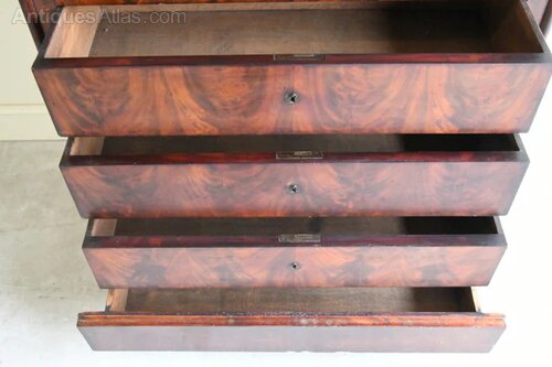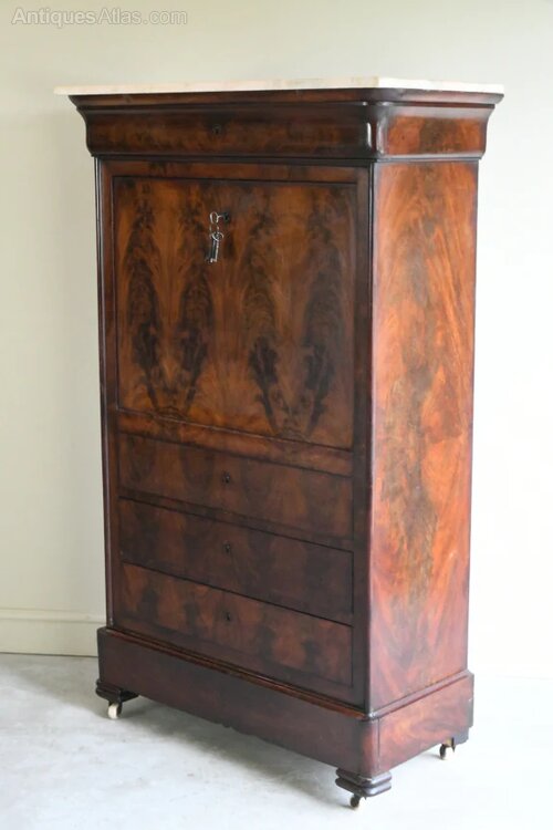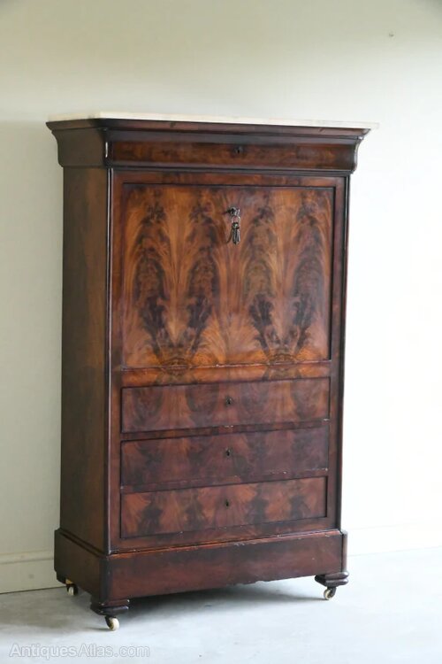 ConditionOverall good solid condition, some general age and few chips and losses to the veneer, later piece of marble to the top, the fall front has dropped from use over the years and is not really suitable for use as a writing desk, general age and losses to the veneer.