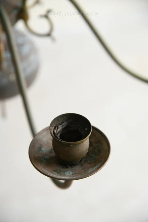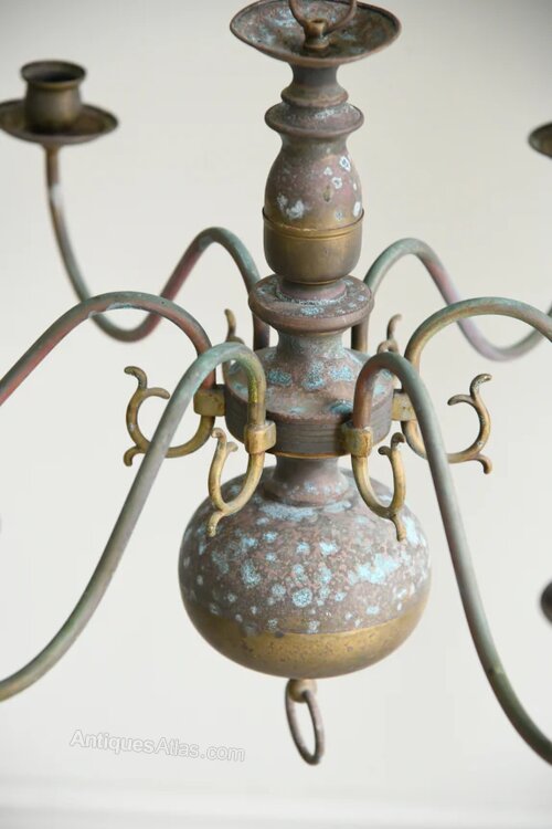 Condition: Age, tarnishing and verdigris, We have given the chandeliers a light brush and clean down but have left the old wax and verdigris.