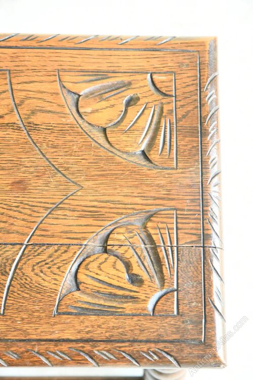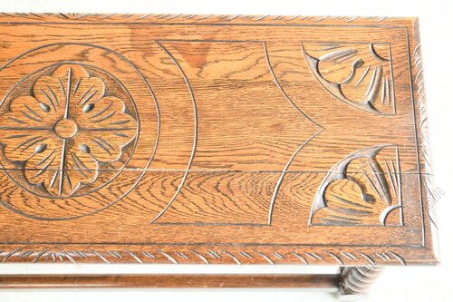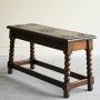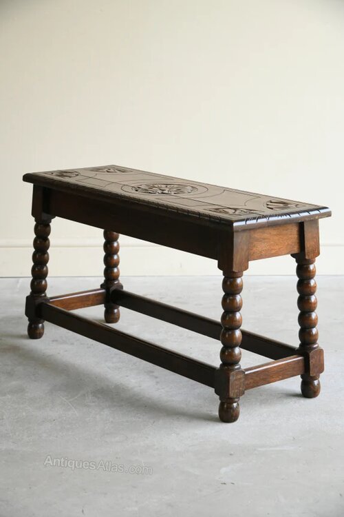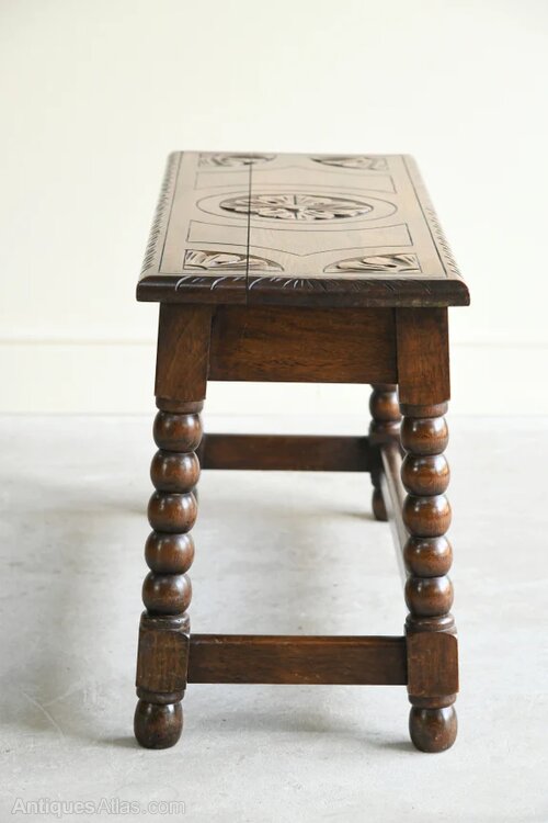 Traditional Style Oak Stool. Early 20th Century long oak stool with carved seat on bobbin turned splayed legs joined by low stretchersDimensions: 76.5cm x 28cm x 42cm high