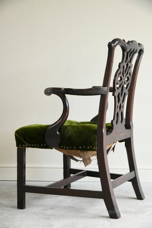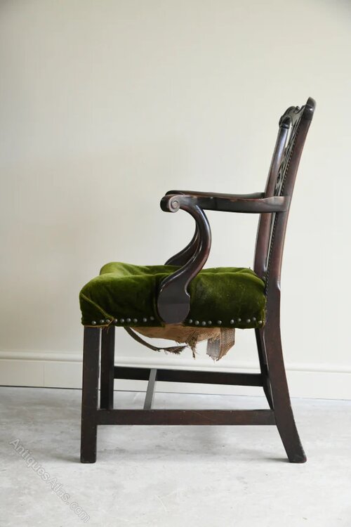 Antique Georgian Mahogany Armchair. Antique George III mahogany armchair for restoration, pierced back splat with pair of open arms, webbed seat on square legsDimensions: 68cm wide x 50cm deep x 46cm seat height x 69cm arm height x 94cm high back