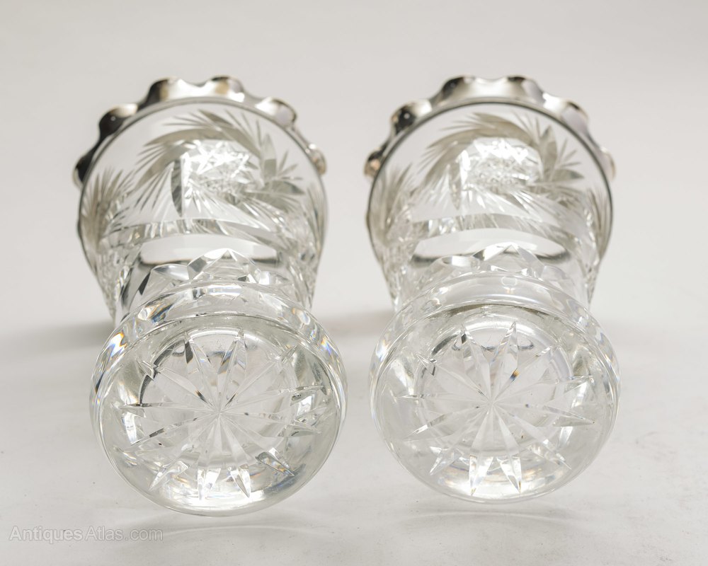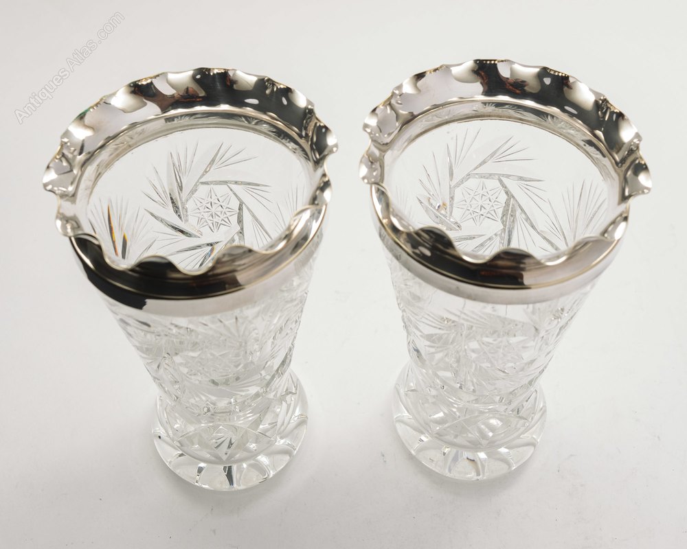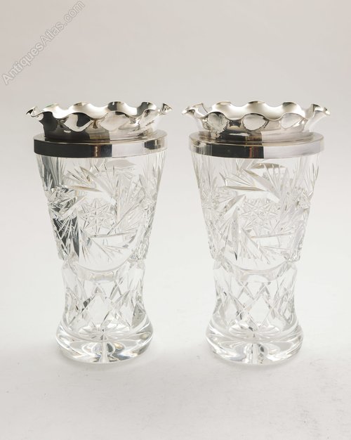 A Lovely Pair Cut Glass Vases with silver plated tops and heavy cut glass body with star cur bases - circa 1920.Unfortunately the photography of this item does not do the vases justice - we can assure you they are in great condition with no cracks or chips to the glass and the dark areas are from the photography.