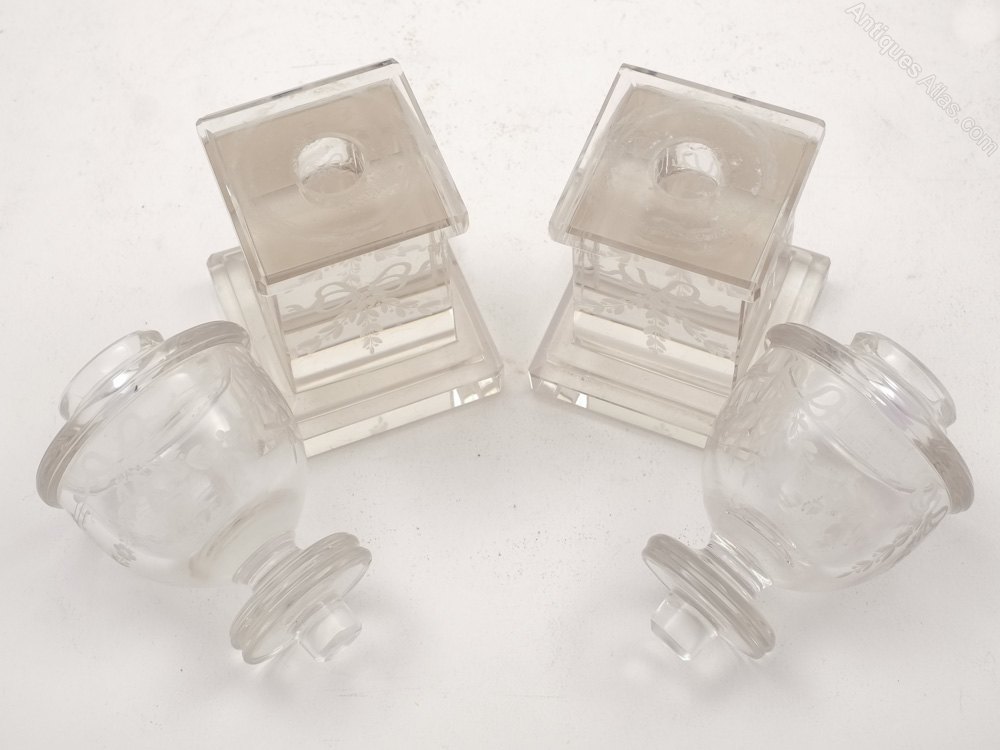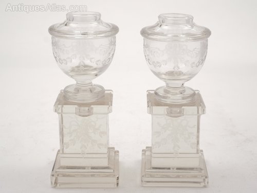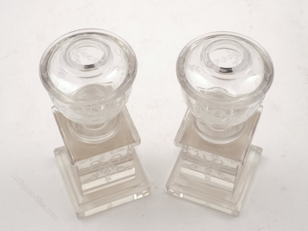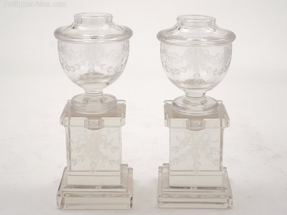 A sweet pair of English Edwardian miniature cut glass urns on stands with etched garland decoration. The base and the urn are separate. Circa 1905.Worldwide, first class, tracked and signed for delivery is included in the price.